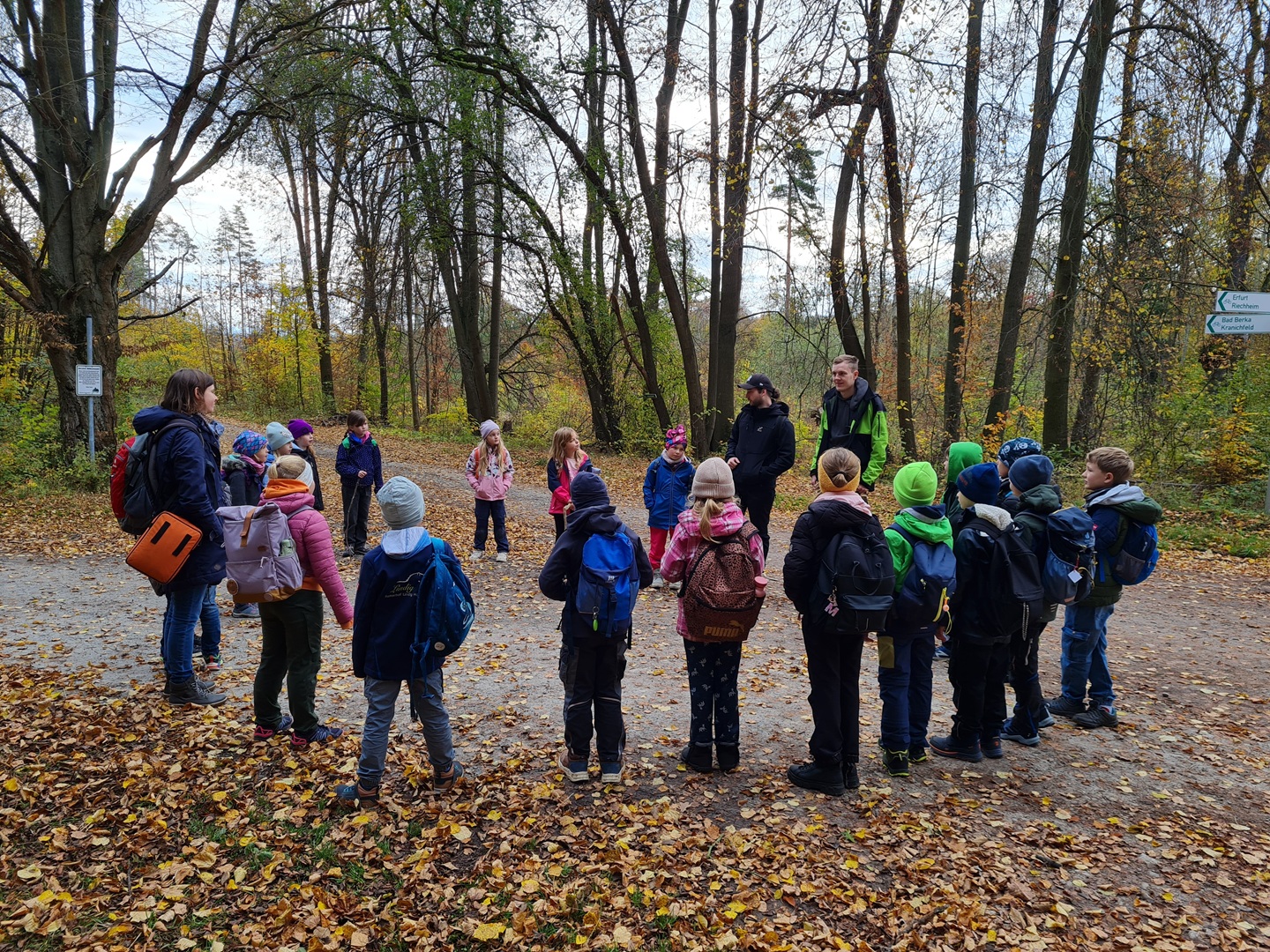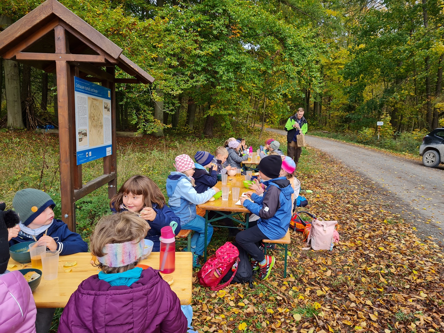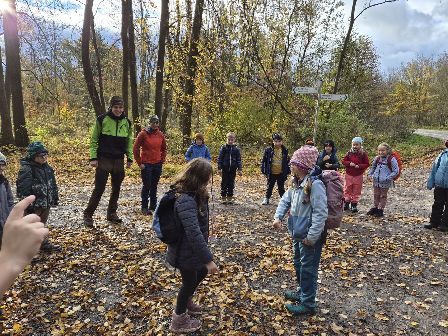 Am Dienstag, den 21.10.2025, und am Mittwoch, den 22.10.2025, machten sich alle Klassen 1 bis 4 der Grundschule auf ihren Wandertag in den Osthäuser Wald. Bei herrlich herbstlichem Wetter – an beiden Tagen zeigte sich sogar die Sonne – liefen wir gemeinsam zum Waldhäuschen. Der Weg dorthin wurde durch kleine Entdeckungen und das Sammeln von Kastanien, Eicheln und anderen Waldfunden kurzweilig und spannend gestaltet.