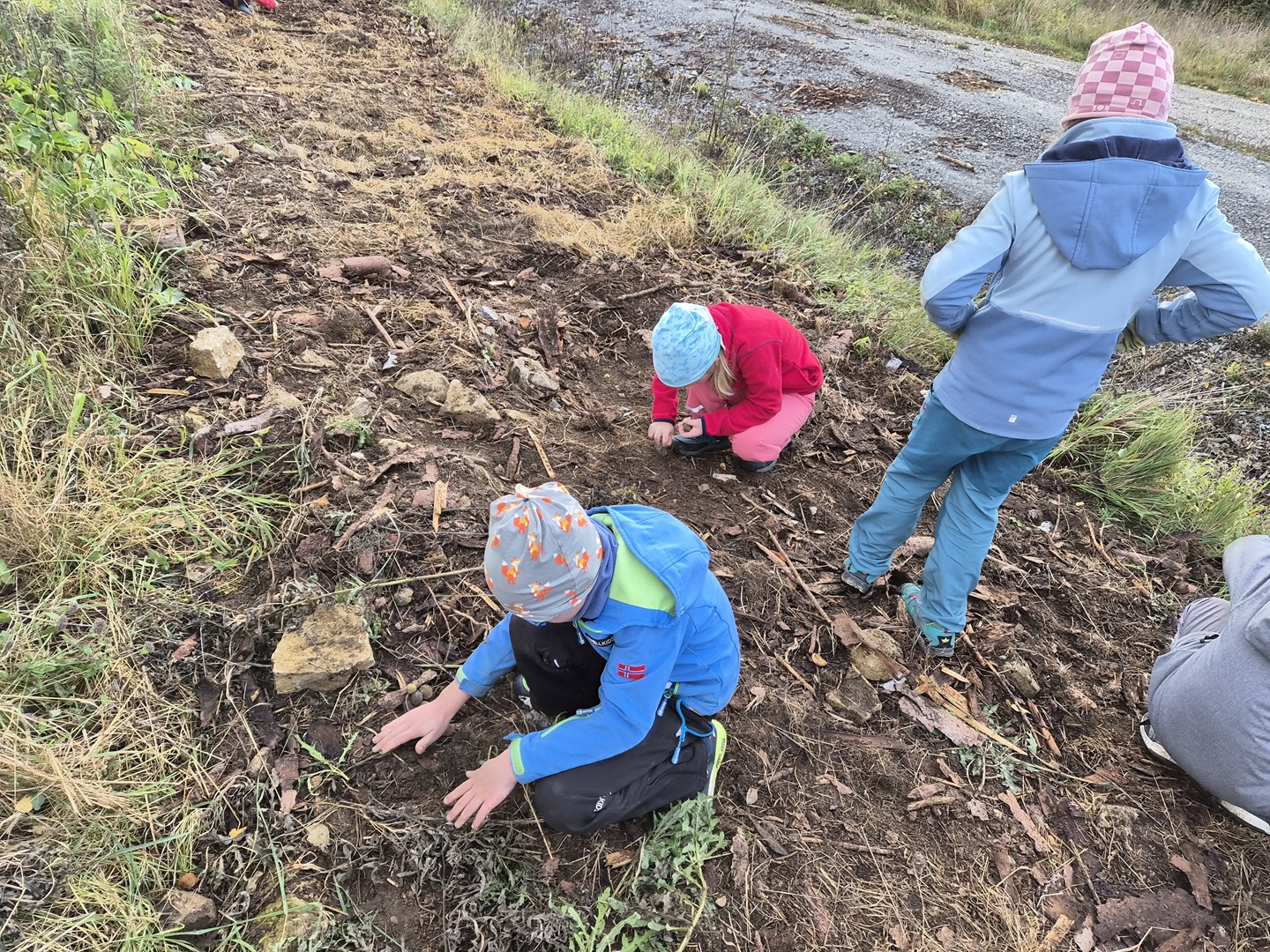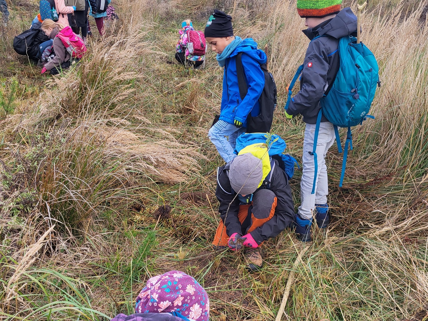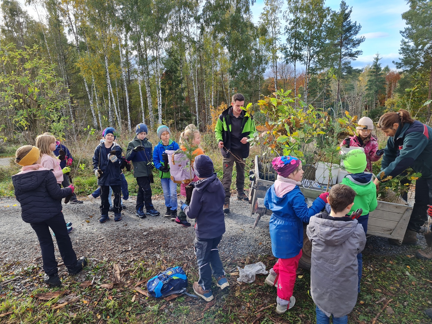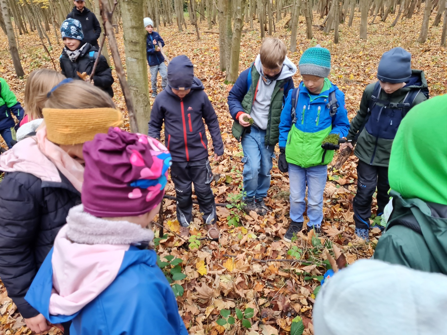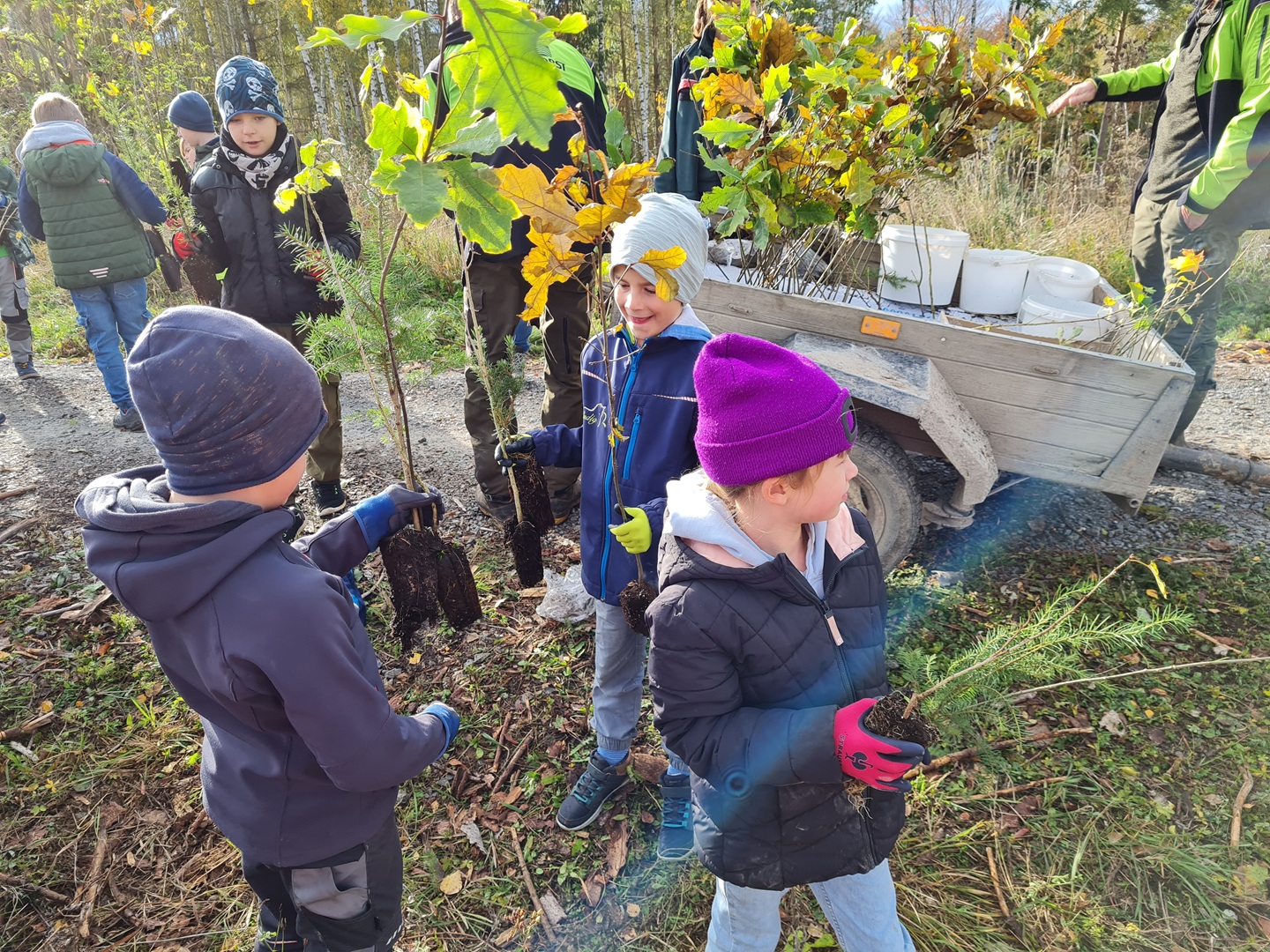 Am zweiten Tag folgten die Dritt- und Viertklässler. Auch sie frühstückten zunächst am Waldhäuschen und nutzten die Zeit für erste kleine Spiele und Erkundungen. Danach übernahmen die Viertklässler die Pflanzaktion: Auf einer vorbereiteten Fläche pflanzte jedes Kind eine Douglasie, eine Baumhasel und eine Eiche. Die Setzlinge mussten fest angedrückt werden, um gut anwachsen zu können. Da die Gruppe sehr schnell arbeitete, blieb noch Zeit, um Früchte des seltenen Speierlings zu sammeln. Die Drittklässler erkundeten währenddessen den Wald auf spielerische Weise. Bei einem Erkundungsauftrag suchten sie gezielt Dinge im Wald – etwa etwas Spitzes, Rotes oder Weiches – und stellten später staunend fest, wie vielfältig die Natur ist. Auch sie spielten das Spiel "Motte und Fledermaus" und sammelte für weitere Pflanzaktionen Esskastanien- Natürlich wurden die Aufgaben anschließend getauscht: Auch die Drittklässler pflanzten kleine Bäumchen, während die Viertklässler kreativ wurden und aus Naturmaterialien Waldtiere gestalteten. Es war spannend zu beobachten, wie unterschiedlich diese Aufgabe bewältigt wurde.