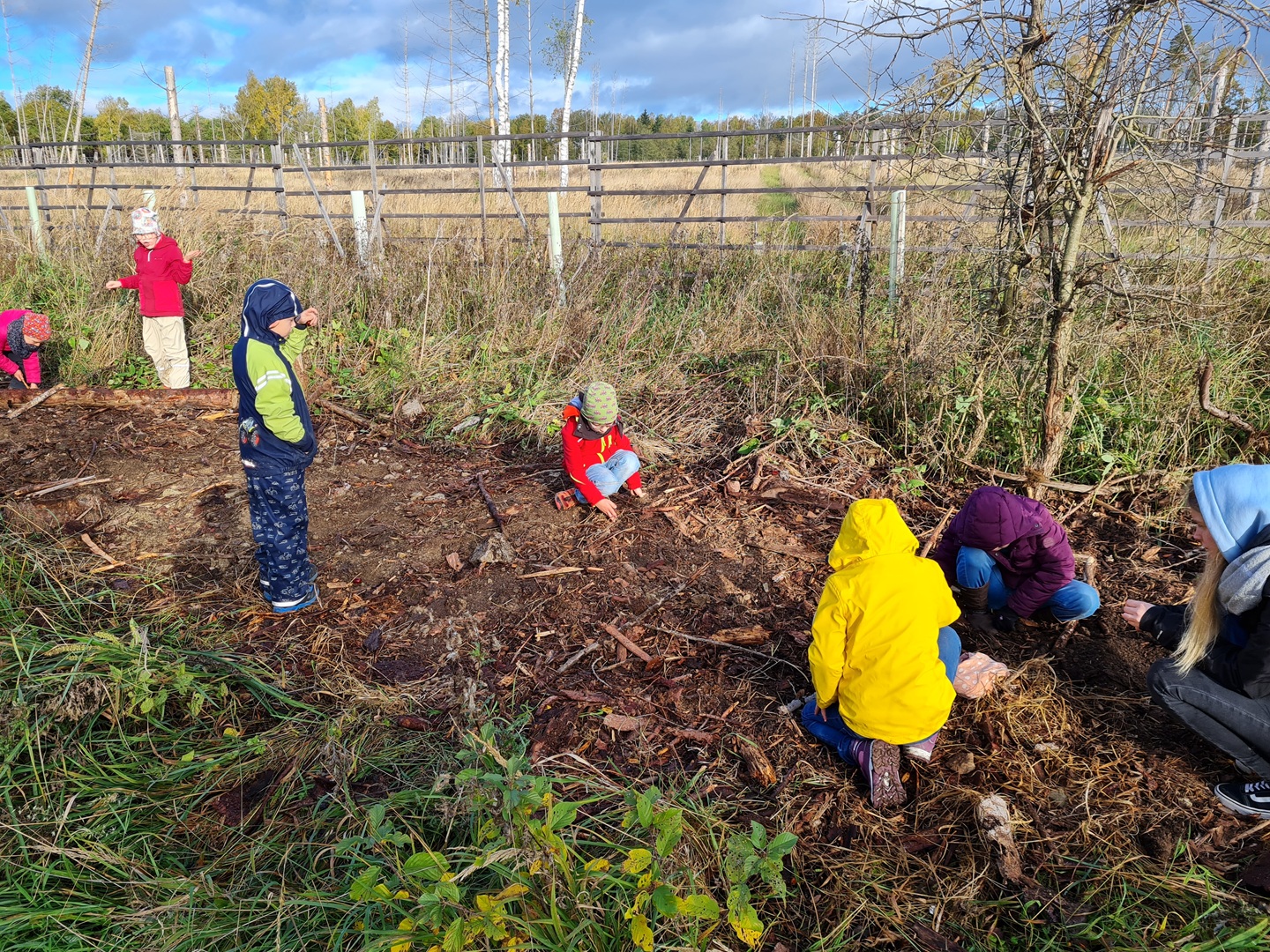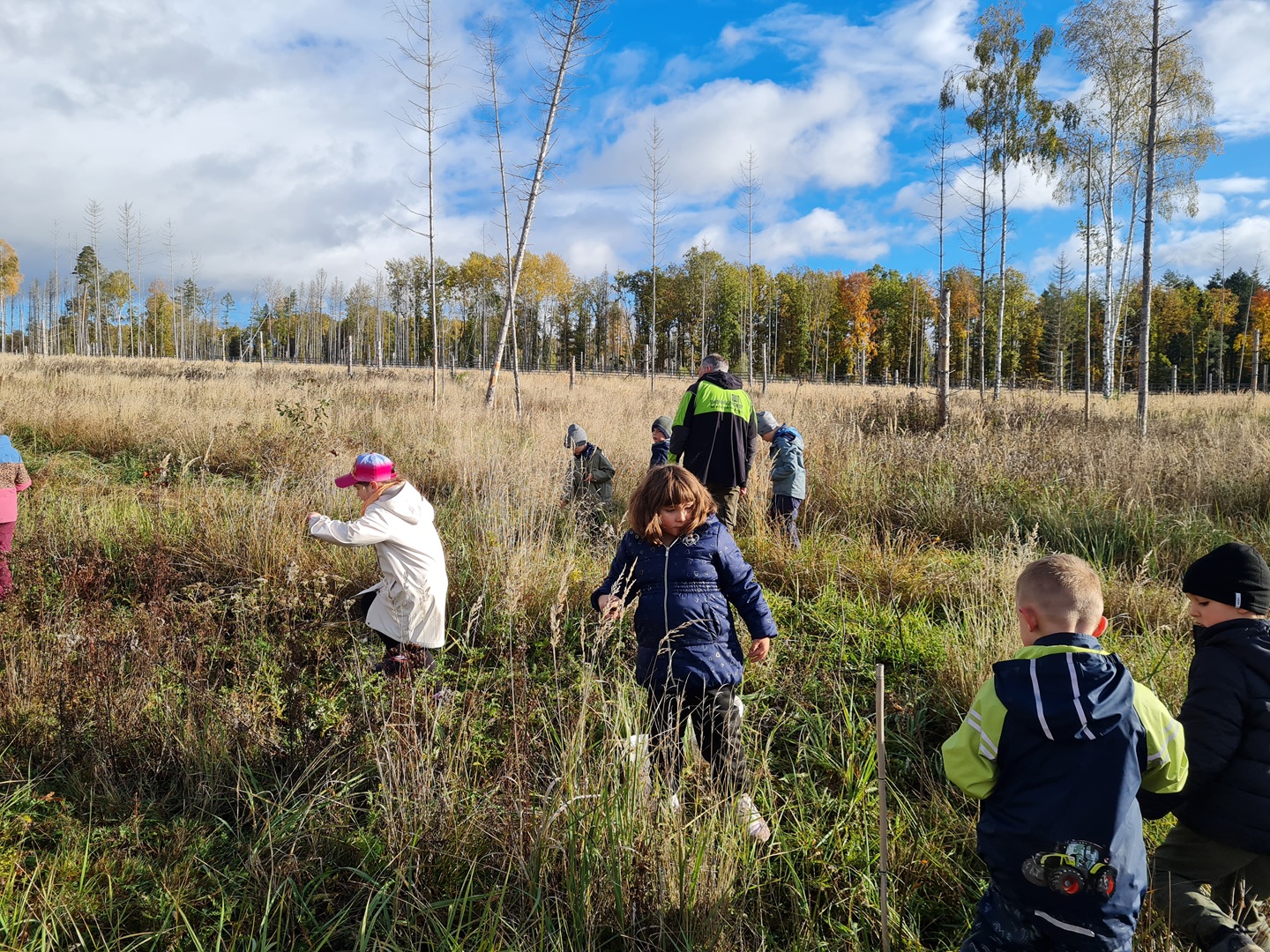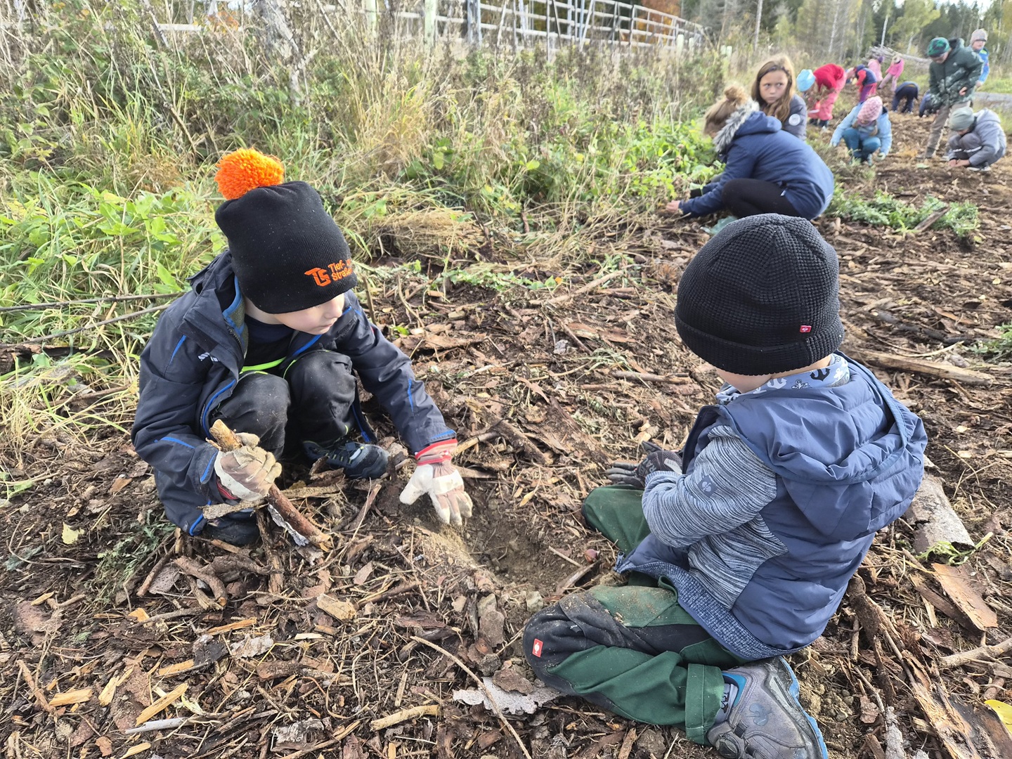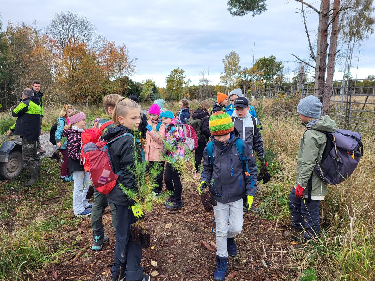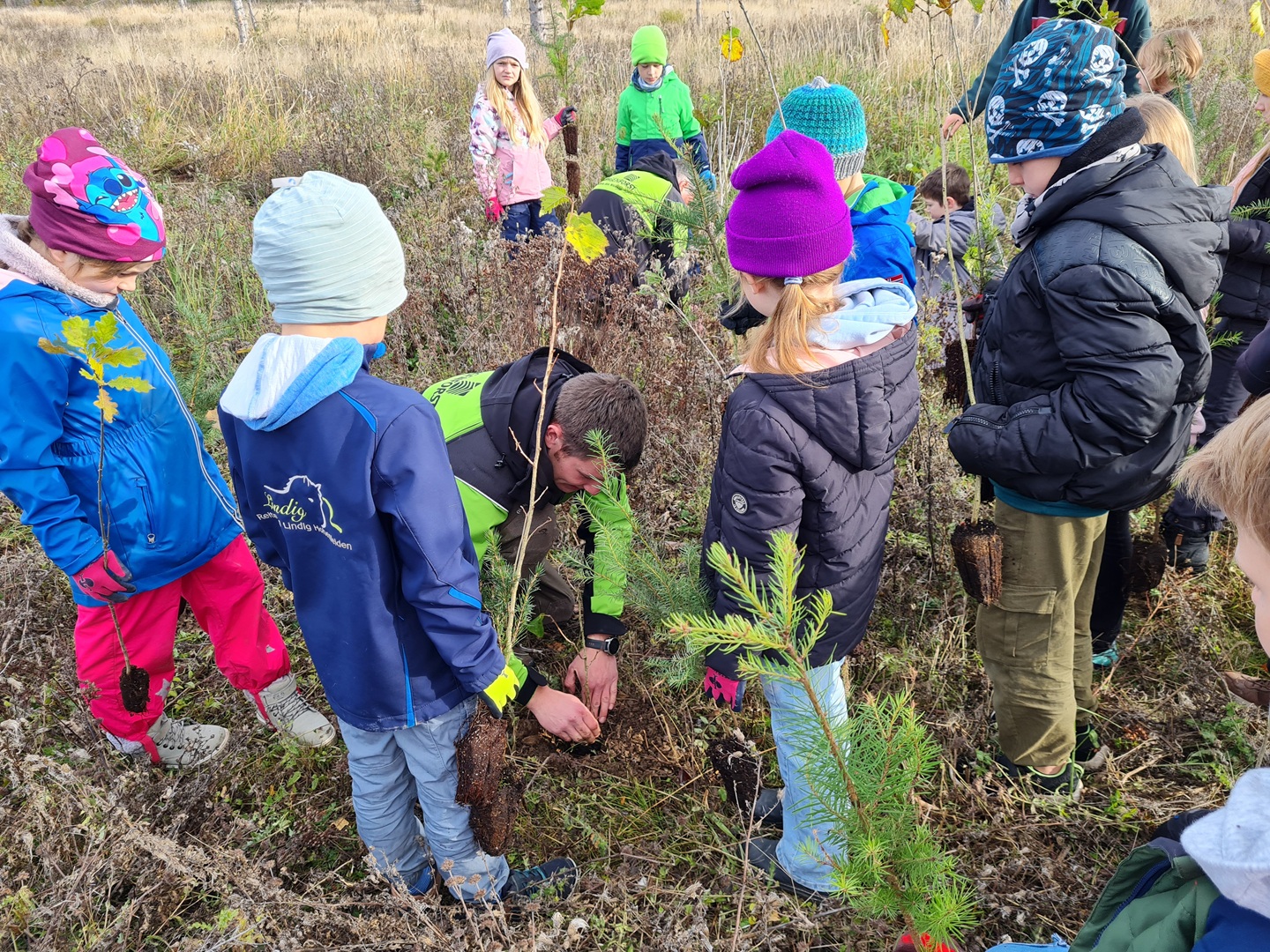 Am zweiten Tag folgten die Dritt- und Viertklässler. Auch sie frühstückten zunächst am Waldhäuschen und nutzten die Zeit für erste kleine Spiele und Erkundungen. Danach übernahmen die Viertklässler die Pflanzaktion: Auf einer vorbereiteten Fläche pflanzte jedes Kind eine Douglasie, eine Baumhasel und eine Eiche. Die Setzlinge mussten fest angedrückt werden, um gut anwachsen zu können. Da die Gruppe sehr schnell arbeitete, blieb noch Zeit, um Früchte des seltenen Speierlings zu sammeln. Die Drittklässler erkundeten währenddessen den Wald auf spielerische Weise. Bei einem Erkundungsauftrag suchten sie gezielt Dinge im Wald – etwa etwas Spitzes, Rotes oder Weiches – und stellten später staunend fest, wie vielfältig die Natur ist. Auch sie spielten das Spiel "Motte und Fledermaus" und sammelte für weitere Pflanzaktionen Esskastanien- Natürlich wurden die Aufgaben anschließend getauscht: Auch die Drittklässler pflanzten kleine Bäumchen, während die Viertklässler kreativ wurden und aus Naturmaterialien Waldtiere gestalteten. Es war spannend zu beobachten, wie unterschiedlich diese Aufgabe bewältigt wurde.