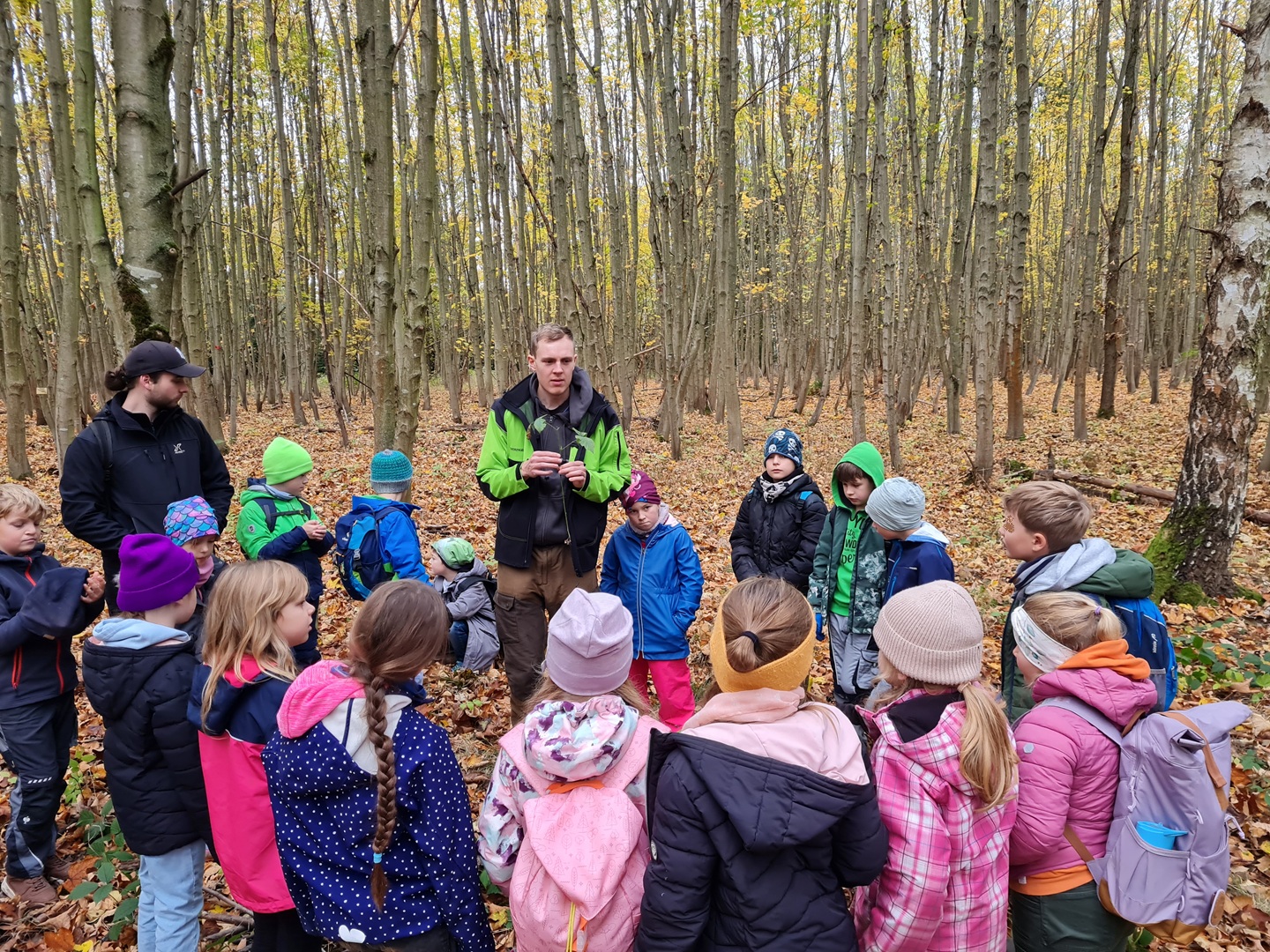 Am ersten Tag starteten die Erst- und Zweitklässler ihr Waldabenteuer. Nach einer Frühstückspause begrüßten uns Mitarbeiter des Thüringen Forst und erklärten, dass wir als „Waldretter“ unterwegs seien. Der Wald rund um Osthausen ist durch Trockenheit und den Borkenkäfer stark geschädigt – wir wollten helfen, ihn wieder aufzuforsten. Mit großem Eifer vergruben die Kinder ihre gesammelten Kastanien, Eicheln und Hickorynüsse im Boden, in der Hoffnung, dass daraus in den nächsten Jahren neue Bäume wachsen. Anschließend standen verschiedene Waldspiele auf dem Programm, etwa „Luchs und Reh“ oder „Motte und Fledermaus“. Dabei war besonders Ruhe und gutes Gehör gefragt – was für viel Spaß sorgte.