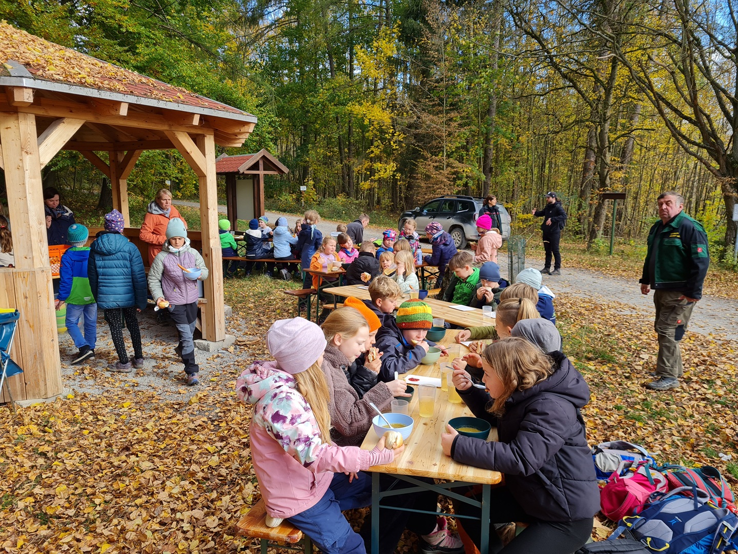 Nach den erfolgreichen Pflanz- und Spielaktionen wartete an beiden Tagen ein leckeres Mittagessen im Wald auf alle Kinder. Es gab Erbsensuppe mit Wiener und Brötchen – ein herzliches Dankeschön an die fleißigen Eltern, die das Essen vorbereitet und ausgegeben haben! Zum Abschluss erhielt jedes Kind als Anerkennung für seinen Einsatz eine „Waldretter-Medaille“. Frisch gestärkt traten alle den Heimweg zur Schule an – mit vielen Eindrücken und dem guten Gefühl, etwas für den Wald getan zu haben.