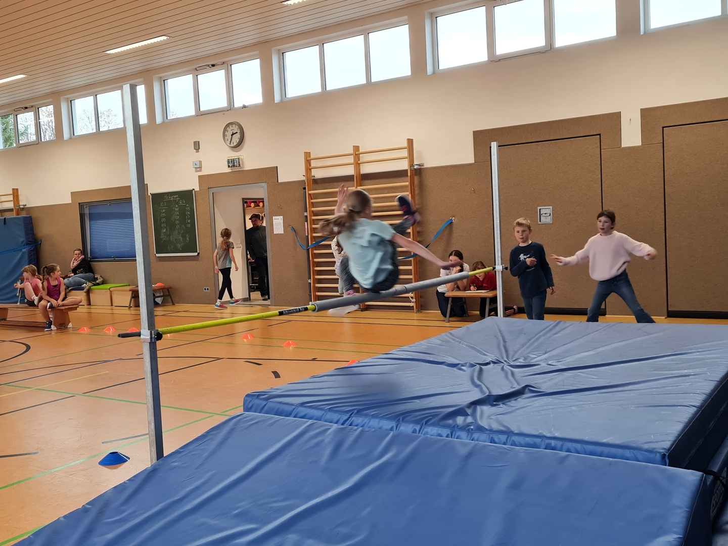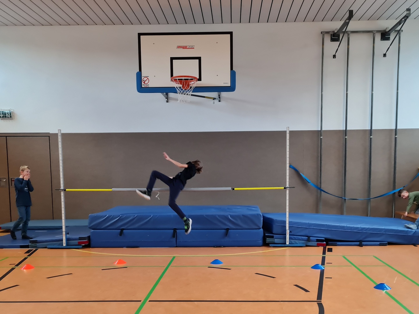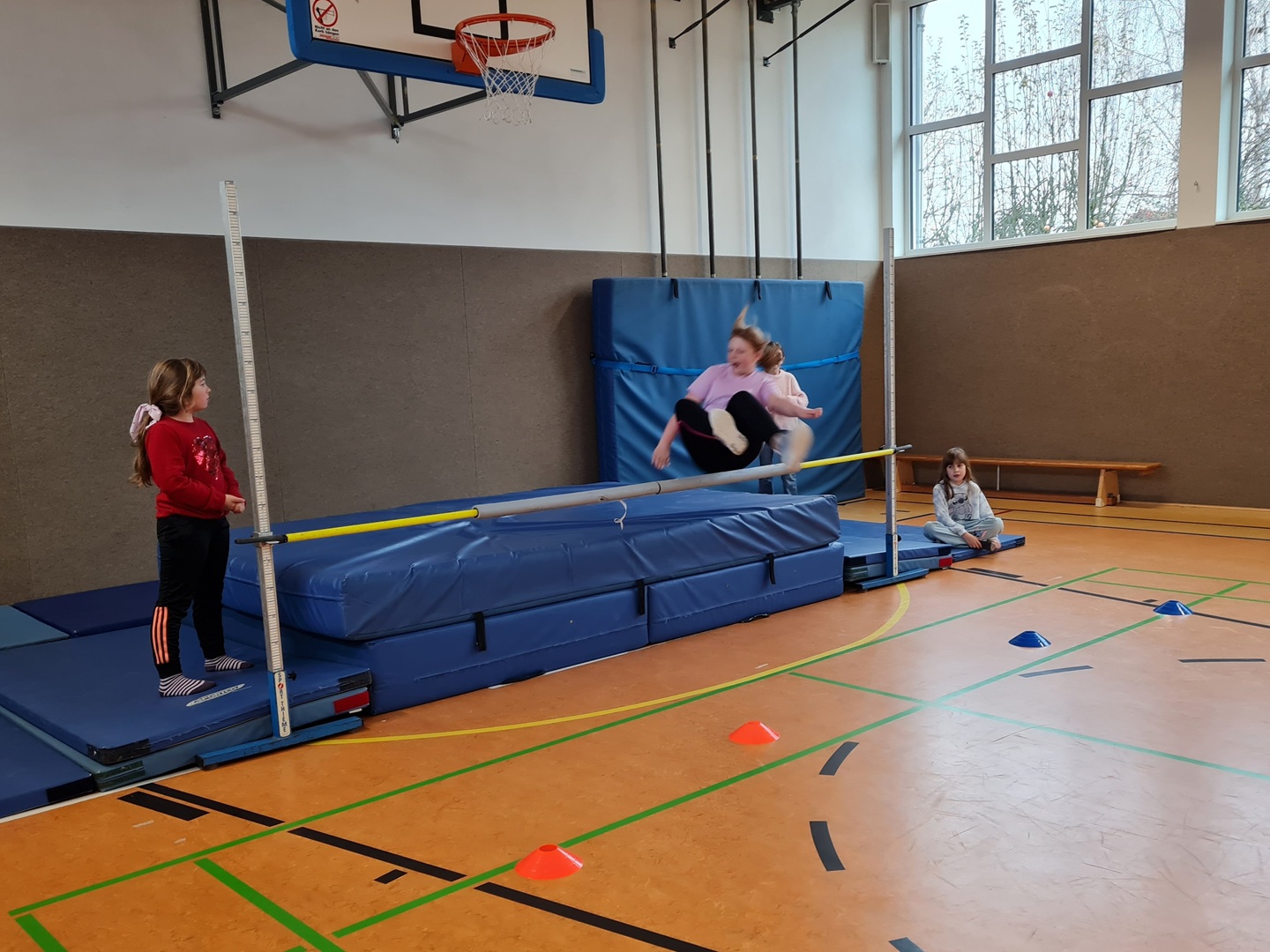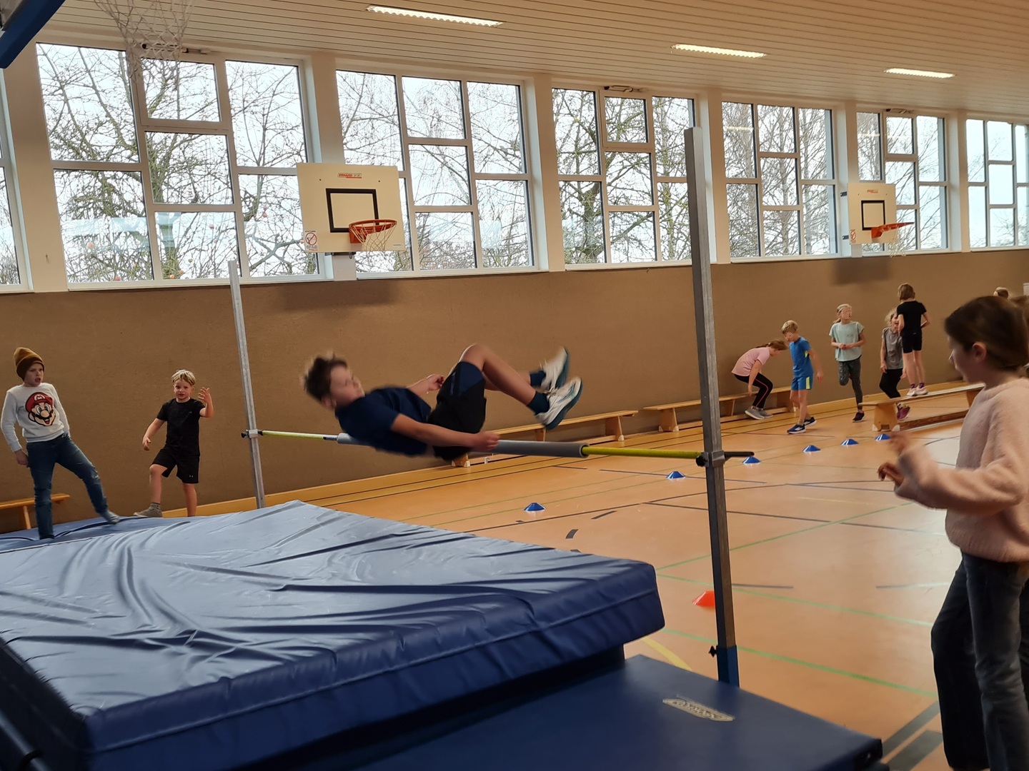 Am Dienstag, 18.11.2025 fand die Schulmeisterschaft im Hochsprung statt. In den letzten Wochen wurde dafür im Unterricht geübt. Insgesamt nahmen 38 Schülerinnen und Schüler aus den Klassen 1 bis 4 teil. Die Teilnahme an diesem Wettbewerb war freiwillig. Der Wettkampf verlief spannend und war von einer positiven, motivierenden Atmosphäre geprägt. Die Schülerinnen und Schüler zeigten Fairness, gegenseitige Unterstützung und sportlichen Ehrgeiz. Mehrere Teilnehmende stellten persönliche Bestleistungen auf. Die Leistungskurve variiert je nach Klasse und individuellem Training, doch der Gesamteindruck war von fortschrittlicher Technik, guter Koordination und zunehmender Sprungkraft geprägt.