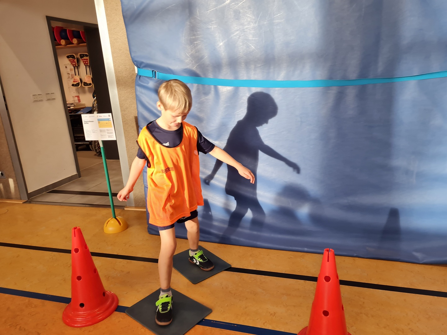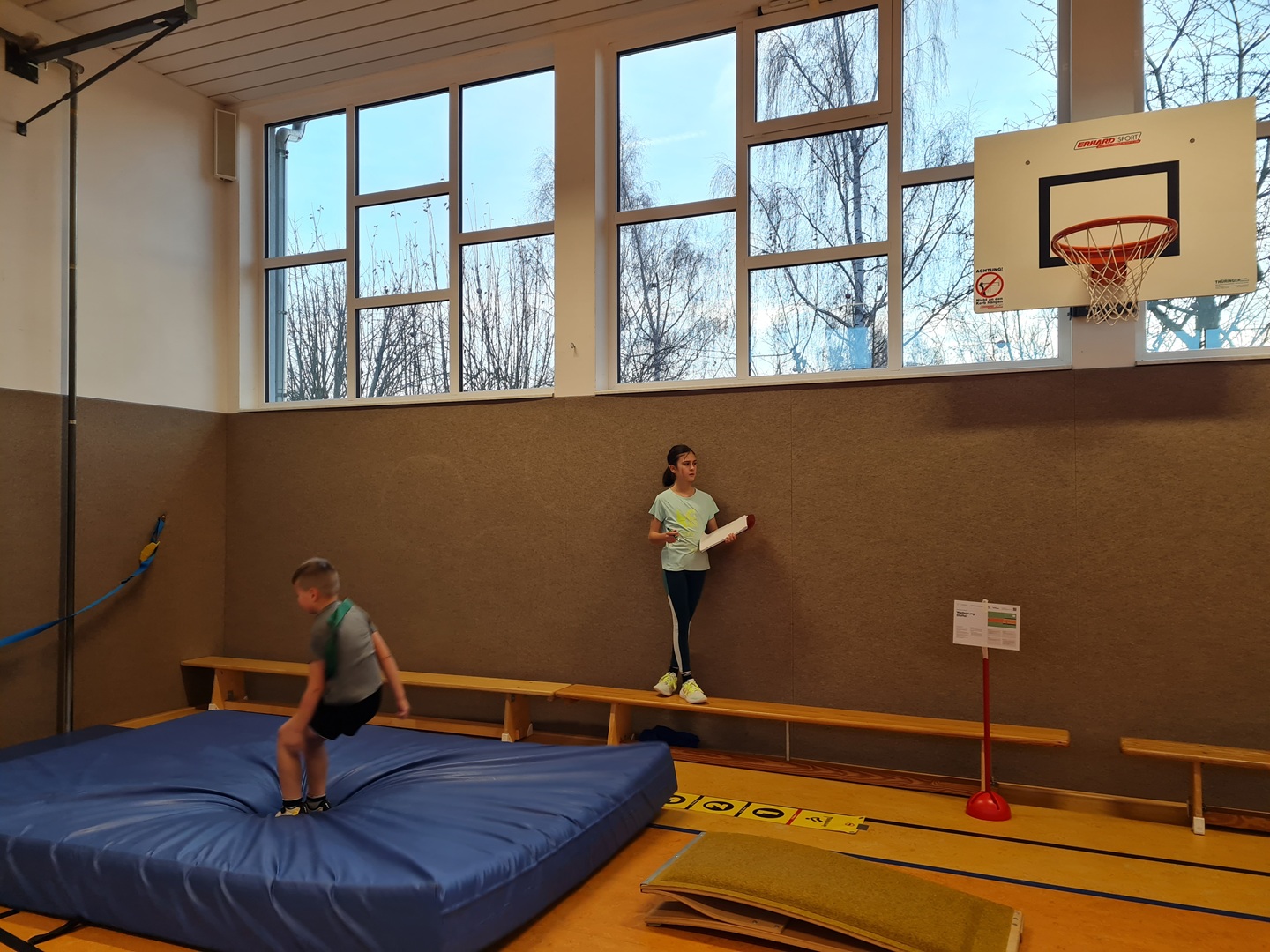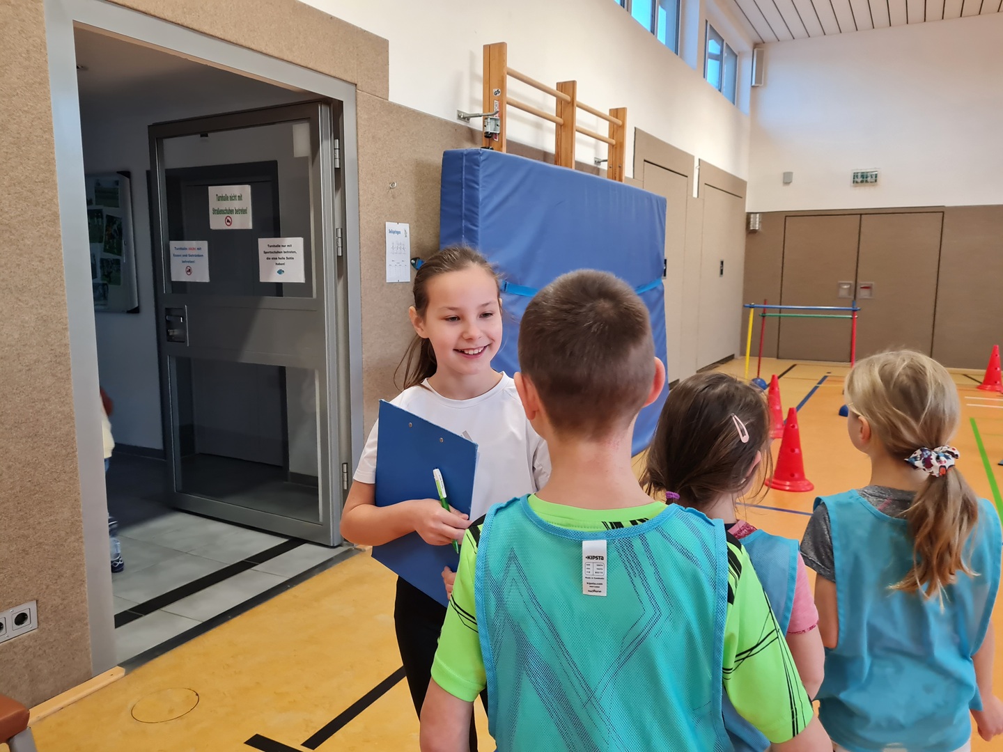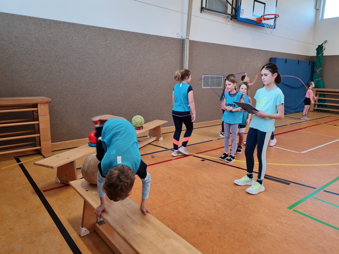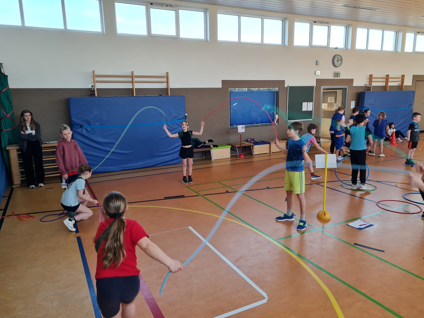 An insgesamt fünf Stationen standen Teamfähigkeit und Gemeinschaftsgefühl im Mittelpunkt. Die Kinder konnten sich an den Stationen Hockwenden, Seil-Schwingen, Weitsprung-Staffel, Teppichfliesen-Staffel und dem Luftballon-Spiel ausprobieren. Jeder Schüler sammelte entsprechend seiner individuellen Möglichkeiten und Fähigkeiten Punkte für sein Team, sodass die Übungen passend und motivierend ausgewählt waren. Es stand heute der Spaß an der Bewegung im Vordergrund.