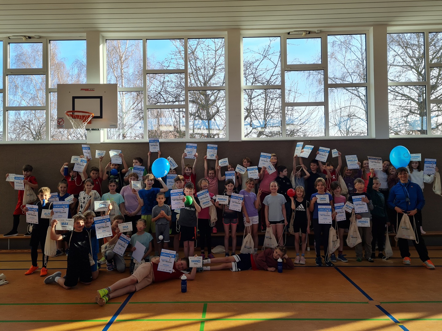 Durch die Anmeldung im Rahmen des „European School Sport Day“ erhielt jedes teilnehmende Kind eine Startnummer. Nach dem Wettbewerb wurden alle Schülerinnen und Schüler mit einer Urkunde mit ihrem Namen, einem Stoffbeutel sowie einer Trinkflasche belohnt, worüber sie sich sehr freuten.