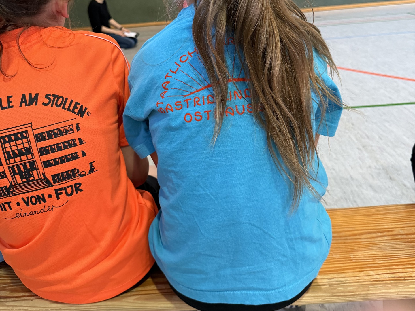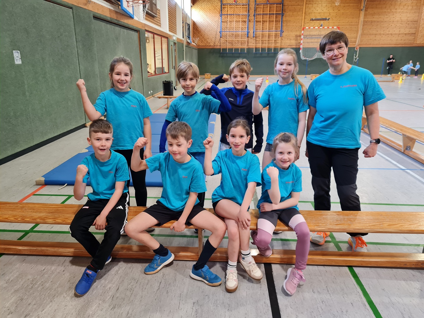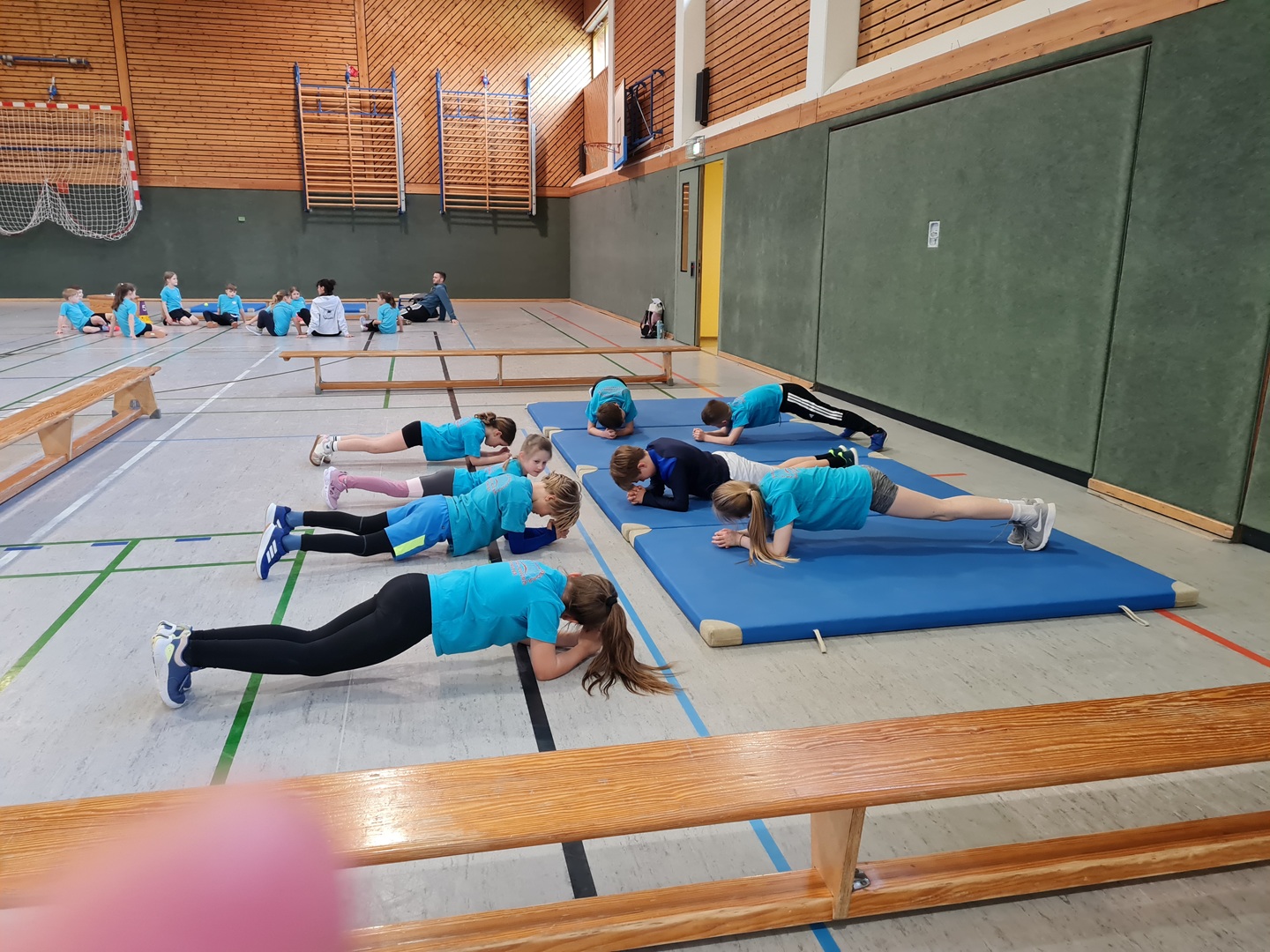 Mit Bus und Zug ging es nach Plaue. Dort angekommen staunten die Kinder zunächst über die große Turnhalle. Da wir zu den ersten Schulen vor Ort gehörten, nutzten unsere acht Sportlerinnen und Sportler die Zeit, um sich gemeinsam aufzuwärmen und die Übungen noch einmal durchzugehen.