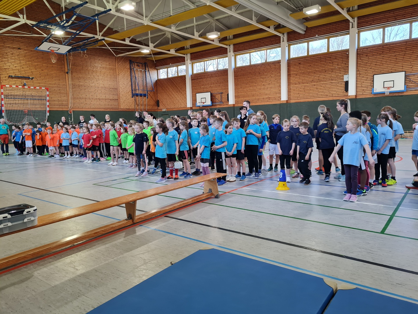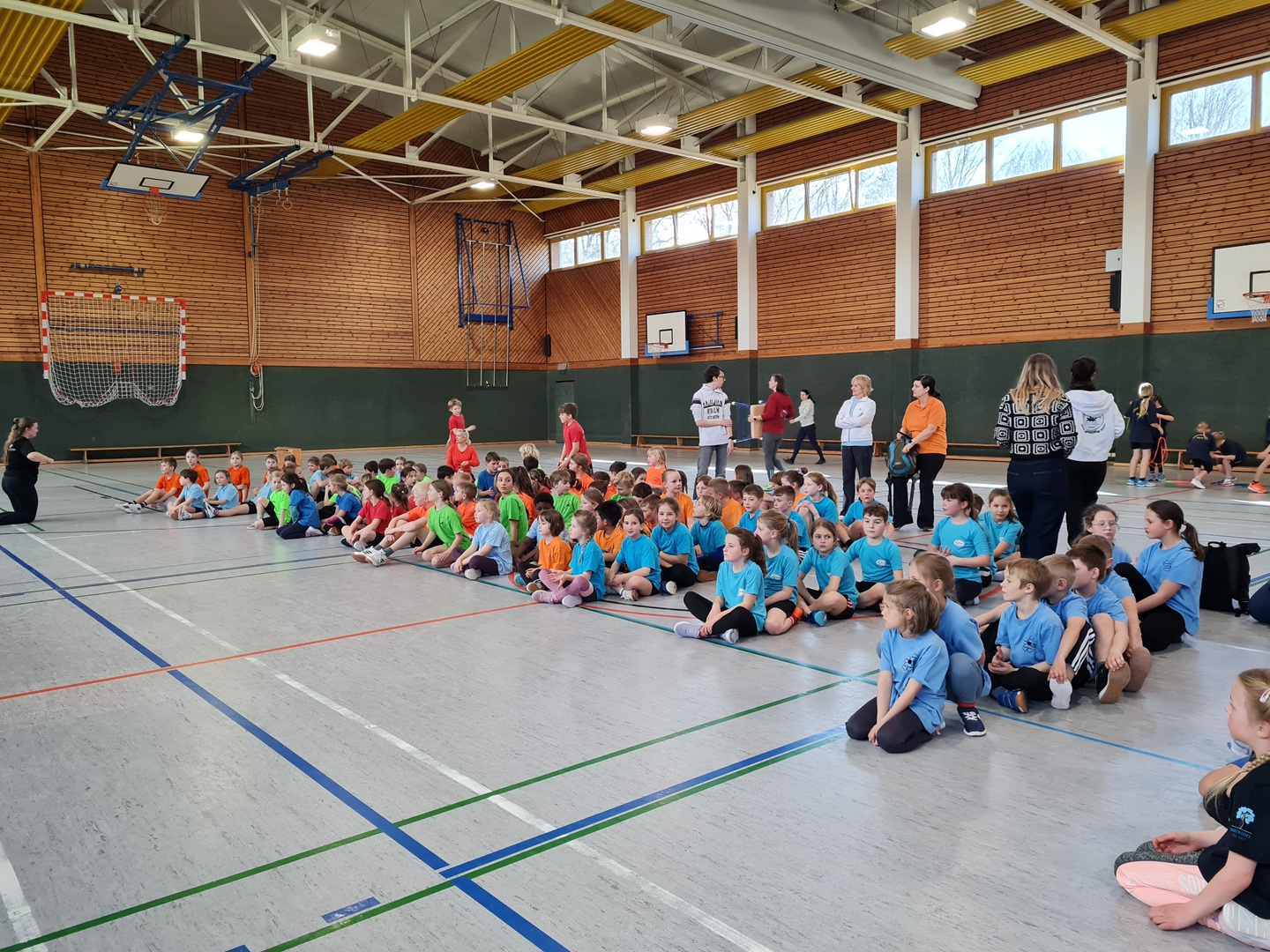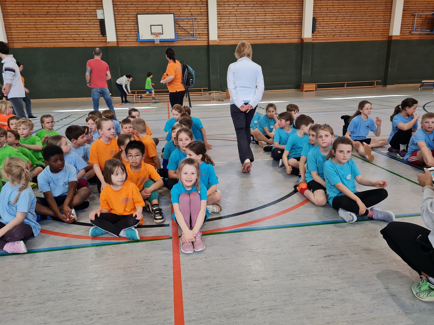 Insgesamt nahmen 14 Grundschulen am Wettbewerb teil. Vor dem Start versammelten sich alle Schulen in der Mitte der Turnhalle und lauschten aufmerksam den kurzen Anweisungen – in der großen Halle herrschte dabei beeindruckende Ruhe.