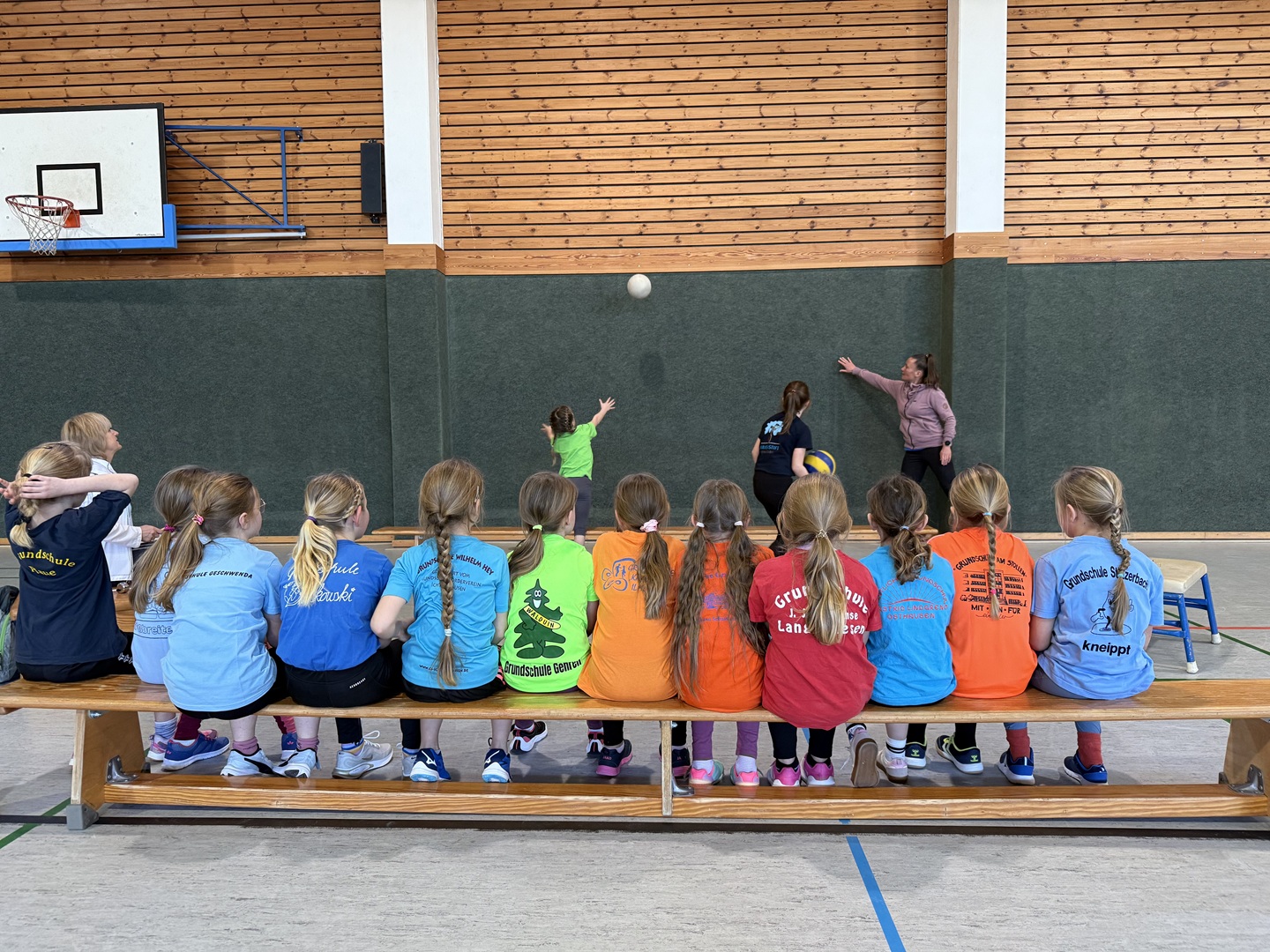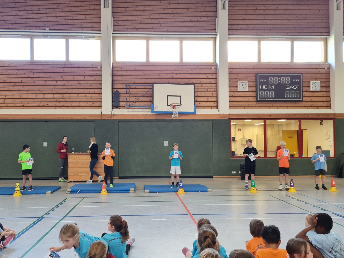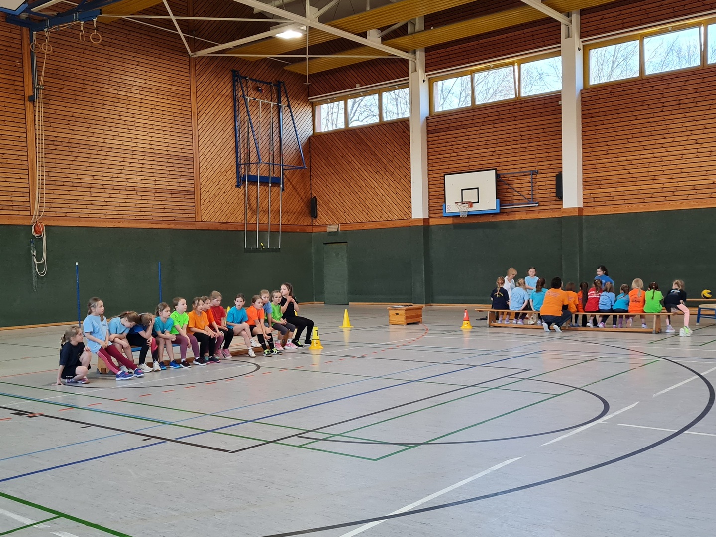 Insgesamt nahmen 14 Grundschulen am Wettbewerb teil. Vor dem Start versammelten sich alle Schulen in der Mitte der Turnhalle und lauschten aufmerksam den kurzen Anweisungen – in der großen Halle herrschte dabei beeindruckende Ruhe.