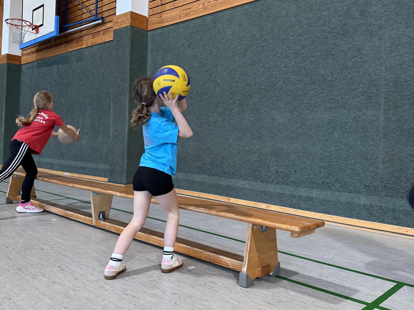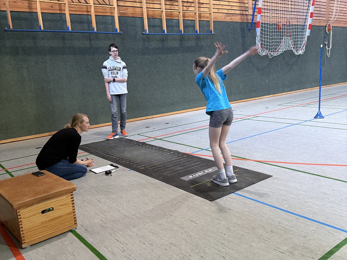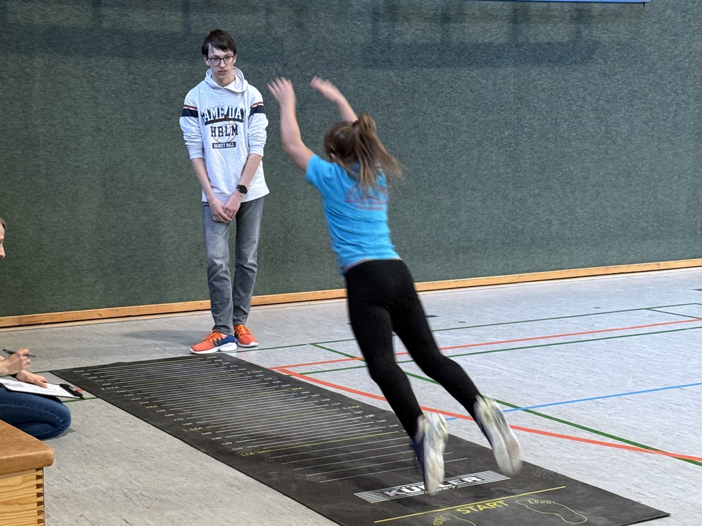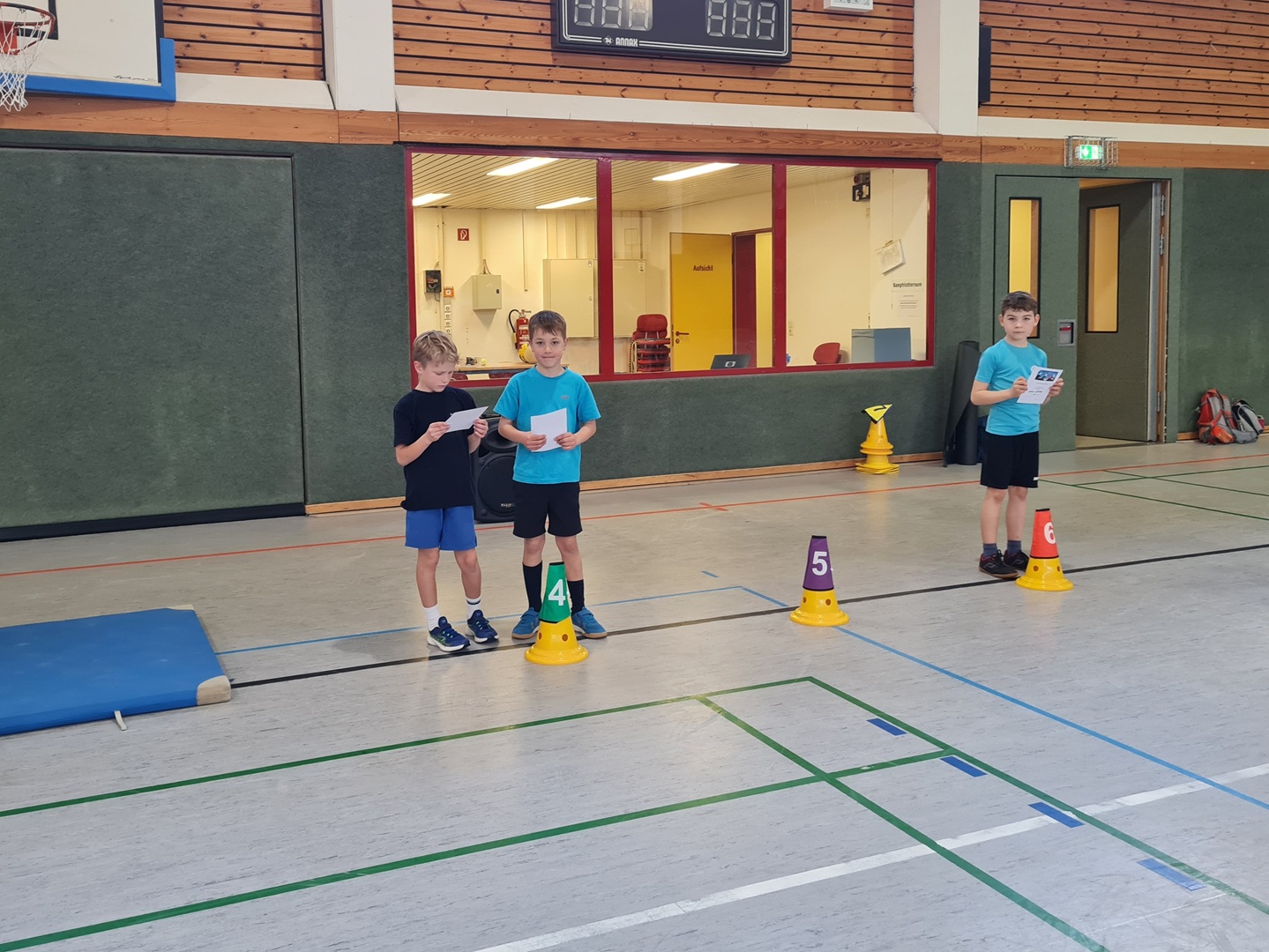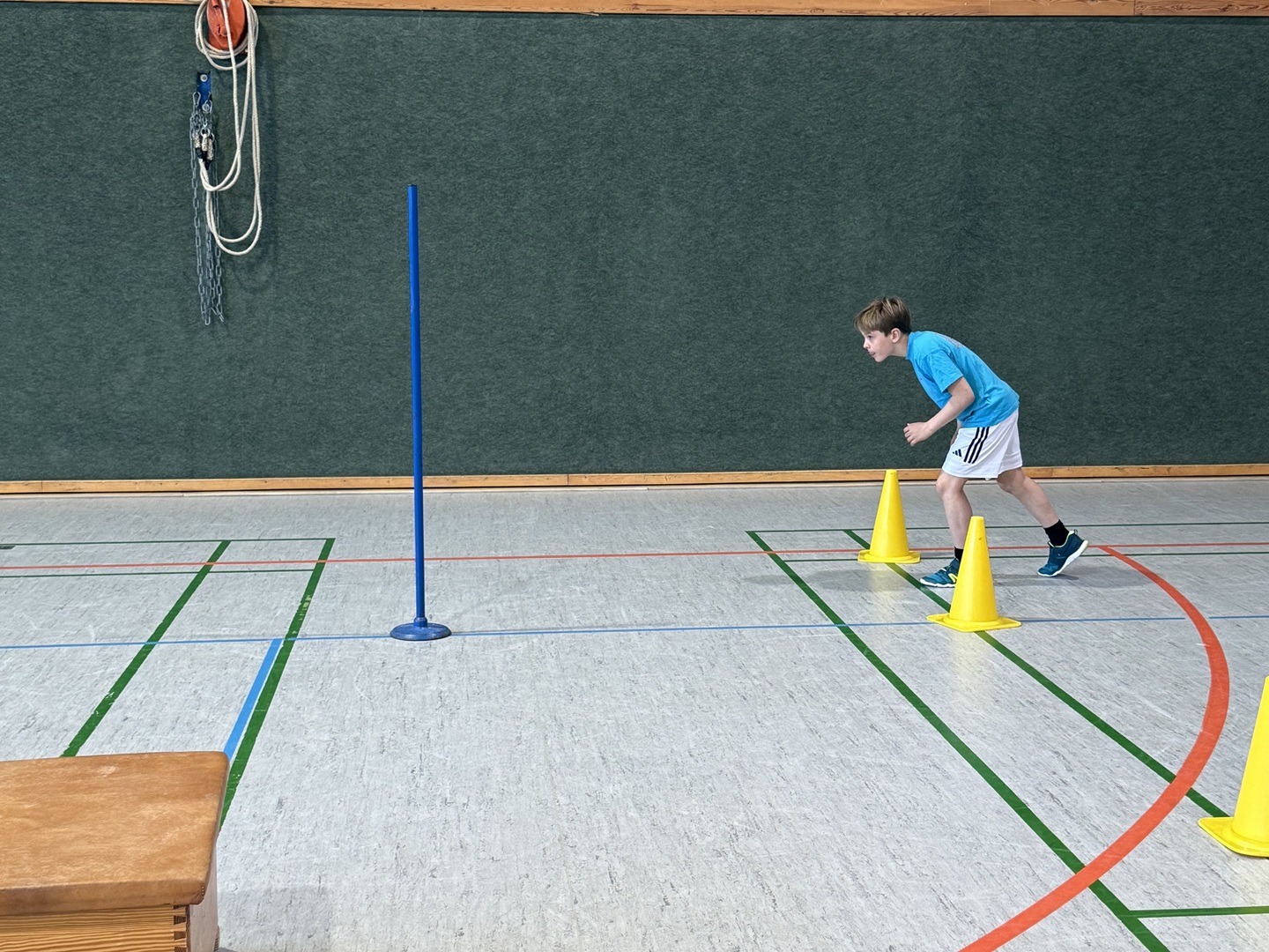 Der Wettkampf begann anschließend klassenstufenweise: Immer alle Mädchen beziehungsweise Jungen einer Klassenstufe traten gleichzeitig an den Stationen an, sodass man seine Konkurrentinnen und Konkurrenten gut beobachten konnte. Die Stationen waren bereits aus dem Schulwettbewerb bekannt: