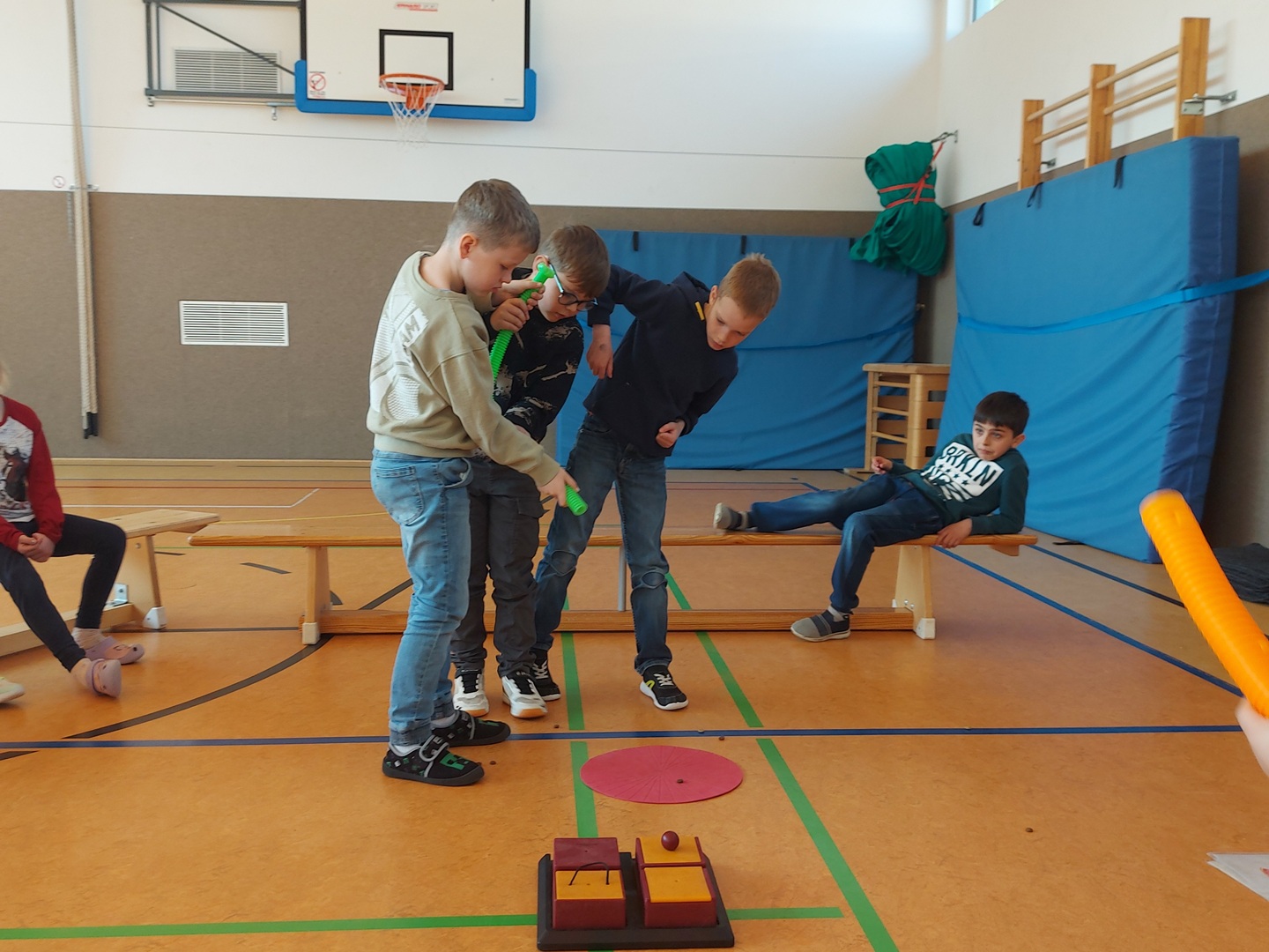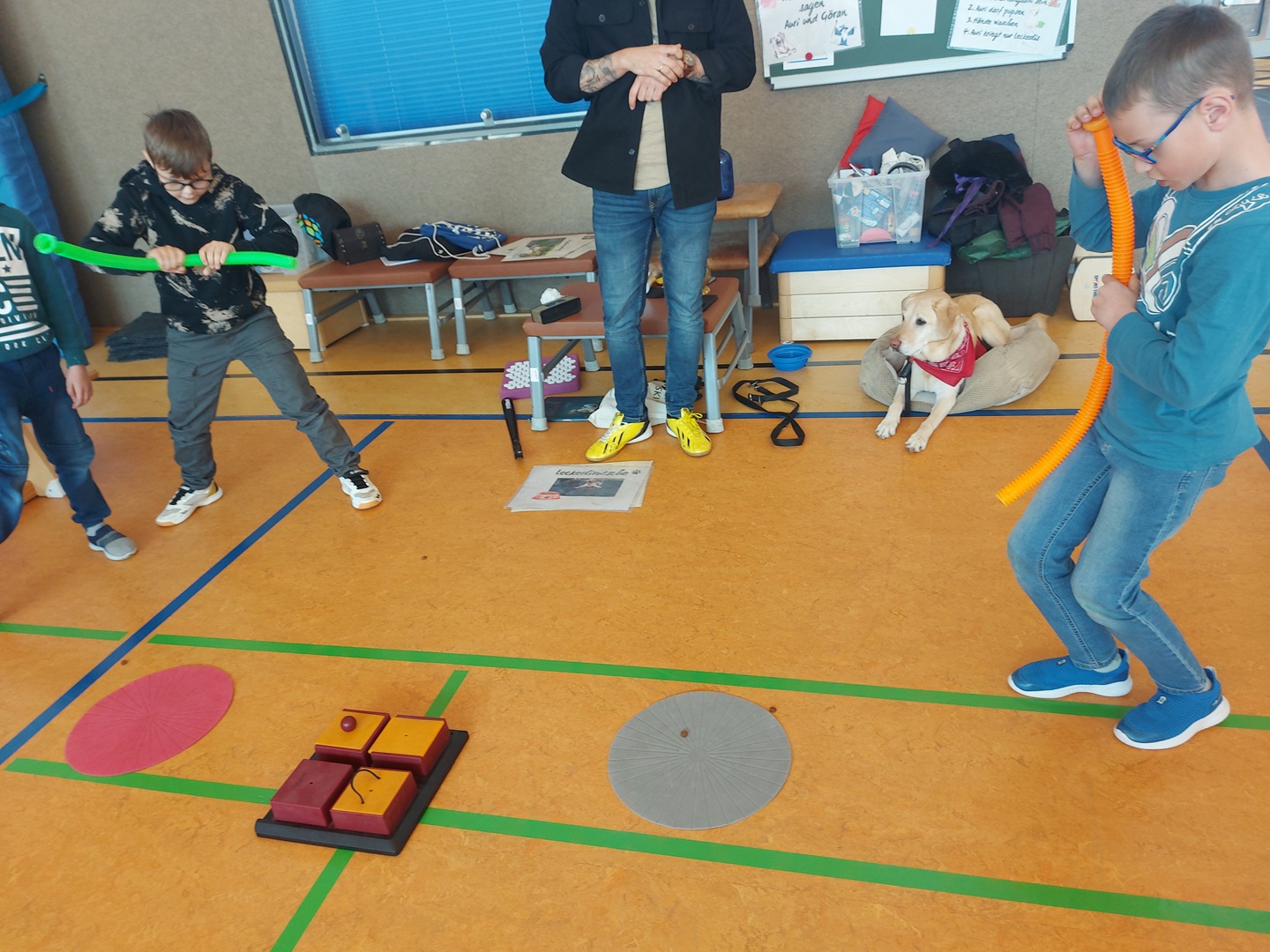 Anschließend standen verschiedene Teamtrainingsspiele auf dem Programm, bei denen Zusammenhalt, gegenseitige Unterstützung und gute Absprachen gefragt waren. Bei einer Kissen Challenge - einem Spiel im Kreis mit roten und grauen Kissen bewiesen wir, wie gut wir als Team funktionieren. Nach einer wohlverdienten Frühstücks- und „Flitzepause“ in der Turnhalle sowie einer kurzen Entspannungsübung durften die Kinder die nächsten Aktivitäten selbst wählen. Die Entscheidung fiel auf die „Leckerlirutsche“ und die „Hundepost“. Auri war überall mit vollem Eifer dabei und holte sich am Ende ihre wohlverdiente Belohnung ab. Da Hunde sehr empfindliche Ohren haben, lernten wir etwas ganz Besonderes – das „stille Anfeuern“ mit Gesten. Das war zwar ungewohnt, aber es klappte schon gut und sorgte für eine konzentrierte Atmosphäre. Es war ein spannender und fröhlicher Vormittag, an dem wir viel gelacht und noch mehr über den respektvollen Umgang mit Hunden gelernt haben. Ein herzliches Dankeschön an Göran und Auri für dieses unvergessliche Erlebnis auch in diesem Schuljahr!