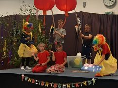 unserer Schule in Empfang genommen, sozusagen "die Übergabe" von der Kindergartenzeit zum Beginn der Grundschulzeit. Nach der Be­grüß­ung führten die Schüler der 4. Klasse das Musical  "1000 Farben hat die Welt" auf. Die Geschichte erzählt von den Egalos, das sind mies gelaunte Gestalten, die fast alle Farben auf der Welt geklaut haben. Sind sind der Meinung: "alles ist egal, alles ist grau und nichts soll mehr bunt sein". Aber die beiden Clowns Vario und Colorida haben etwas dagegen und sich vorgenommen alle Farben wieder zurück zu holen. Dies schaffen sie mit Hilfe der Schulanfänger, denn von ihnen bekommen sie die Energie zum Reisen. So holen sie sich die Farben zurück, indem sie um die ganze Welt reisen. In Afrika bekommen sie gelb, in Australien grün, in Asien rot und Südamerika grün, damit besiegten sie gemeinsam die Egalos. Und die Welt ist wieder bunt!