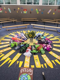 Am Samstag, 27. August 2022 fand in unserer feierlich geschmückten Turnhalle die Schuleinführungsfeier statt. Eltern und Geschwisterkinder waren anwesend, um den besonderen Augenblick mit den Schulanfängern zu erleben. Die ABC-Schützen wurden von ihren Erzieherinnen aus dem Kindergarten in die Turnhalle geführt und dort von den Lehrerinnen