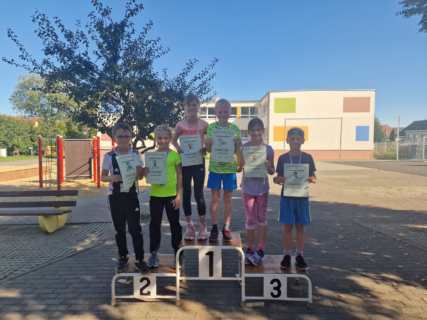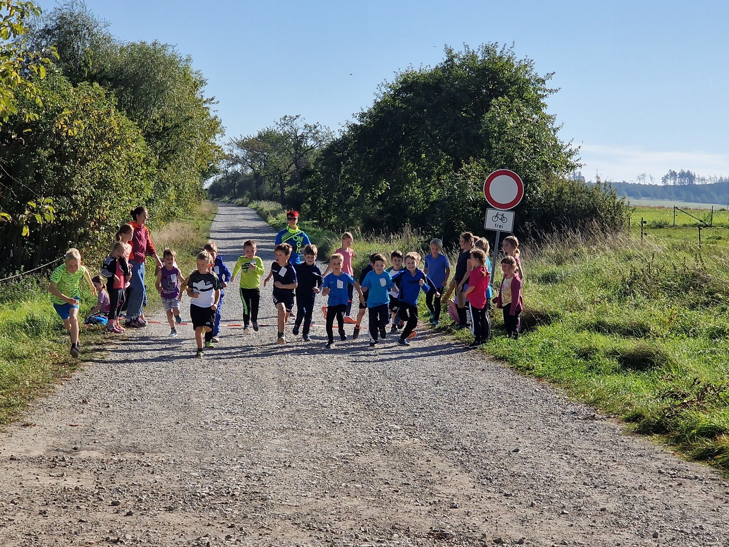 Dabei zeigten die "Großen", also unsere Viertklässler, wie man sich vor so einem Wettkampf richtig warm macht. Dabei bildeten jeweils alle Mädchen und Jungen einen Kreis und die verschiedensten Dehnübungen wurden ausgeführt. Dann ging es endlich los - alle Kinder waren aufgeregt. Dies merkte man vor allem an der Startlinie, der Startschuss konnte kaum abgewartet werden und die Kinder rannten los. Die Viertklässler- Jungen nahmen als Erste die Strecke in Angriff. Und wie es sich für einen richtigen Herbst-Crosslauf gehört, ging es bergauf und -ab, aber dies hielt keinen ab, so schnell wie möglich zu rennen. So konnten die Jüngeren erst einmal schauen, denn für sie war es der erste sportliche Wettstreit dieser Art. Außerdem laufen die Schüler der 4.Klasse auch die längste Strecke.