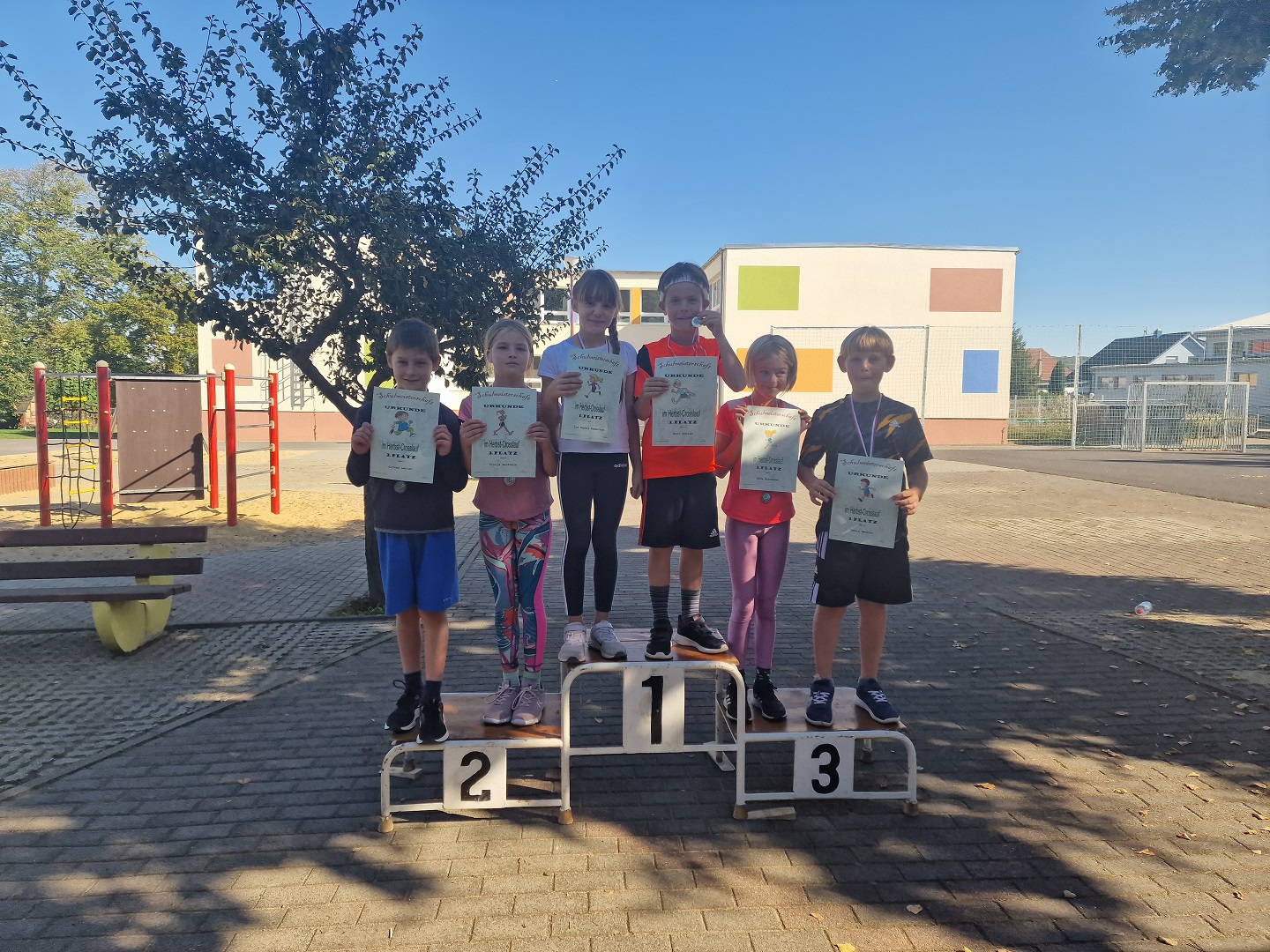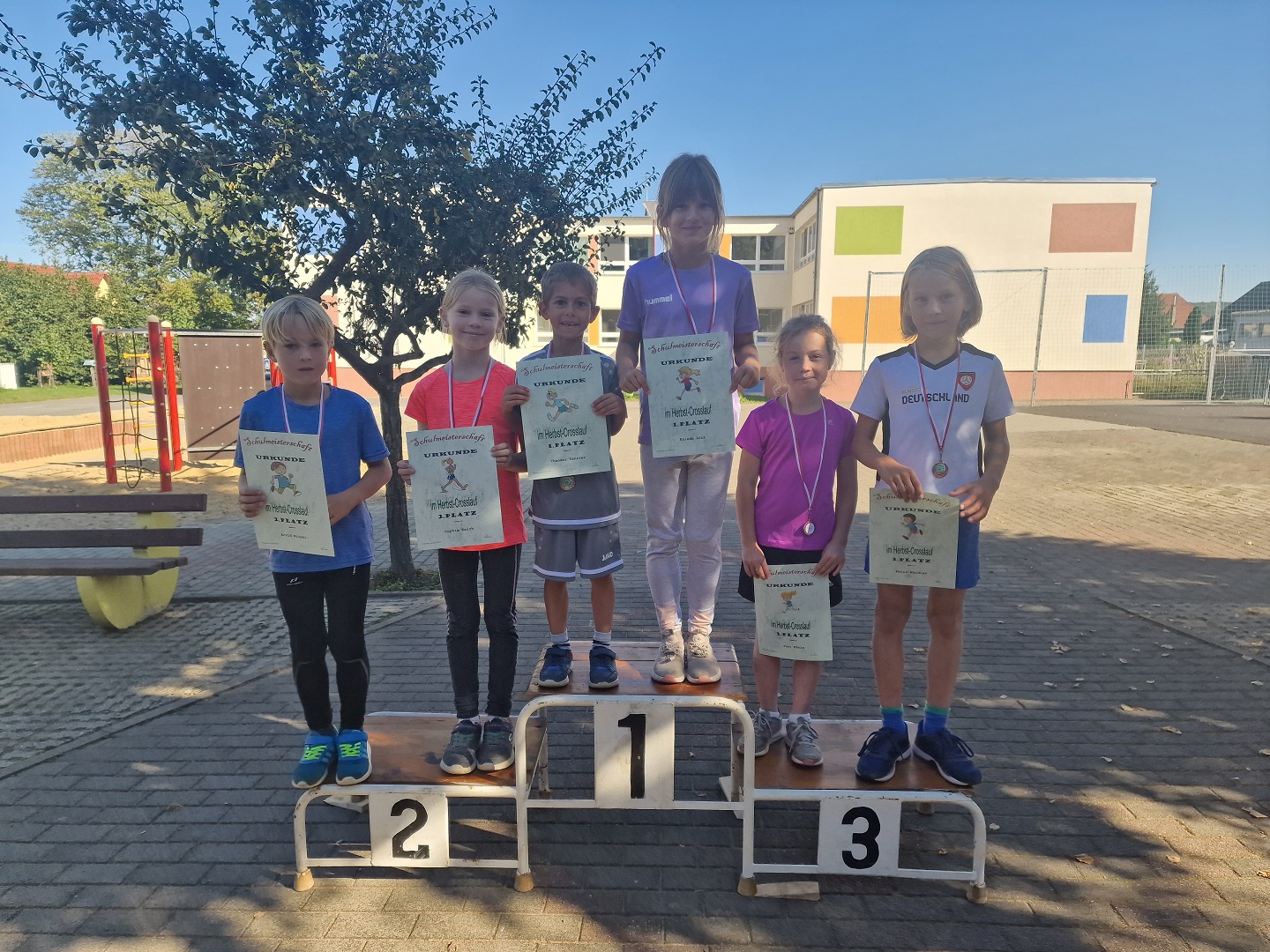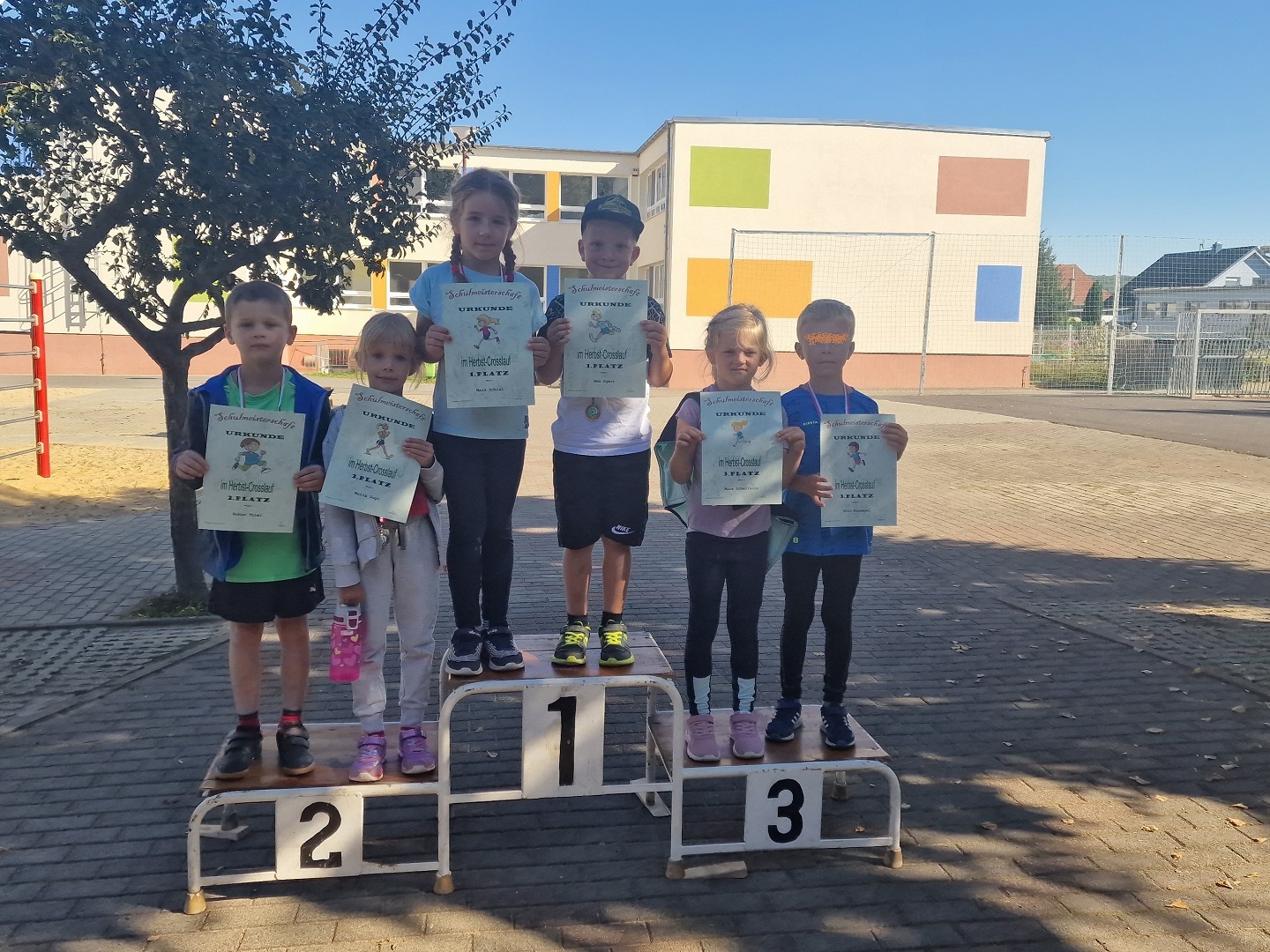 Alle Kinder, egal ob Erster, Zweiter oder Letzter, wurden begeistert angefeuert. Obwohl einige Kinder im Ziel erstmal k.o. waren, liefen sie dann nochmal bei den Kleineren mit und motivierten dadurch jeden Läufer. Jeder gab sein Bestes und alle erreichten das Ziel. Bei manchen Läufen gab es richtig enge Entscheidungen und der Ausgang des Rennens wurde auf den letzten Metern kurz vor der Ziellinie entschieden. Aber es gab auch Läufe bei denen der Erstplatzierte weit vor den anderen lag. Die Siegerehrung fand gleich nach dem Rückweg im Anschluss auf dem Schulhof statt. Dabei wurden die jeweils 3 besten Cross-Läufer geehrt. Sie erhielten für ihre Leistungen eine Urkunde und eine Medaille, die sie sehr stolz präsentierten.