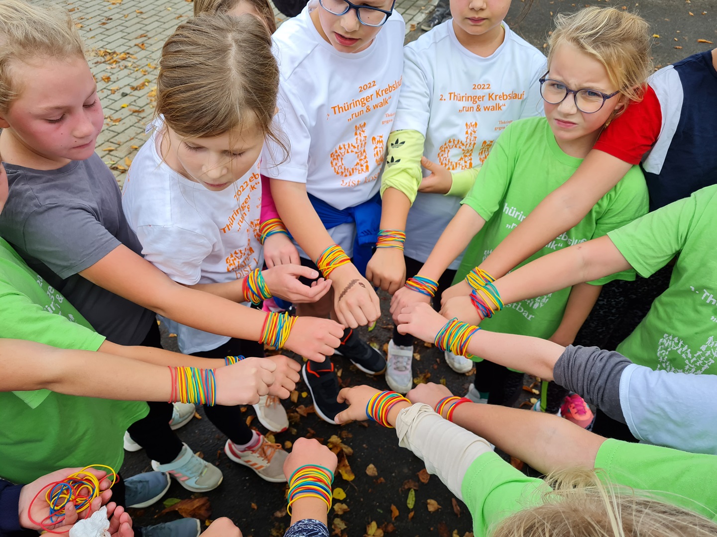 Es war unglaublich, wie viele Runden von den Schülern geschafft wurden. Die meist gelaufene Rundenzahl betrug 39 – dies sind 7,8 km – Spitze! Alle Kinder sind dabei über sich hinausgewachsen. Für jede zurückgelegte Runde erhielten die Schüler ein Gummiband und diese wurden nach Beendigung der Zeit gezählt.  Alle waren mit Begeisterung dabei. Der eine oder andere wäre auch gern noch länger gelaufen. Gemeinsam liefen alle Schüler phänomenale 414 km.  Mit unserer Teilnahme haben wir nicht nur etwas Gutes für uns getan, sondern auch die Arbeit der Krebsgesellschaft unterstützt.