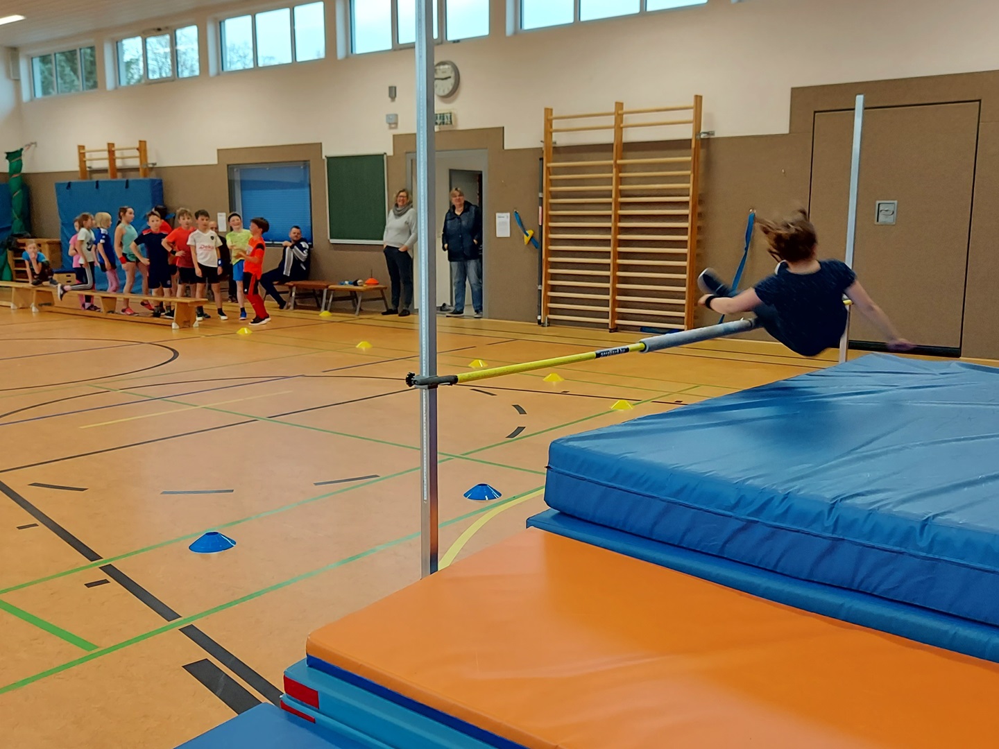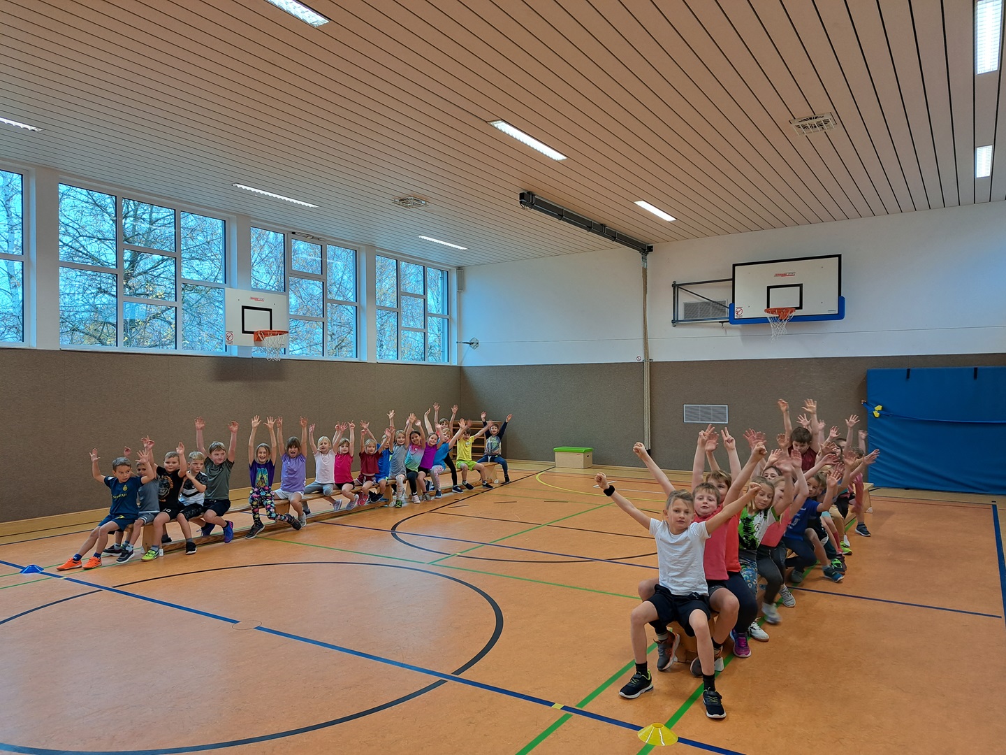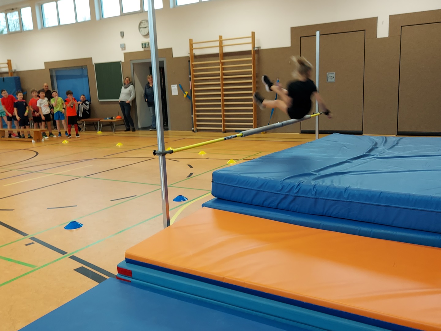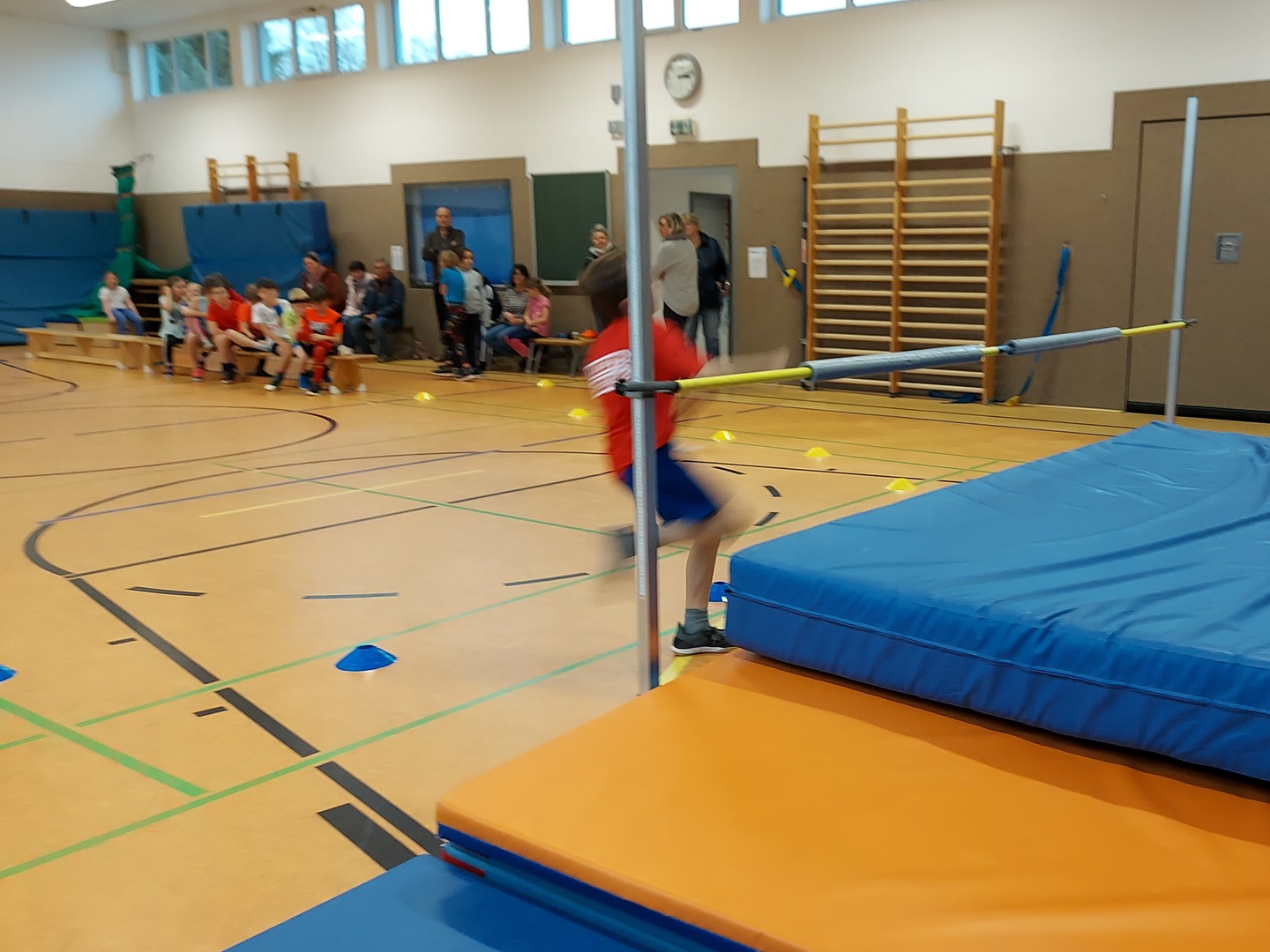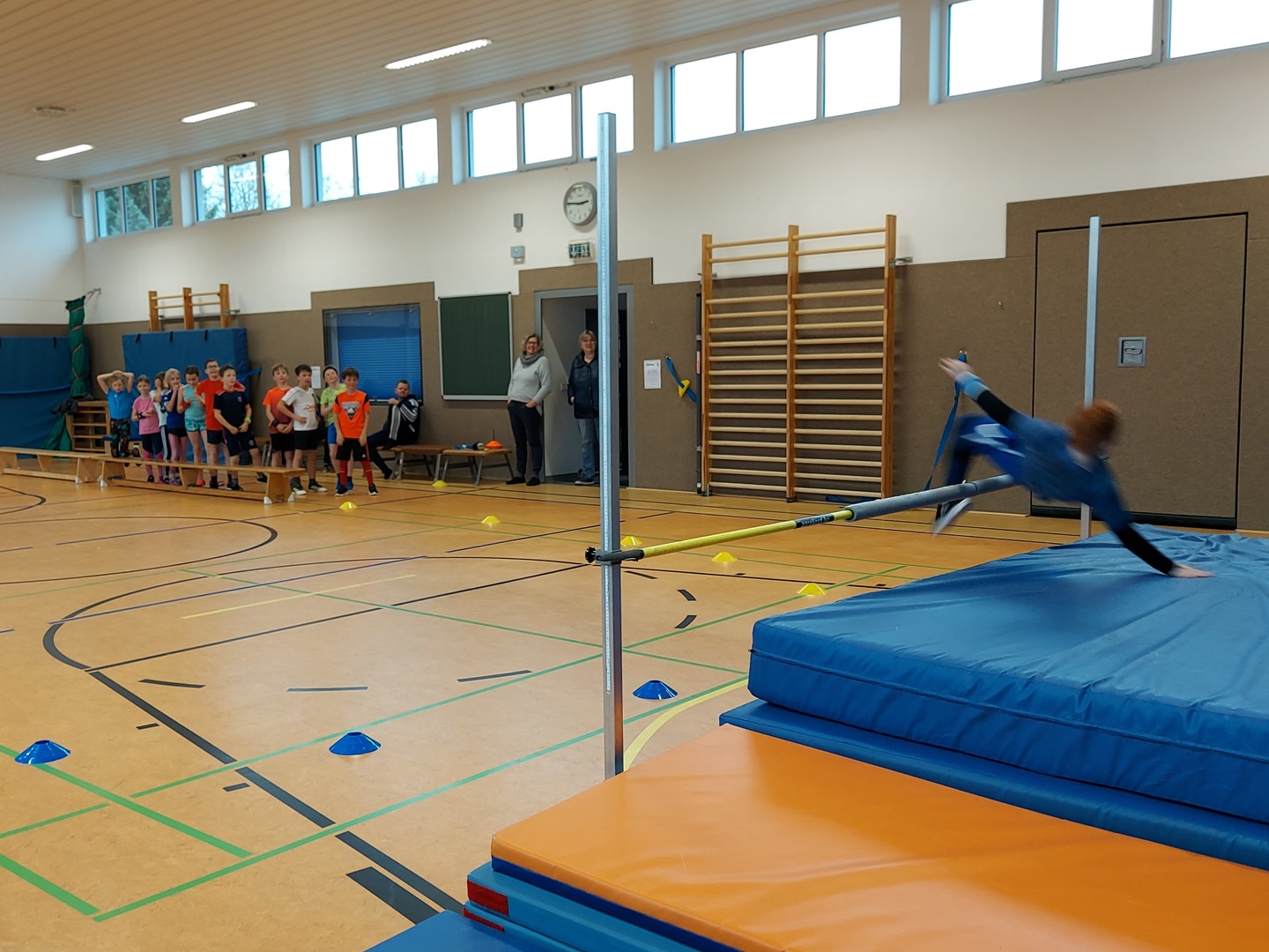 Am Mittwoch, 22. November 2023 fand für alle Kinder, die gern hochspringen, unsere Schulmeisterschaft im Hochsprung statt. Es fanden sich 61 Kinder aus den Klassen 1 - 4 in unserer Turnhalle ein, um sich diesem Wettkampf zu stellen. Darüber freute sich die Sportlehrerin, denn so viele Teilnehmer gab es bisher noch nie. Die anderen Schüler waren zum Zuschauen und Anfeuern ebenfalls dabei. Es begannen die Schüler der 1 + 2 Klasse, danach sprangen die Dritt – und Viertklässler.
