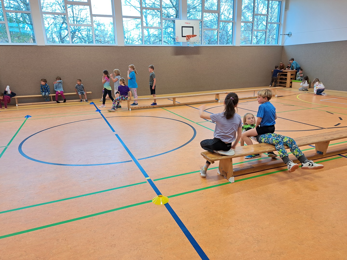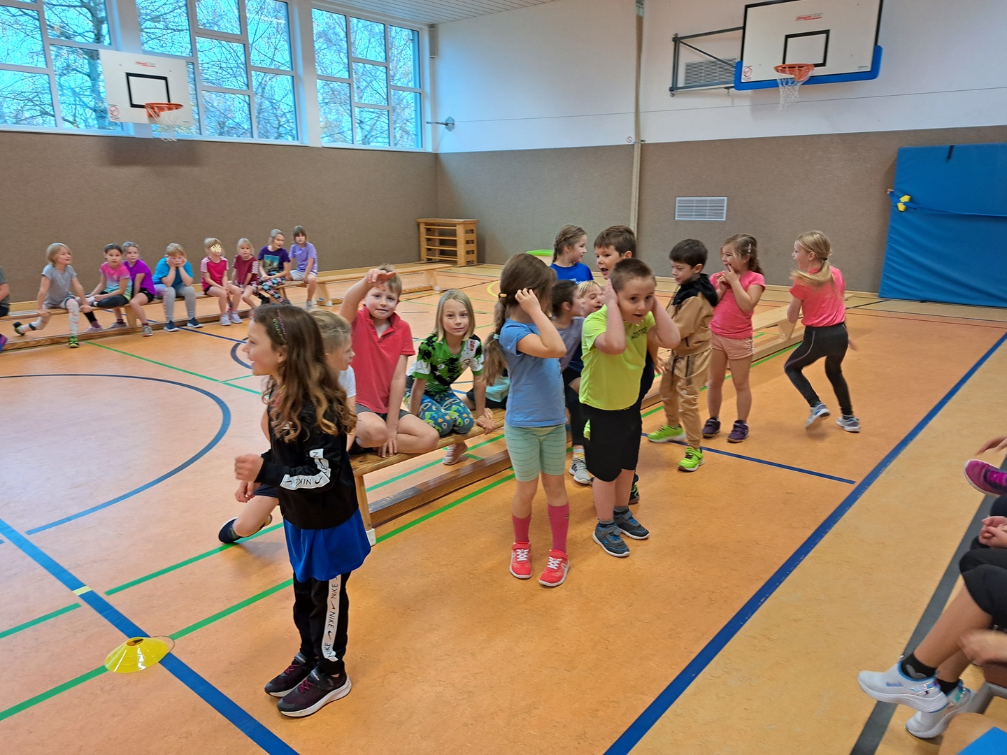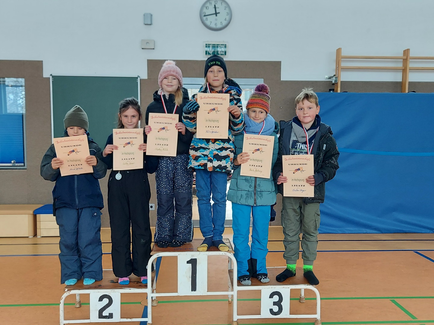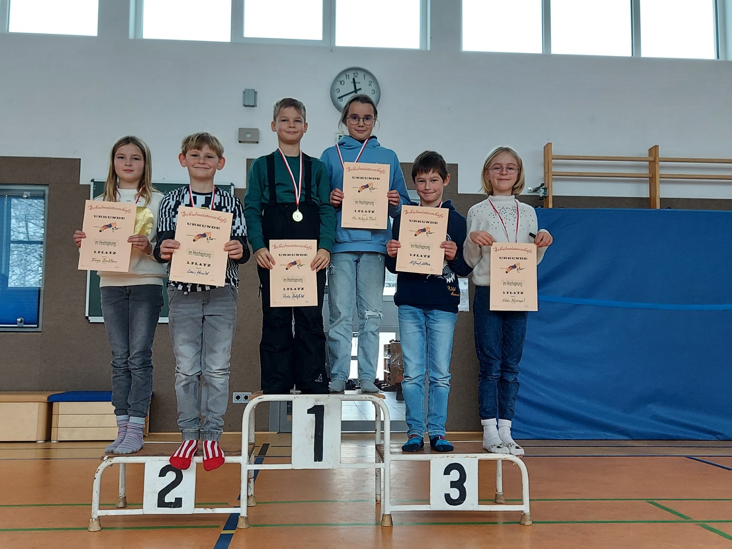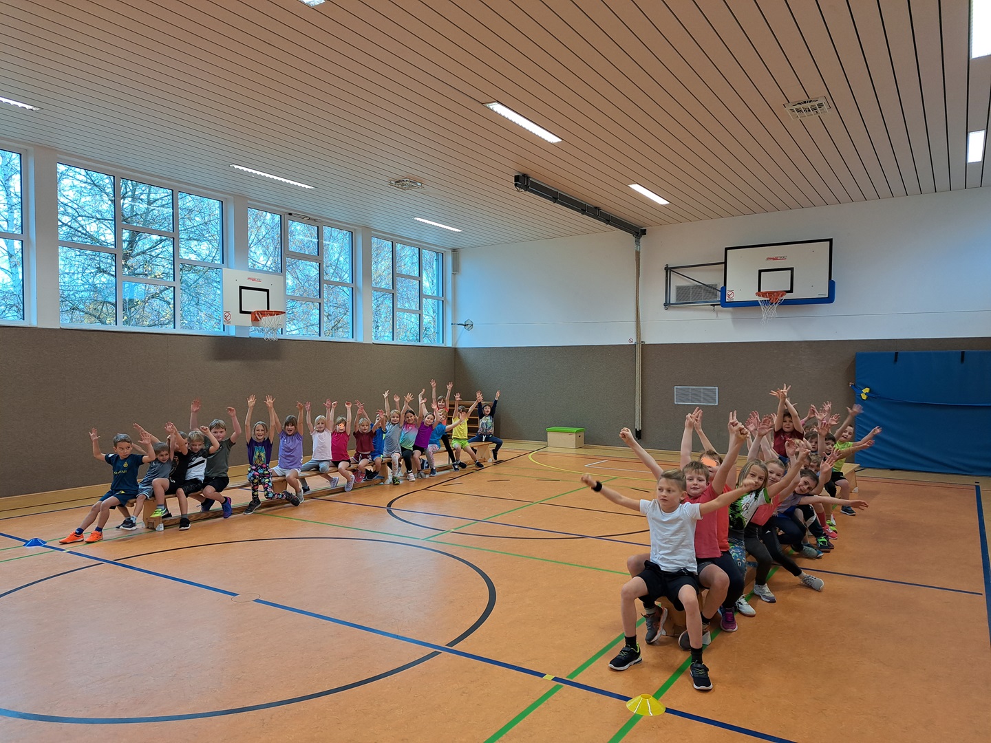 Am Mittwoch, 22. November 2023 fand für alle Kinder, die gern hochspringen, unsere Schulmeisterschaft im Hochsprung statt. Es fanden sich 61 Kinder aus den Klassen 1 - 4 in unserer Turnhalle ein, um sich diesem Wettkampf zu stellen. Darüber freute sich die Sportlehrerin, denn so viele Teilnehmer gab es bisher noch nie. Die anderen Schüler waren zum Zuschauen und Anfeuern ebenfalls dabei. Es begannen die Schüler der 1 + 2 Klasse, danach sprangen die Dritt – und Viertklässler.
