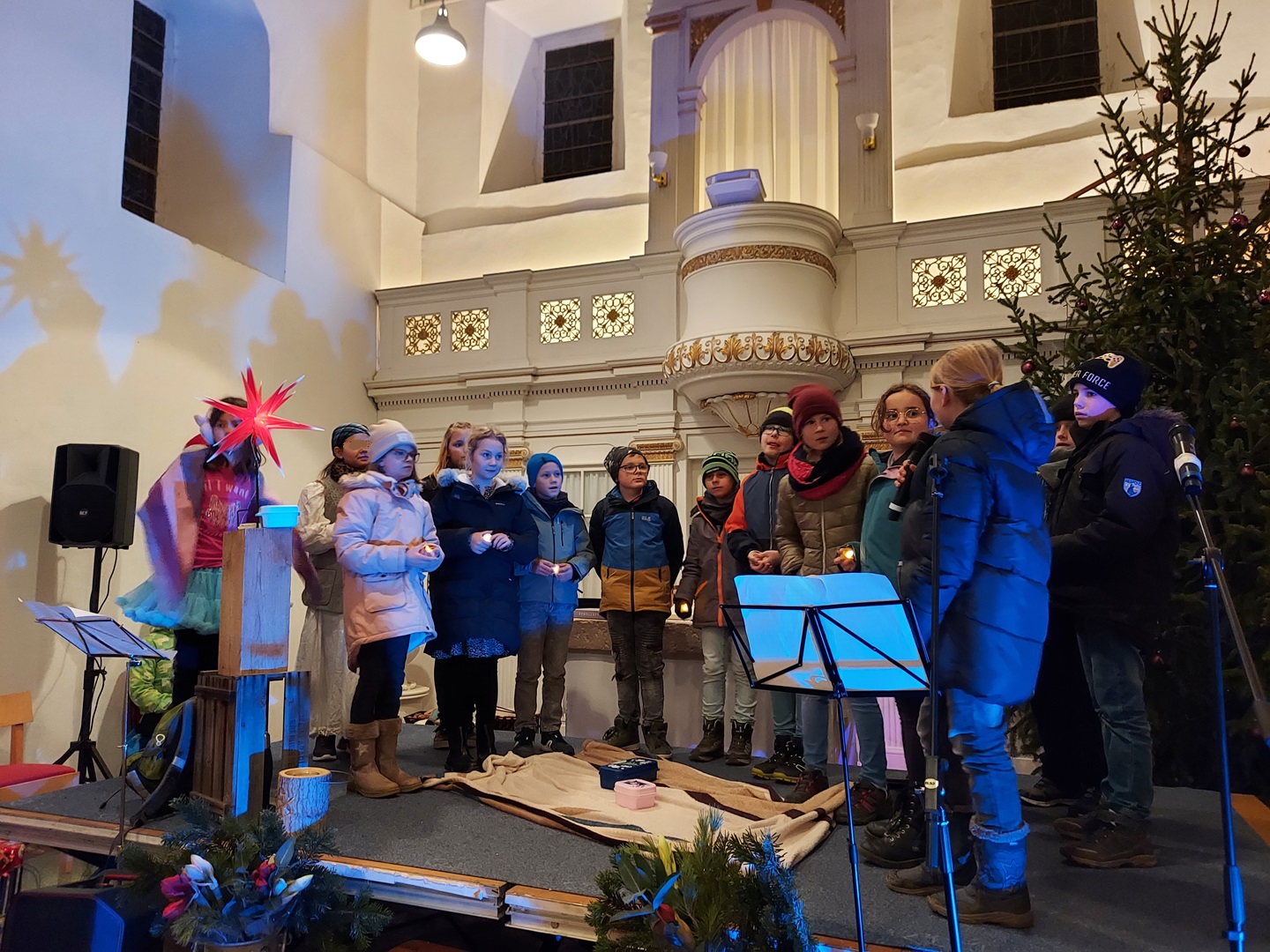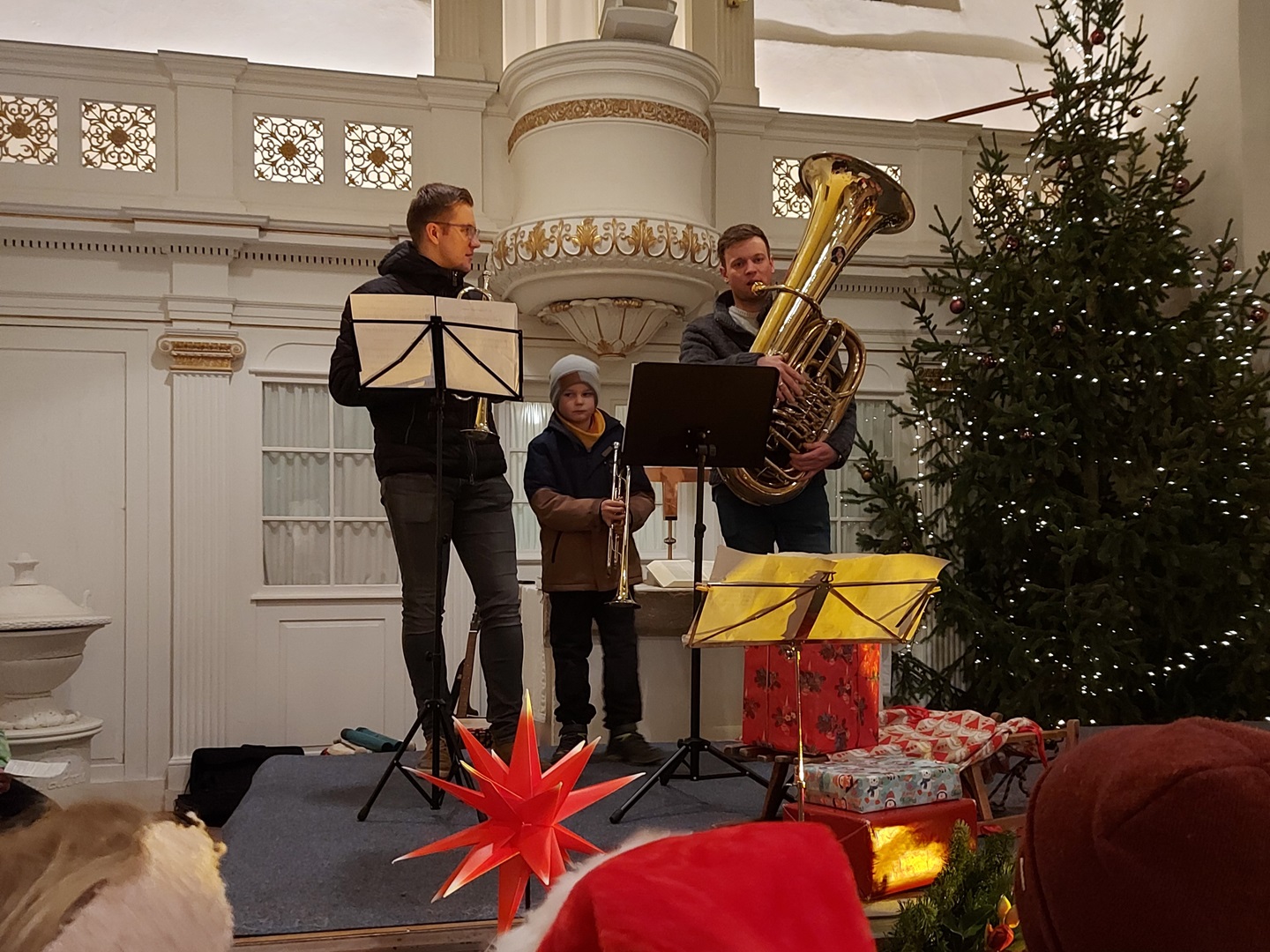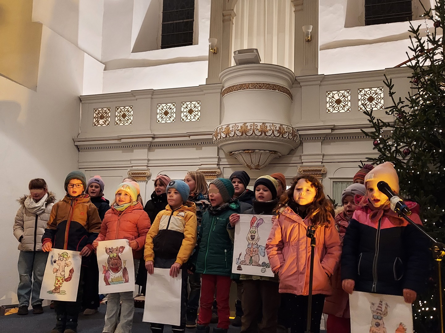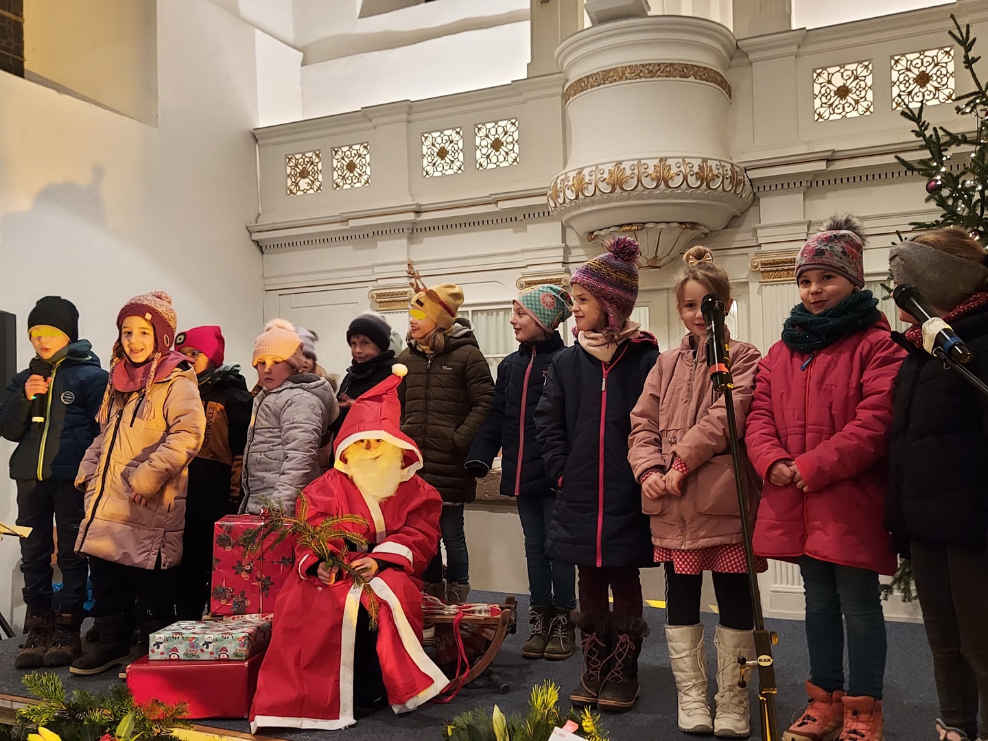 Vorher konnten sich die Eltern, Geschwister, Großeltern und Freunde bei Tee, Kaffee und leckeren selbstgebackenen Kuchen in aller Ruhe auf die Weihnachtsfeier einstimmen. In den weihnachtlich geschmückten Klassenräumen der 1/2 a, b und c war jeweils ein kleines "Cafe" vorbereitet wurden. Den Kuchen verkauften die Viertklässler im Speiseraum. Um die Zeit für die Kinder bis zu ihrem Auftritt zu verkürzen und die Aufregung zu mildern, boten Frau Bickel im Werken-Raum und die Erzieher im Hort Weihnachtsbasteleien an. So wurden z. B. Schneemänner aus Papptellern, Kerzen aus Servietten gebastelt oder weihnachtliche Motive „geprickelt“. Dann begaben sich alle in die Kirche und erwarteten gespannt das Weihnachtskonzert. Alle Schüler unserer Schule hatten gemeinsam mit Frau Linß ein buntes Programm vorbereitet. So spielte Pedro gemeinsam mit seinem Papa und Clemens Hartung zur musikalischen Begrüßung auf ihrer Trompete und Tuba „Ihr Kinderlein kommet“. Danach zeigte Juni aus der 2. Klasse ihr Können auf der Querflöte und spielte „Jingle Bells“. Die Klassen 1/2a, b und c trugen jeweils weihnachtliche Gedichte vor und sangen Weihnachtslieder. Die 3. Klasse überraschte das Publikum mit einer modernen Rap-Version vom Weihnachtslied „Morgen Kinder wird`s was geben“. Kinder der 4. Klasse führten das Weihnachts-Musical "Ein Dorf findet Weihnachten" auf. Für ihre Aufführungen ernteten alle Kinder jede Menge Applaus. Zum Abschluss der gelungenen Weihnachtsfeier spielten noch einmal die Trompeter das Lied „Oh du fröhliche“ und alle Besucher sangen gemeinsam mit.
