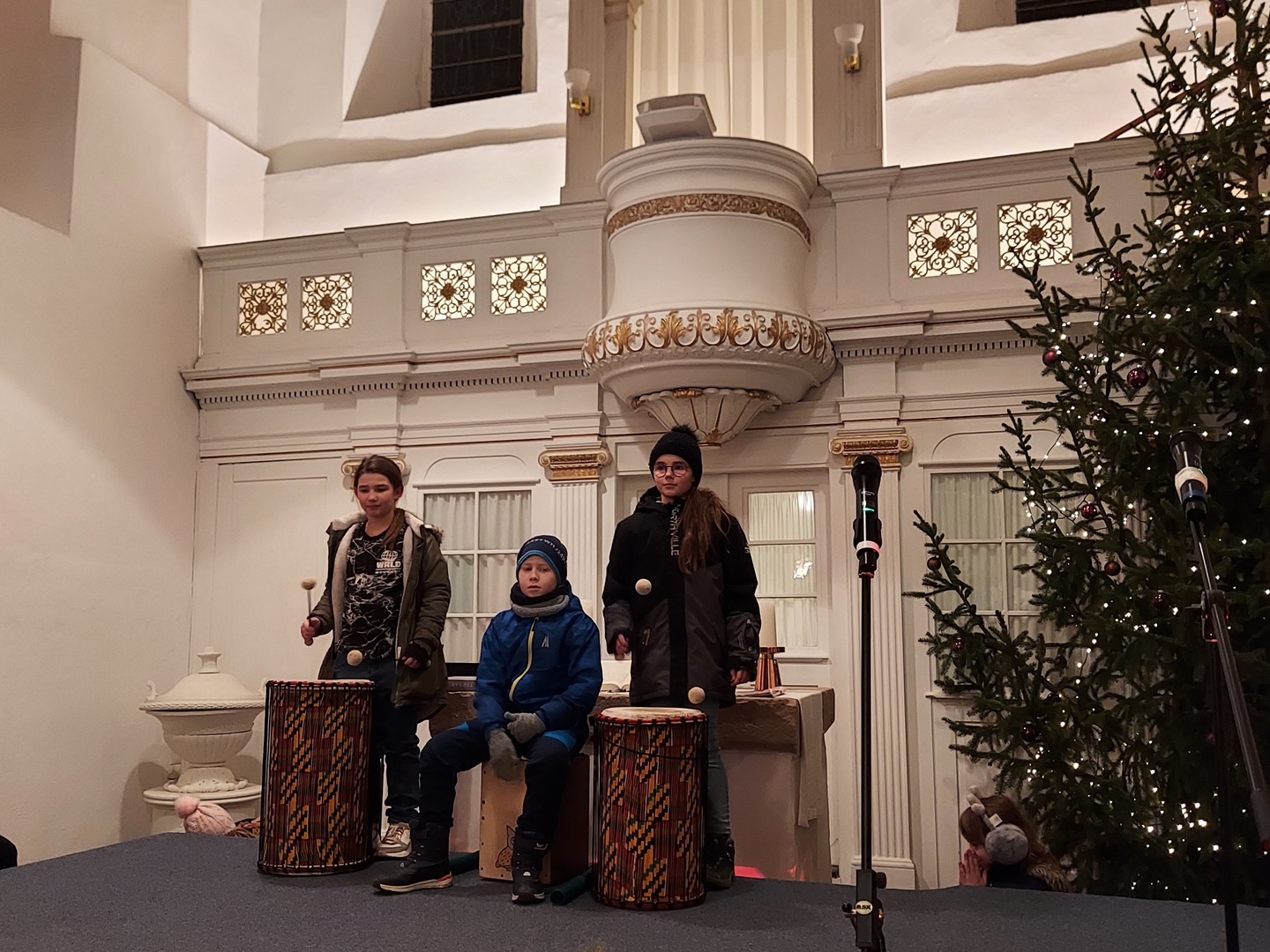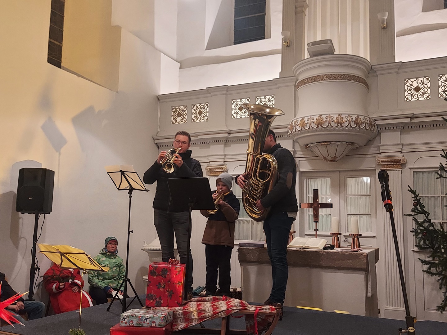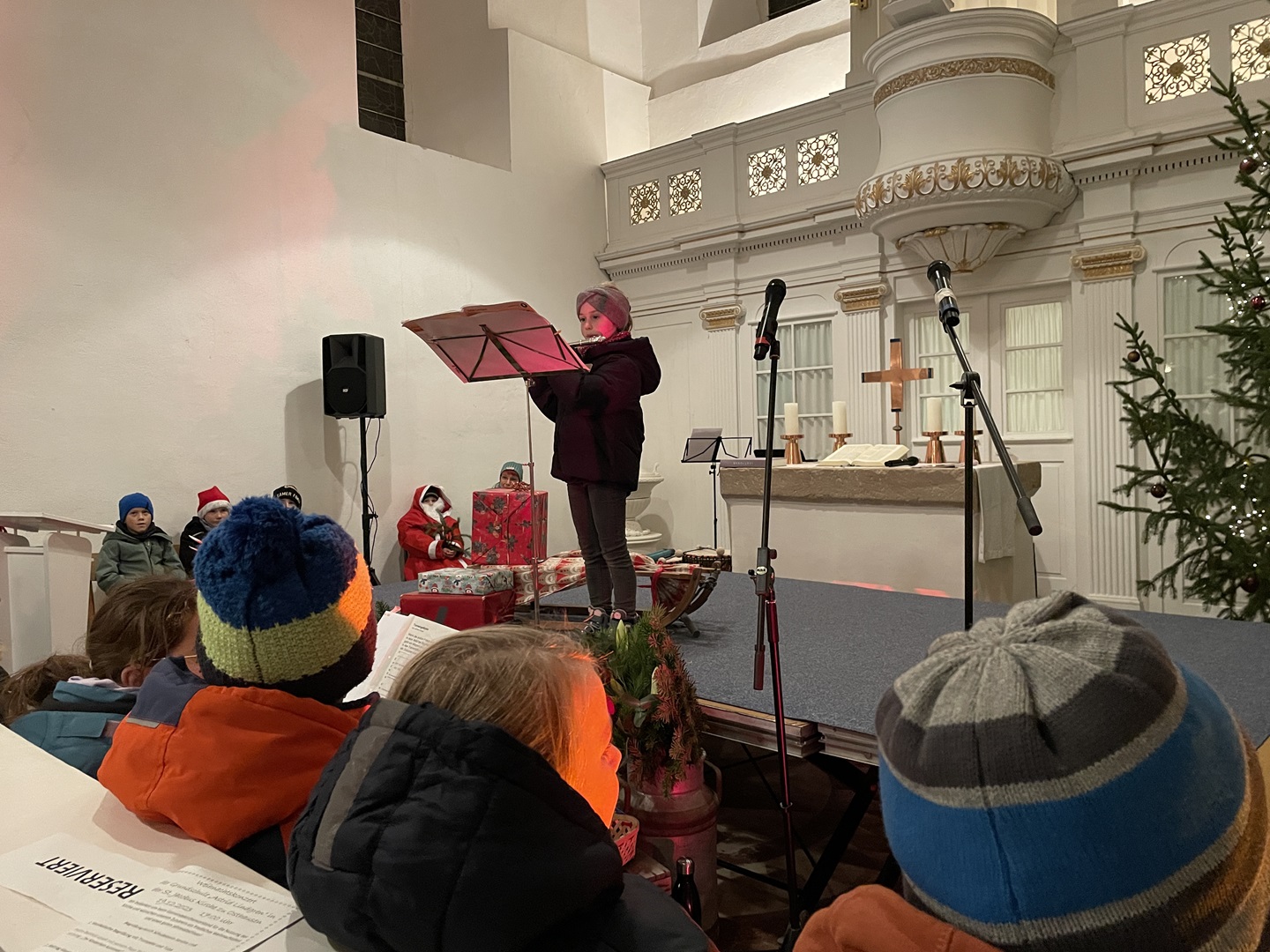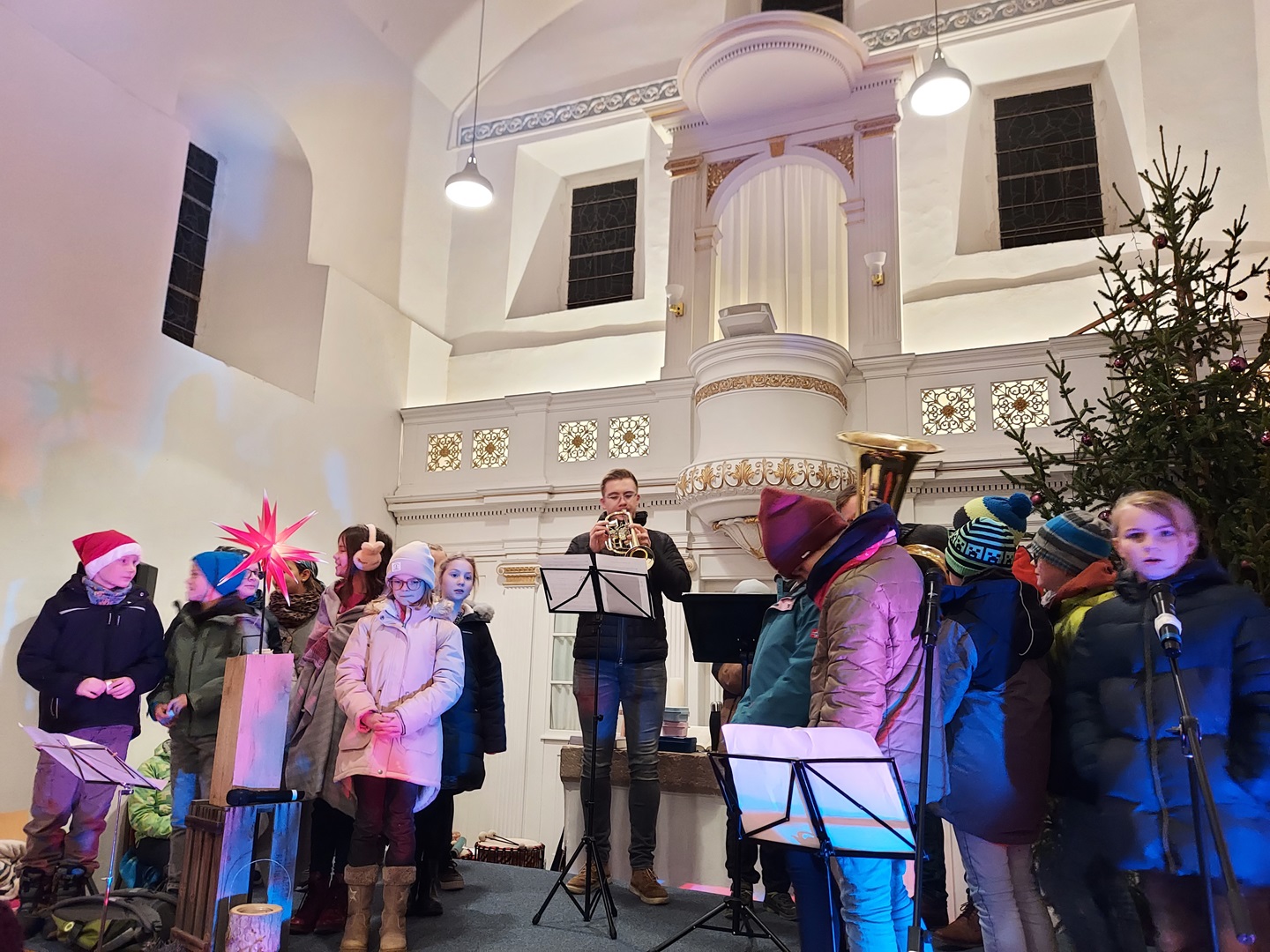 Vorher konnten sich die Eltern, Geschwister, Großeltern und Freunde bei Tee, Kaffee und leckeren selbstgebackenen Kuchen in aller Ruhe auf die Weihnachtsfeier einstimmen. In den weihnachtlich geschmückten Klassenräumen der 1/2 a, b und c war jeweils ein kleines "Cafe" vorbereitet wurden. Den Kuchen verkauften die Viertklässler im Speiseraum. Um die Zeit für die Kinder bis zu ihrem Auftritt zu verkürzen und die Aufregung zu mildern, boten Frau Bickel im Werken-Raum und die Erzieher im Hort Weihnachtsbasteleien an. So wurden z. B. Schneemänner aus Papptellern, Kerzen aus Servietten gebastelt oder weihnachtliche Motive „geprickelt“. Dann begaben sich alle in die Kirche und erwarteten gespannt das Weihnachtskonzert. Alle Schüler unserer Schule hatten gemeinsam mit Frau Linß ein buntes Programm vorbereitet. So spielte Pedro gemeinsam mit seinem Papa und Clemens Hartung zur musikalischen Begrüßung auf ihrer Trompete und Tuba „Ihr Kinderlein kommet“. Danach zeigte Juni aus der 2. Klasse ihr Können auf der Querflöte und spielte „Jingle Bells“. Die Klassen 1/2a, b und c trugen jeweils weihnachtliche Gedichte vor und sangen Weihnachtslieder. Die 3. Klasse überraschte das Publikum mit einer modernen Rap-Version vom Weihnachtslied „Morgen Kinder wird`s was geben“. Kinder der 4. Klasse führten das Weihnachts-Musical "Ein Dorf findet Weihnachten" auf. Für ihre Aufführungen ernteten alle Kinder jede Menge Applaus. Zum Abschluss der gelungenen Weihnachtsfeier spielten noch einmal die Trompeter das Lied „Oh du fröhliche“ und alle Besucher sangen gemeinsam mit.
