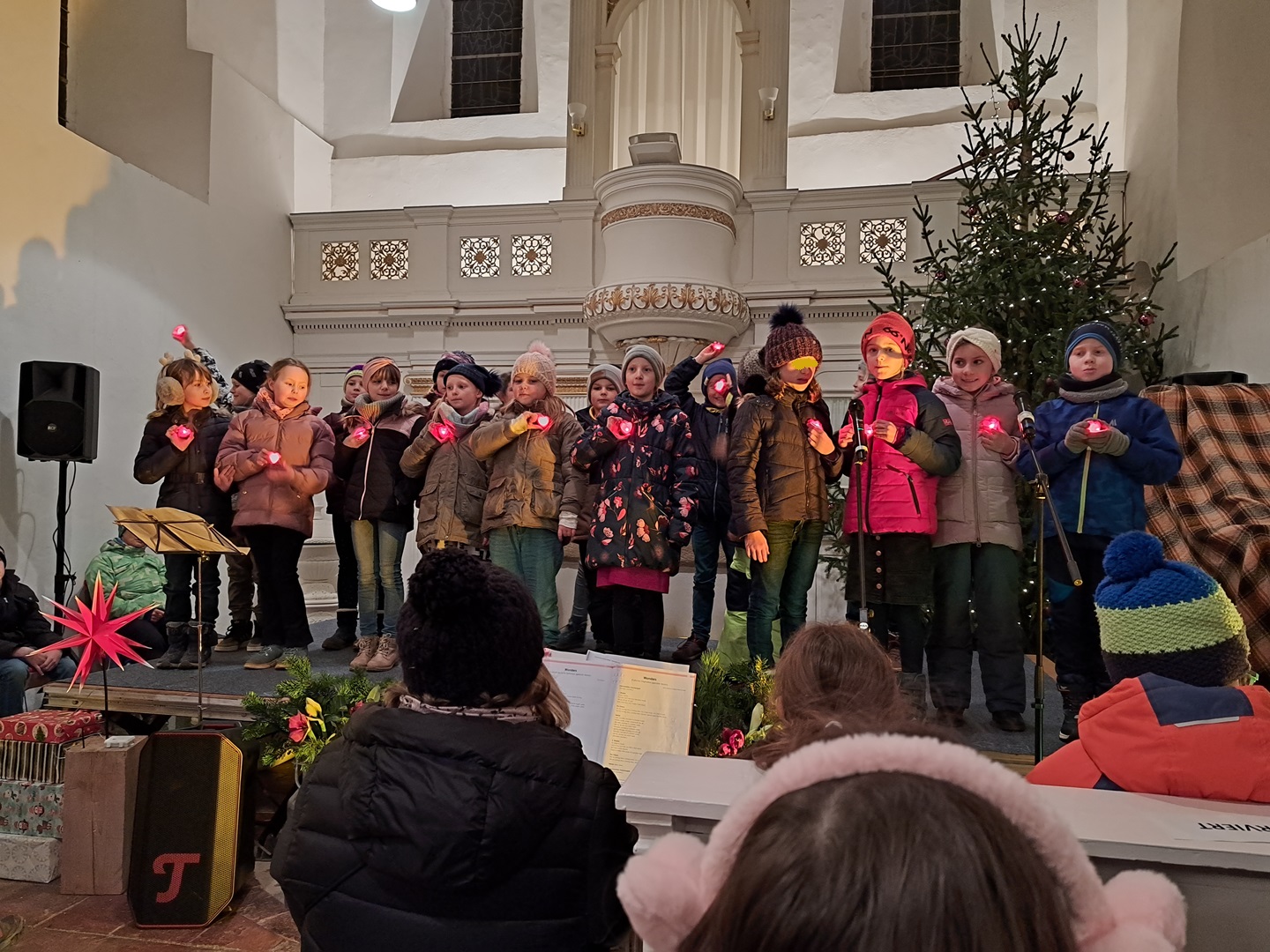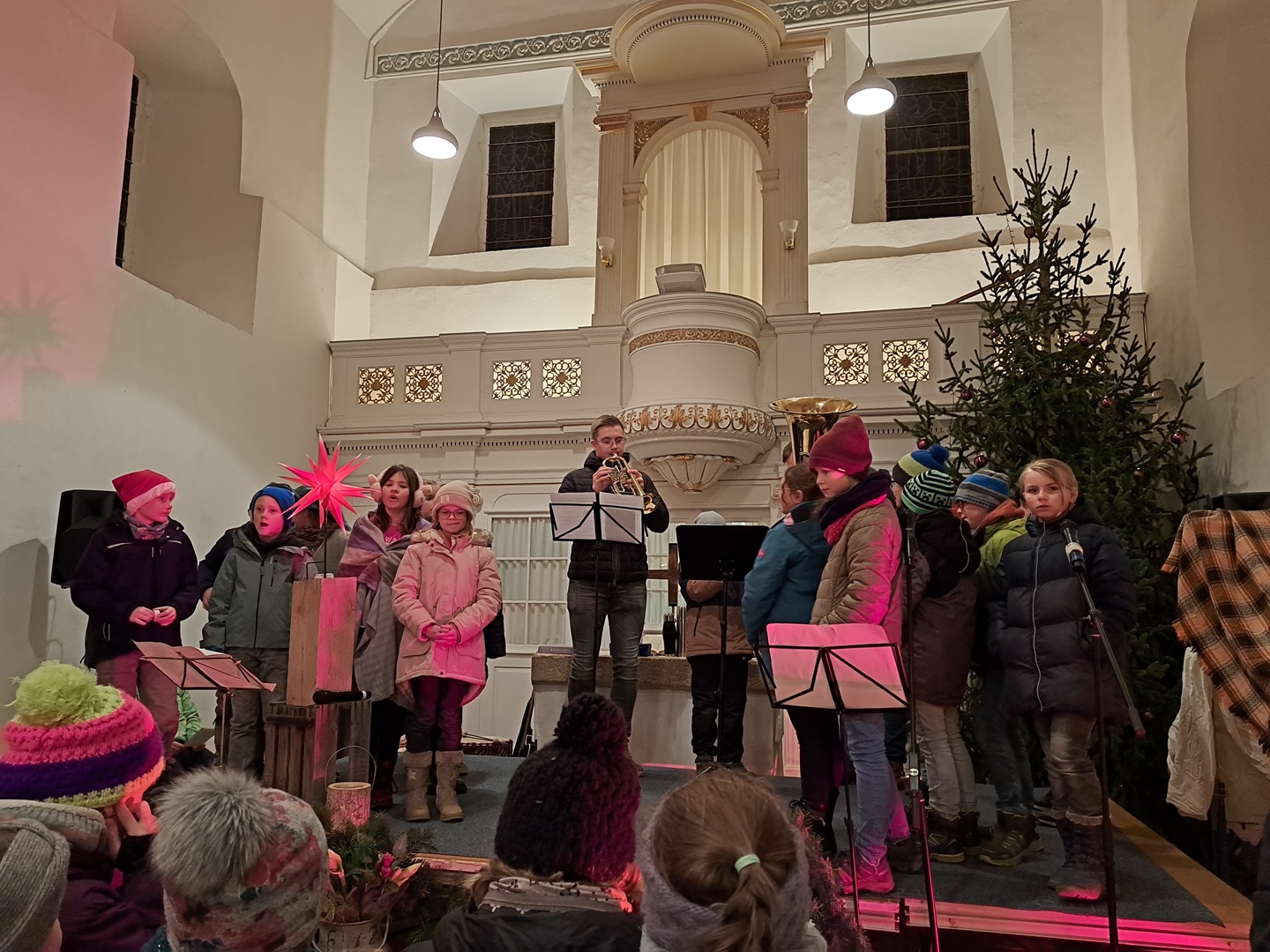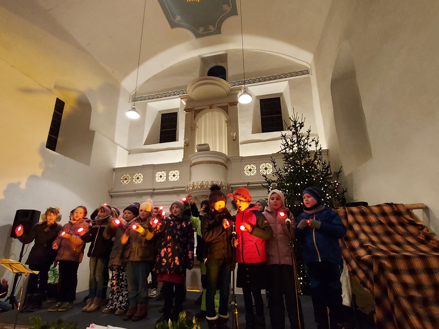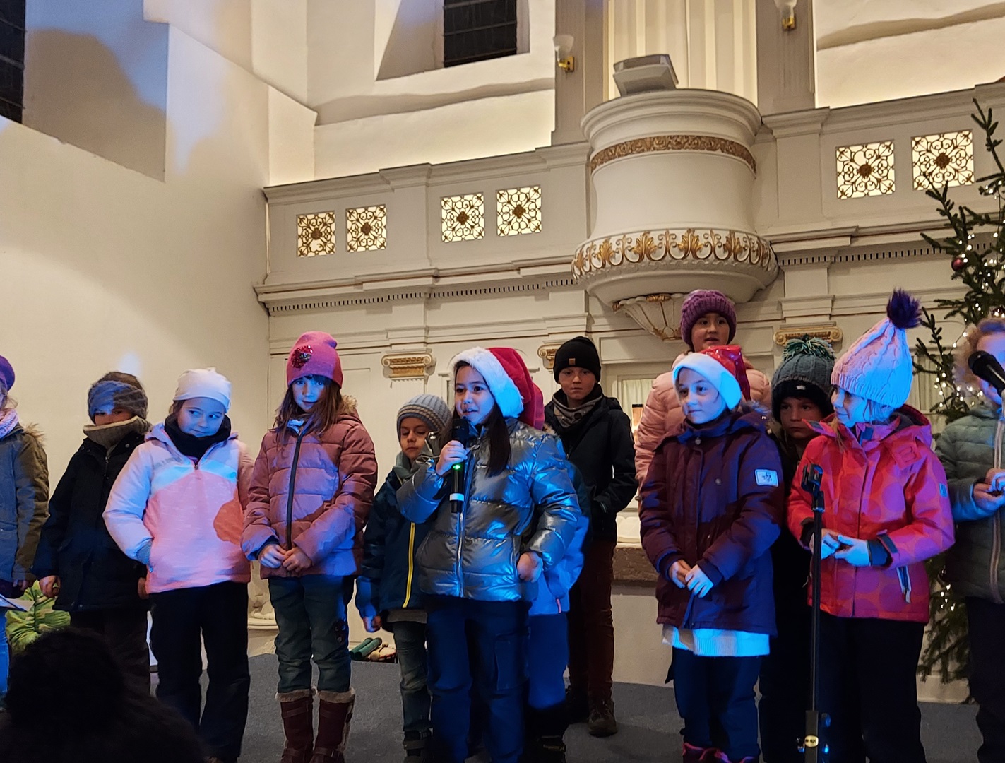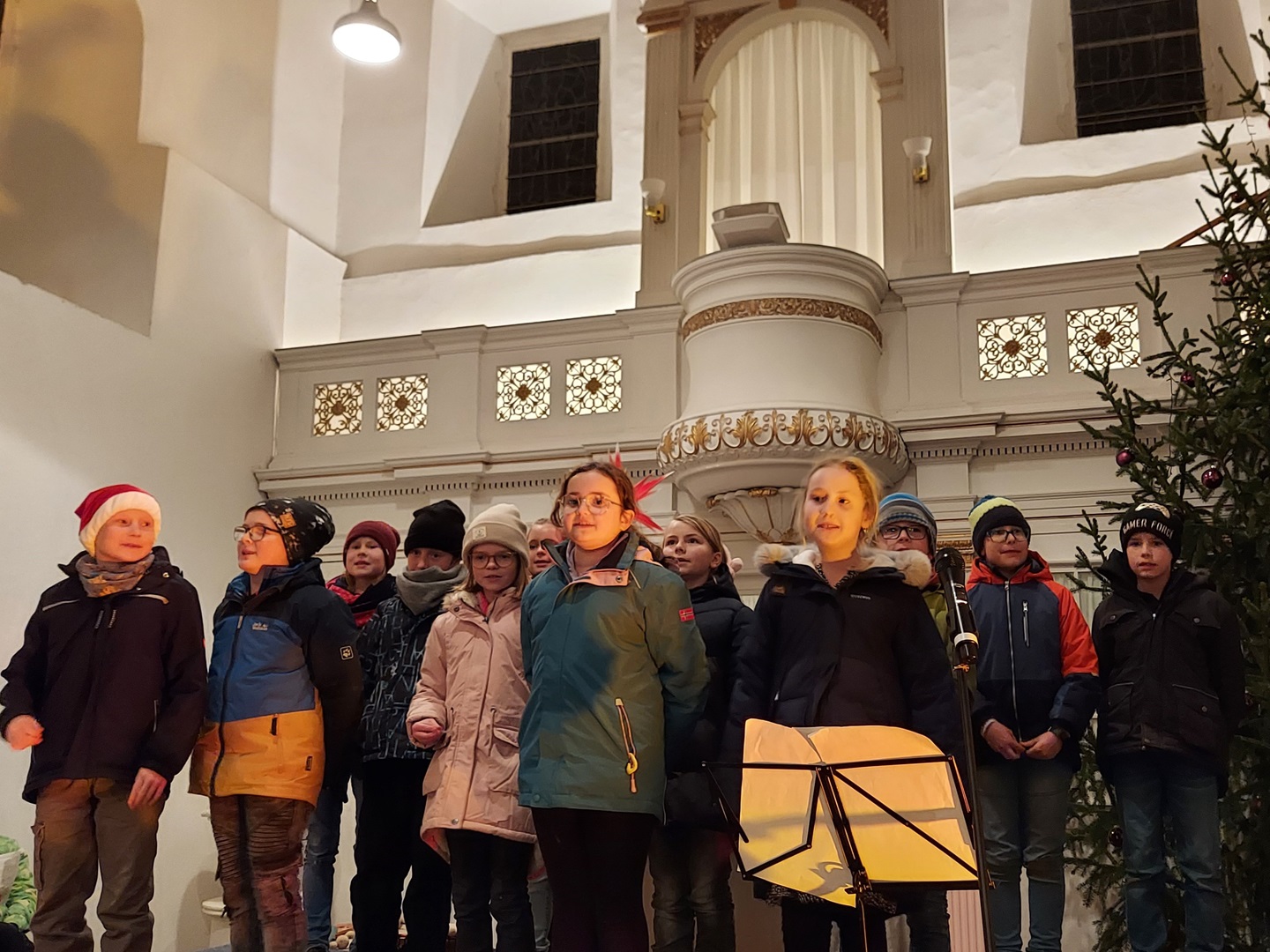 Vorher konnten sich die Eltern, Geschwister, Großeltern und Freunde bei Tee, Kaffee und leckeren selbstgebackenen Kuchen in aller Ruhe auf die Weihnachtsfeier einstimmen. In den weihnachtlich geschmückten Klassenräumen der 1/2 a, b und c war jeweils ein kleines "Cafe" vorbereitet wurden. Den Kuchen verkauften die Viertklässler im Speiseraum. Um die Zeit für die Kinder bis zu ihrem Auftritt zu verkürzen und die Aufregung zu mildern, boten Frau Bickel im Werken-Raum und die Erzieher im Hort Weihnachtsbasteleien an. So wurden z. B. Schneemänner aus Papptellern, Kerzen aus Servietten gebastelt oder weihnachtliche Motive „geprickelt“. Dann begaben sich alle in die Kirche und erwarteten gespannt das Weihnachtskonzert. Alle Schüler unserer Schule hatten gemeinsam mit Frau Linß ein buntes Programm vorbereitet. So spielte Pedro gemeinsam mit seinem Papa und Clemens Hartung zur musikalischen Begrüßung auf ihrer Trompete und Tuba „Ihr Kinderlein kommet“. Danach zeigte Juni aus der 2. Klasse ihr Können auf der Querflöte und spielte „Jingle Bells“. Die Klassen 1/2a, b und c trugen jeweils weihnachtliche Gedichte vor und sangen Weihnachtslieder. Die 3. Klasse überraschte das Publikum mit einer modernen Rap-Version vom Weihnachtslied „Morgen Kinder wird`s was geben“. Kinder der 4. Klasse führten das Weihnachts-Musical "Ein Dorf findet Weihnachten" auf. Für ihre Aufführungen ernteten alle Kinder jede Menge Applaus. Zum Abschluss der gelungenen Weihnachtsfeier spielten noch einmal die Trompeter das Lied „Oh du fröhliche“ und alle Besucher sangen gemeinsam mit.