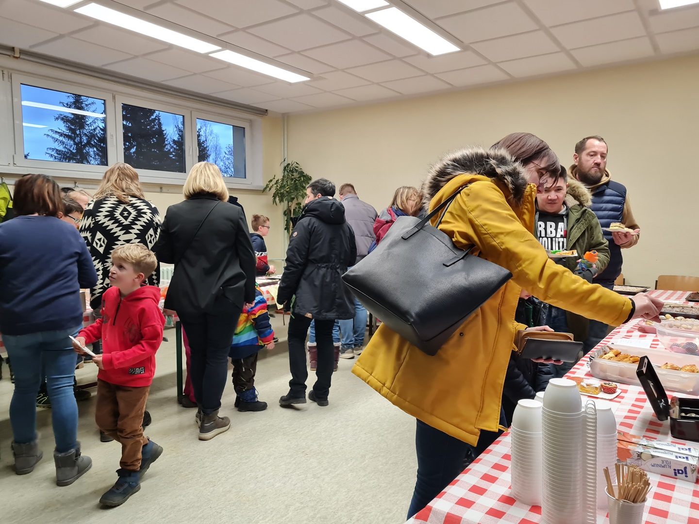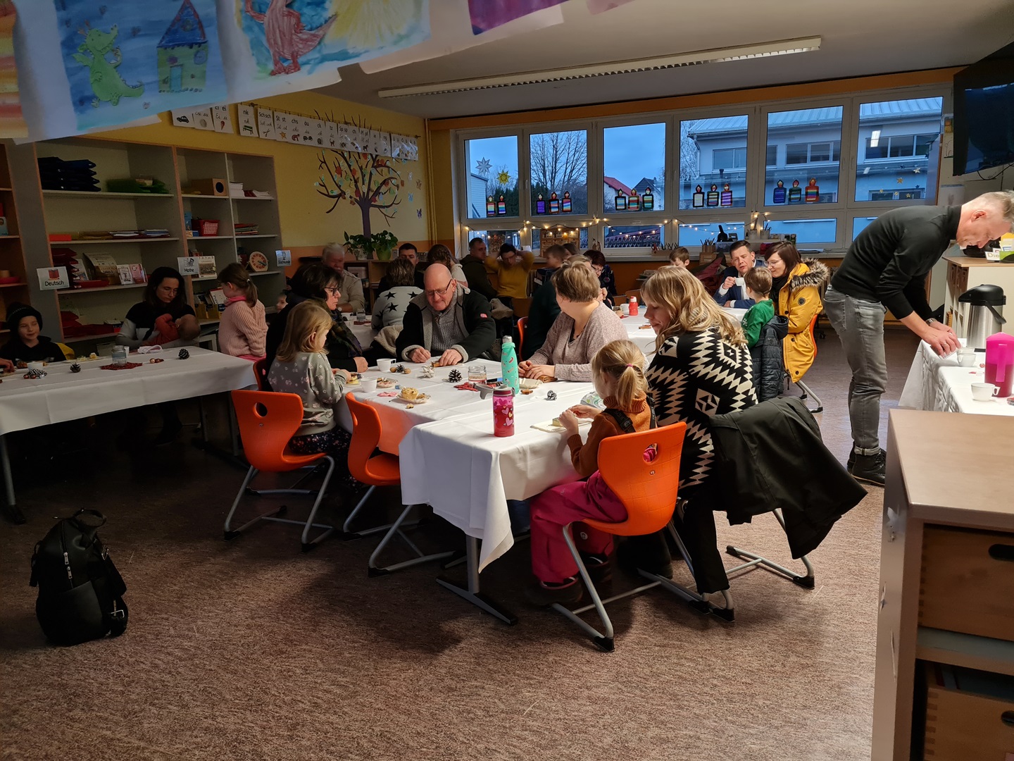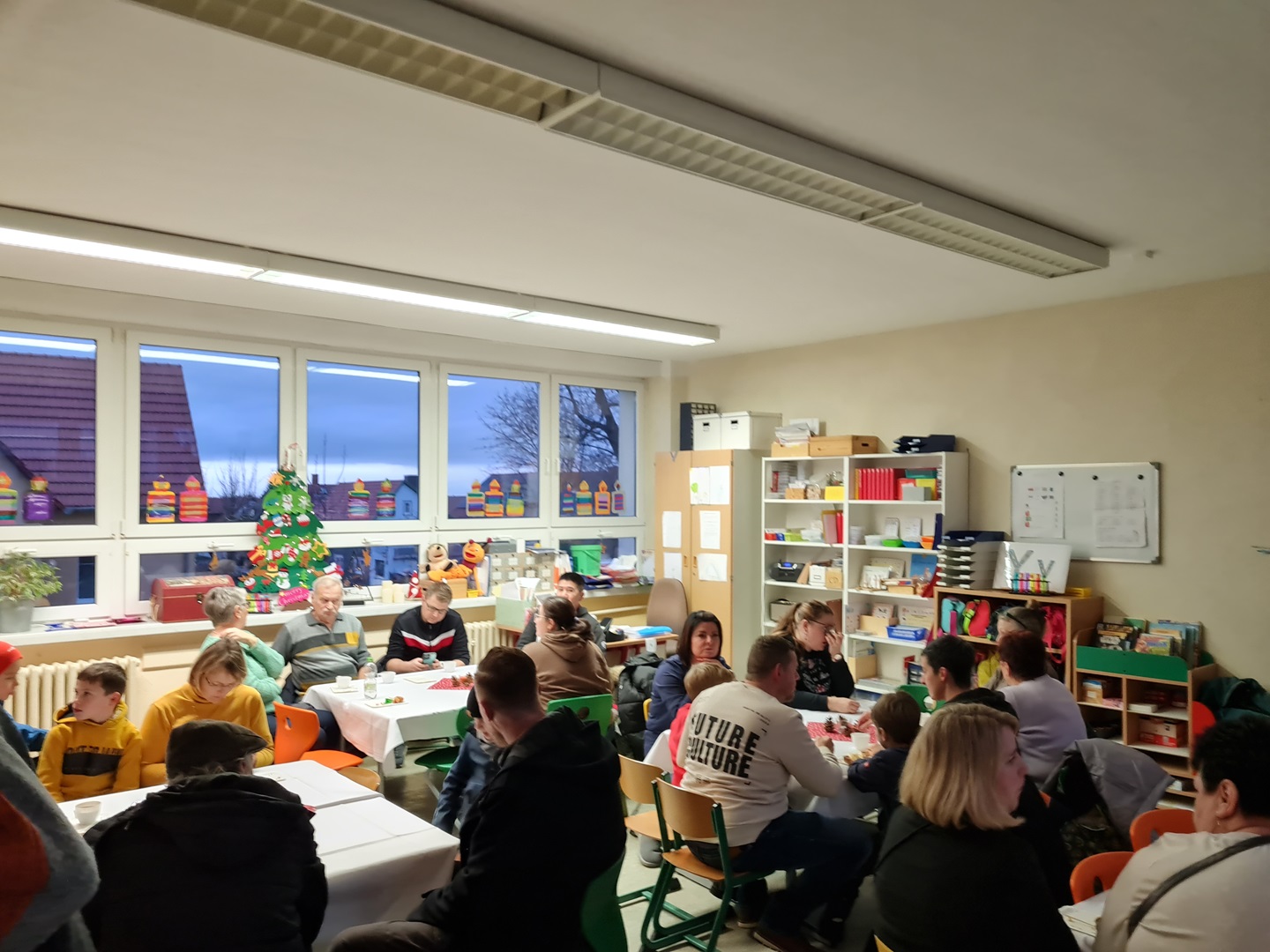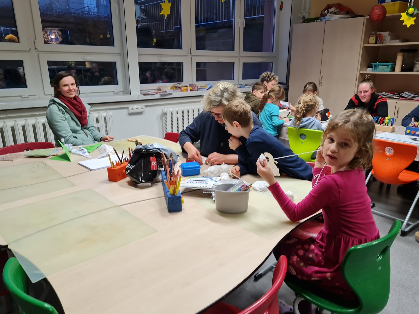 Vorher konnten sich die Eltern, Geschwister, Großeltern und Freunde bei Tee, Kaffee und leckeren selbstgebackenen Kuchen in aller Ruhe auf die Weihnachtsfeier einstimmen. In den weihnachtlich geschmückten Klassenräumen der 1/2 a, b und c war jeweils ein kleines "Cafe" vorbereitet wurden. Den Kuchen verkauften die Viertklässler im Speiseraum. Um die Zeit für die Kinder bis zu ihrem Auftritt zu verkürzen und die Aufregung zu mildern, boten Frau Bickel im Werken-Raum und die Erzieher im Hort Weihnachtsbasteleien an. So wurden z. B. Schneemänner aus Papptellern, Kerzen aus Servietten gebastelt oder weihnachtliche Motive „geprickelt“. Dann begaben sich alle in die Kirche und erwarteten gespannt das Weihnachtskonzert. Alle Schüler unserer Schule hatten gemeinsam mit Frau Linß ein buntes Programm vorbereitet. So spielte Pedro gemeinsam mit seinem Papa und Clemens Hartung zur musikalischen Begrüßung auf ihrer Trompete und Tuba „Ihr Kinderlein kommet“. Danach zeigte Juni aus der 2. Klasse ihr Können auf der Querflöte und spielte „Jingle Bells“. Die Klassen 1/2a, b und c trugen jeweils weihnachtliche Gedichte vor und sangen Weihnachtslieder. Die 3. Klasse überraschte das Publikum mit einer modernen Rap-Version vom Weihnachtslied „Morgen Kinder wird`s was geben“. Kinder der 4. Klasse führten das Weihnachts-Musical "Ein Dorf findet Weihnachten" auf. Für ihre Aufführungen ernteten alle Kinder jede Menge Applaus. Zum Abschluss der gelungenen Weihnachtsfeier spielten noch einmal die Trompeter das Lied „Oh du fröhliche“ und alle Besucher sangen gemeinsam mit.