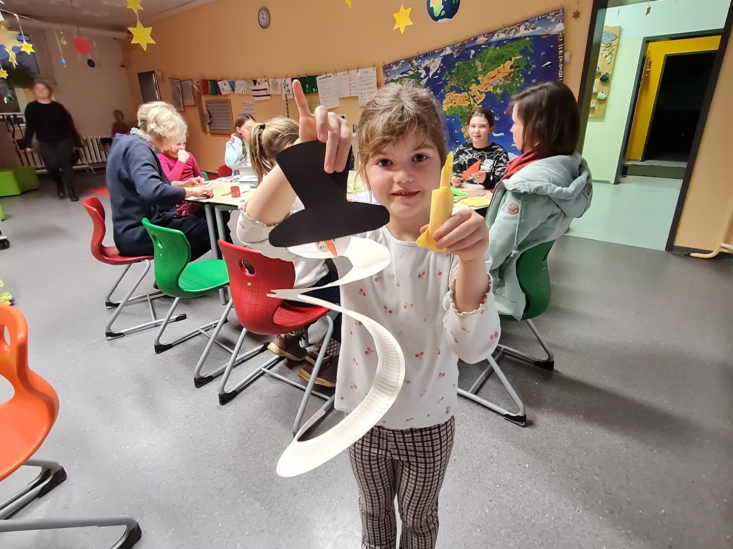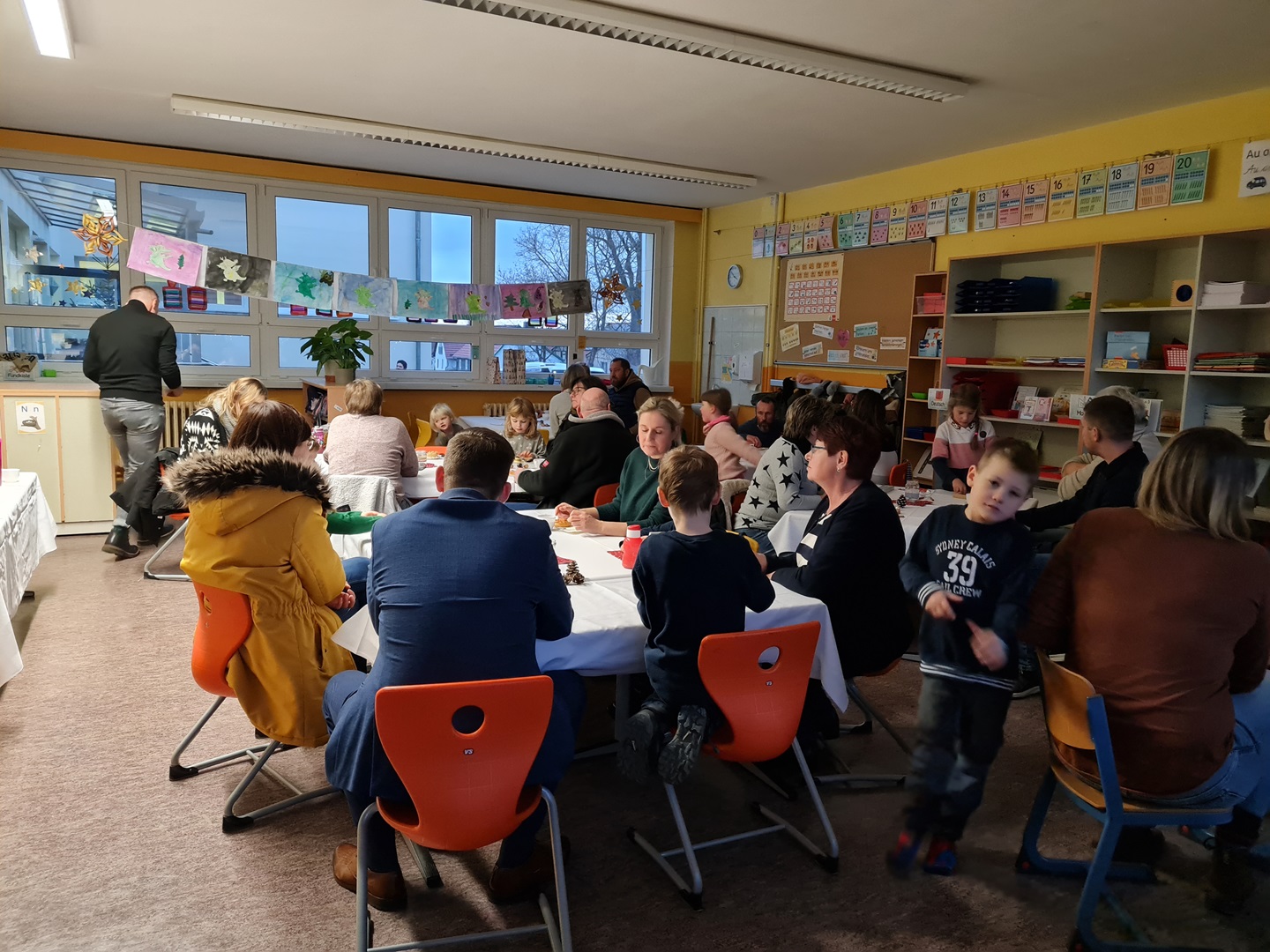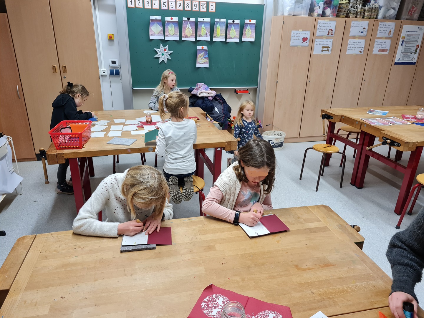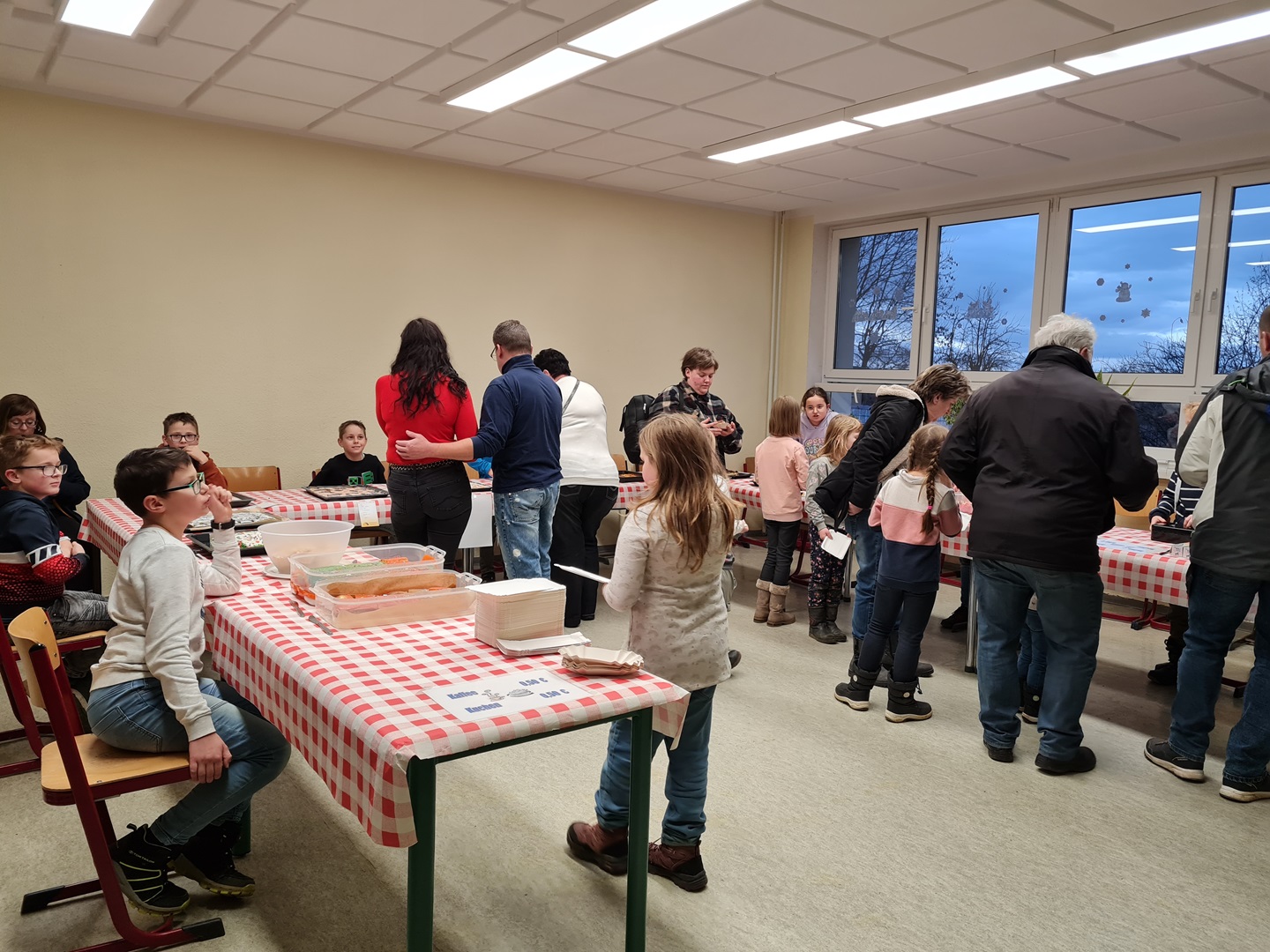 Vorher konnten sich die Eltern, Geschwister, Großeltern und Freunde bei Tee, Kaffee und leckeren selbstgebackenen Kuchen in aller Ruhe auf die Weihnachtsfeier einstimmen. In den weihnachtlich geschmückten Klassenräumen der 1/2 a, b und c war jeweils ein kleines "Cafe" vorbereitet wurden. Den Kuchen verkauften die Viertklässler im Speiseraum. Um die Zeit für die Kinder bis zu ihrem Auftritt zu verkürzen und die Aufregung zu mildern, boten Frau Bickel im Werken-Raum und die Erzieher im Hort Weihnachtsbasteleien an. So wurden z. B. Schneemänner aus Papptellern, Kerzen aus Servietten gebastelt oder weihnachtliche Motive „geprickelt“. Dann begaben sich alle in die Kirche und erwarteten gespannt das Weihnachtskonzert. Alle Schüler unserer Schule hatten gemeinsam mit Frau Linß ein buntes Programm vorbereitet. So spielte Pedro gemeinsam mit seinem Papa und Clemens Hartung zur musikalischen Begrüßung auf ihrer Trompete und Tuba „Ihr Kinderlein kommet“. Danach zeigte Juni aus der 2. Klasse ihr Können auf der Querflöte und spielte „Jingle Bells“. Die Klassen 1/2a, b und c trugen jeweils weihnachtliche Gedichte vor und sangen Weihnachtslieder. Die 3. Klasse überraschte das Publikum mit einer modernen Rap-Version vom Weihnachtslied „Morgen Kinder wird`s was geben“. Kinder der 4. Klasse führten das Weihnachts-Musical "Ein Dorf findet Weihnachten" auf. Für ihre Aufführungen ernteten alle Kinder jede Menge Applaus. Zum Abschluss der gelungenen Weihnachtsfeier spielten noch einmal die Trompeter das Lied „Oh du fröhliche“ und alle Besucher sangen gemeinsam mit.