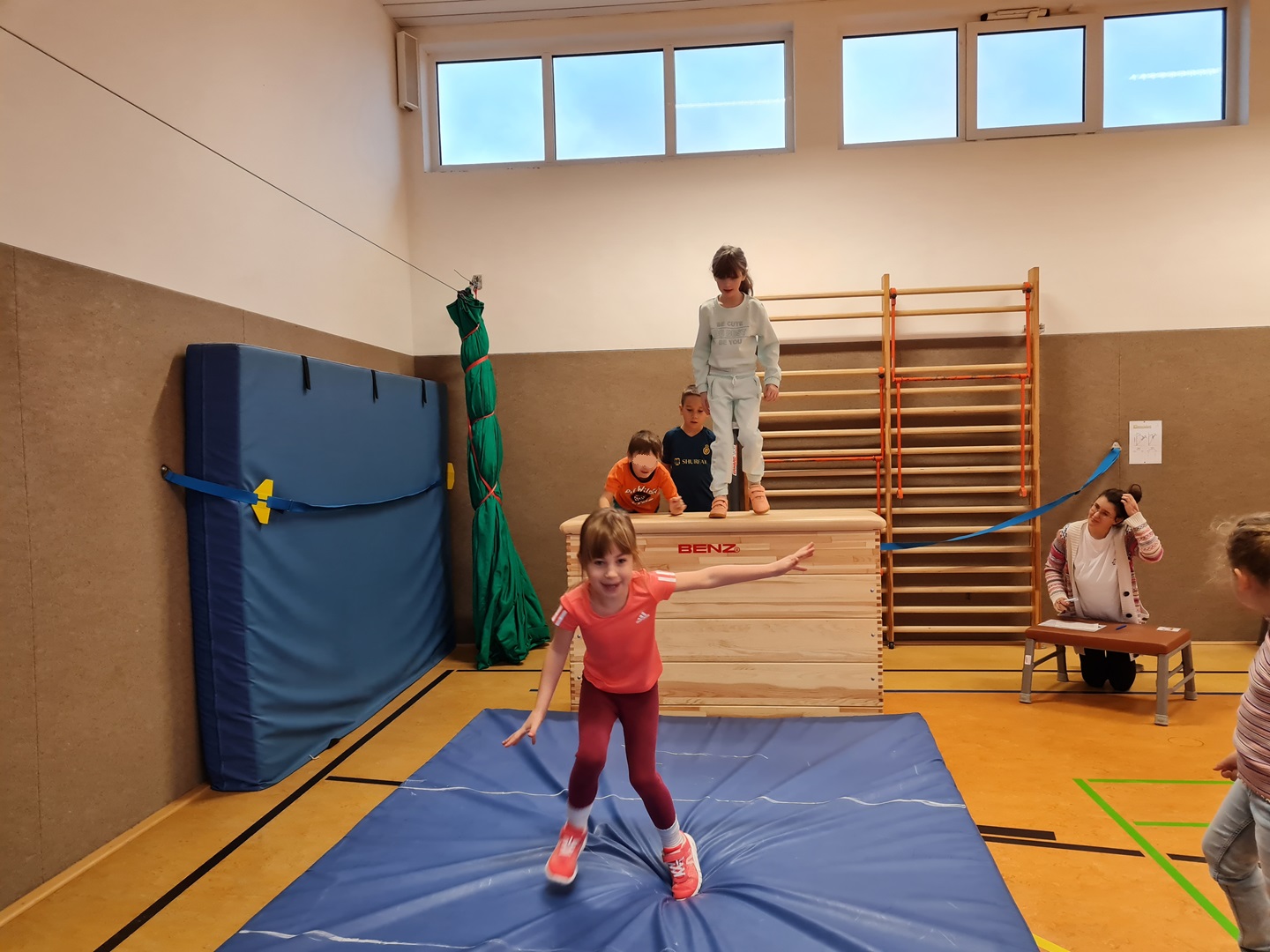 - Skispringen – Sprung vom Kasten auf die Matte und landen im Telemark