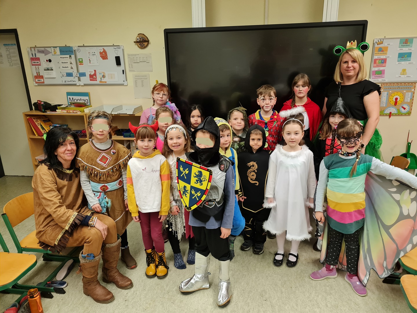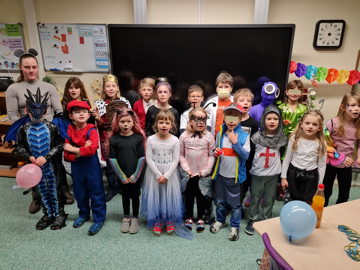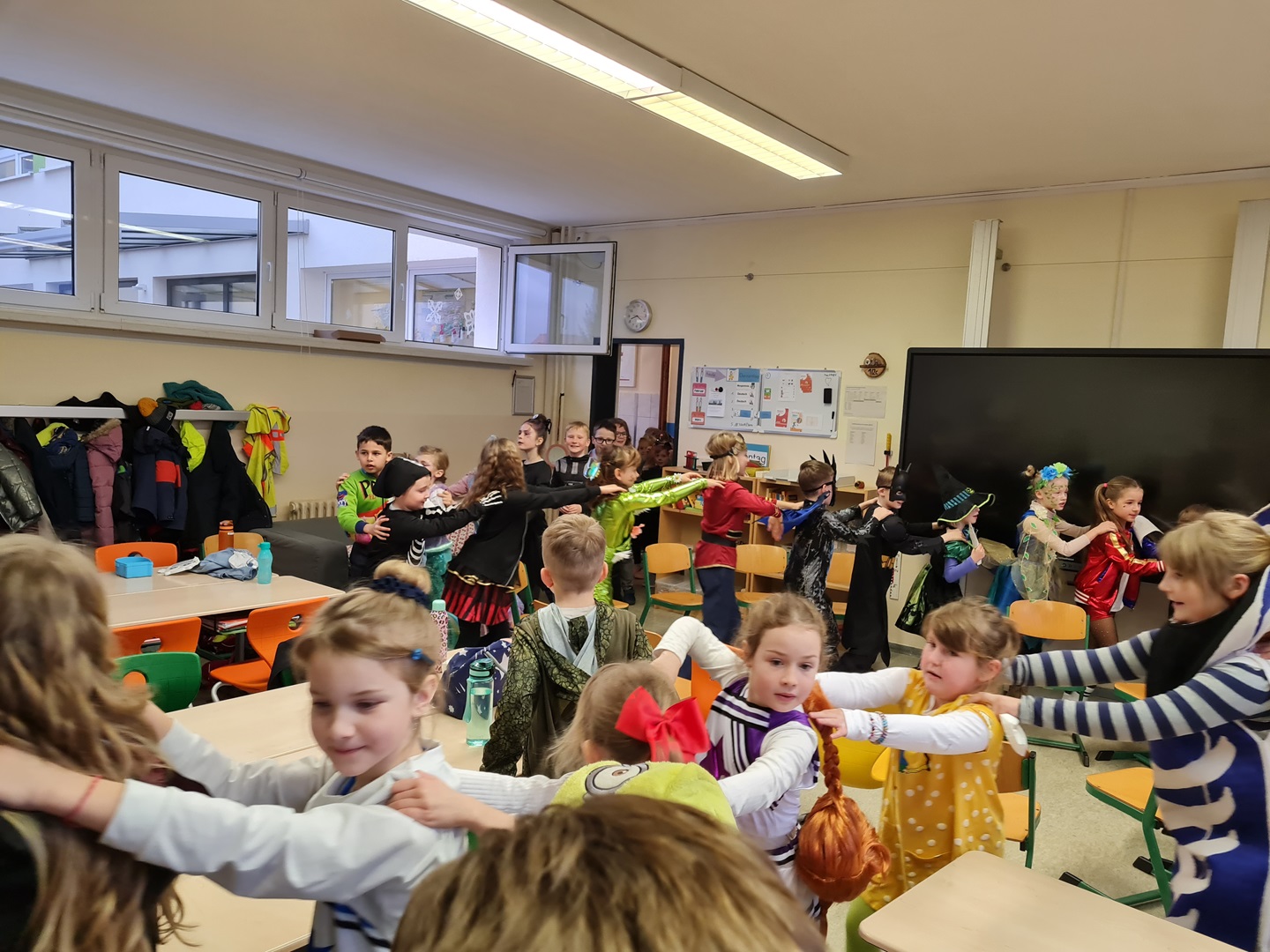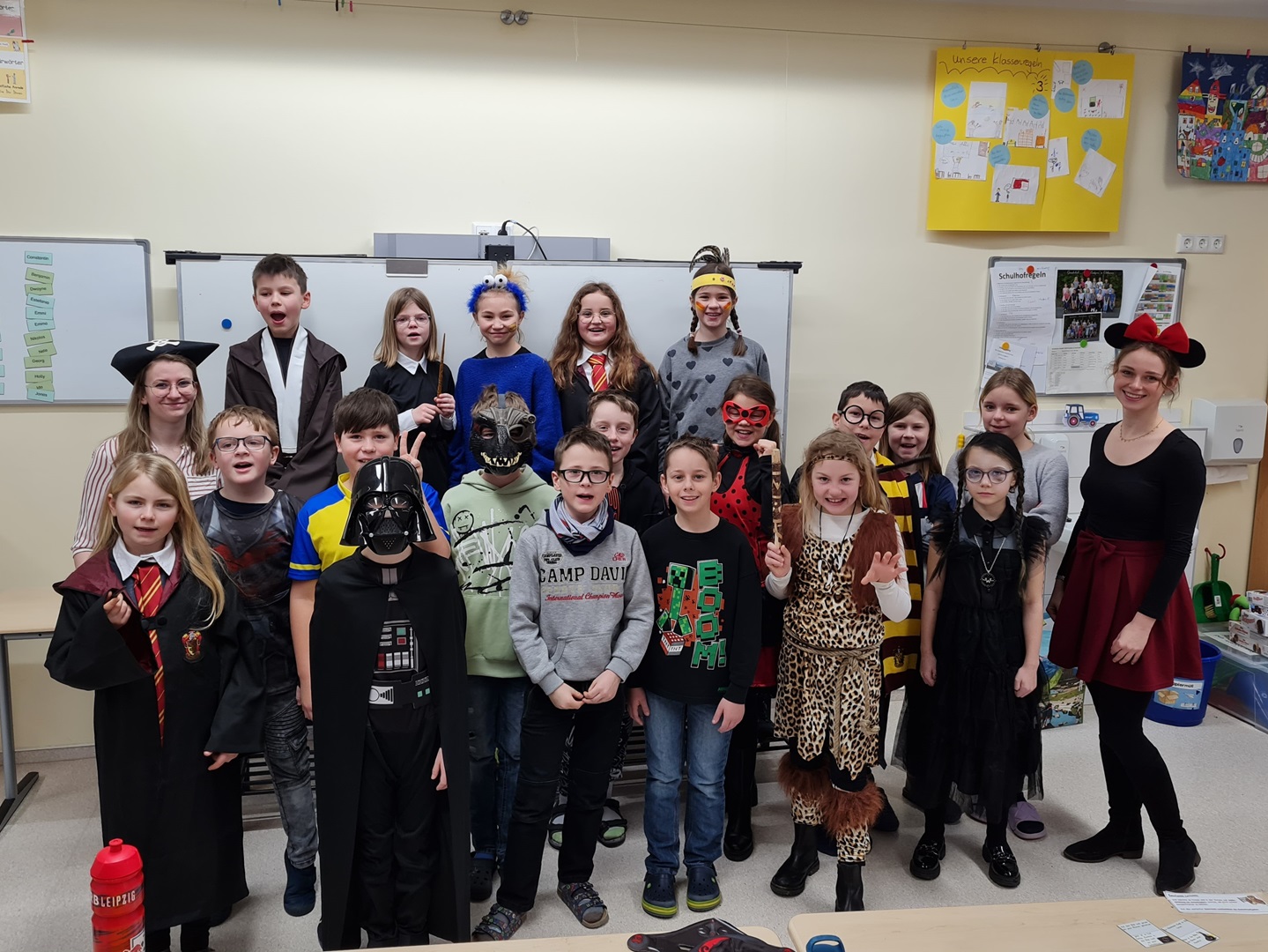 Den letzten Schultag mit Zeugnisausgabe verbanden wir in diesem Jahr mit einer Verkleidungsparty. Da die große Faschingsfeier in den Winterferien stattfindet, nutzte jede Klasse den heutigen Tag eine kleine Faschingsparty zu feiern. So erschienen die Kinder in ganz unterschiedlichen Kostümen am Morgen. In der Schule liefen plötzlich Ritter, Engel, Cheerleader, Hexen usw. sowie die verschiedensten Tiere herum. Jede Klasse feierte auf ihre Weise mit Musik und Tanz. Eine gemeinsame Polonaise aller Klassen gab es durch das ganze Schulhaus und die Klassenräume.