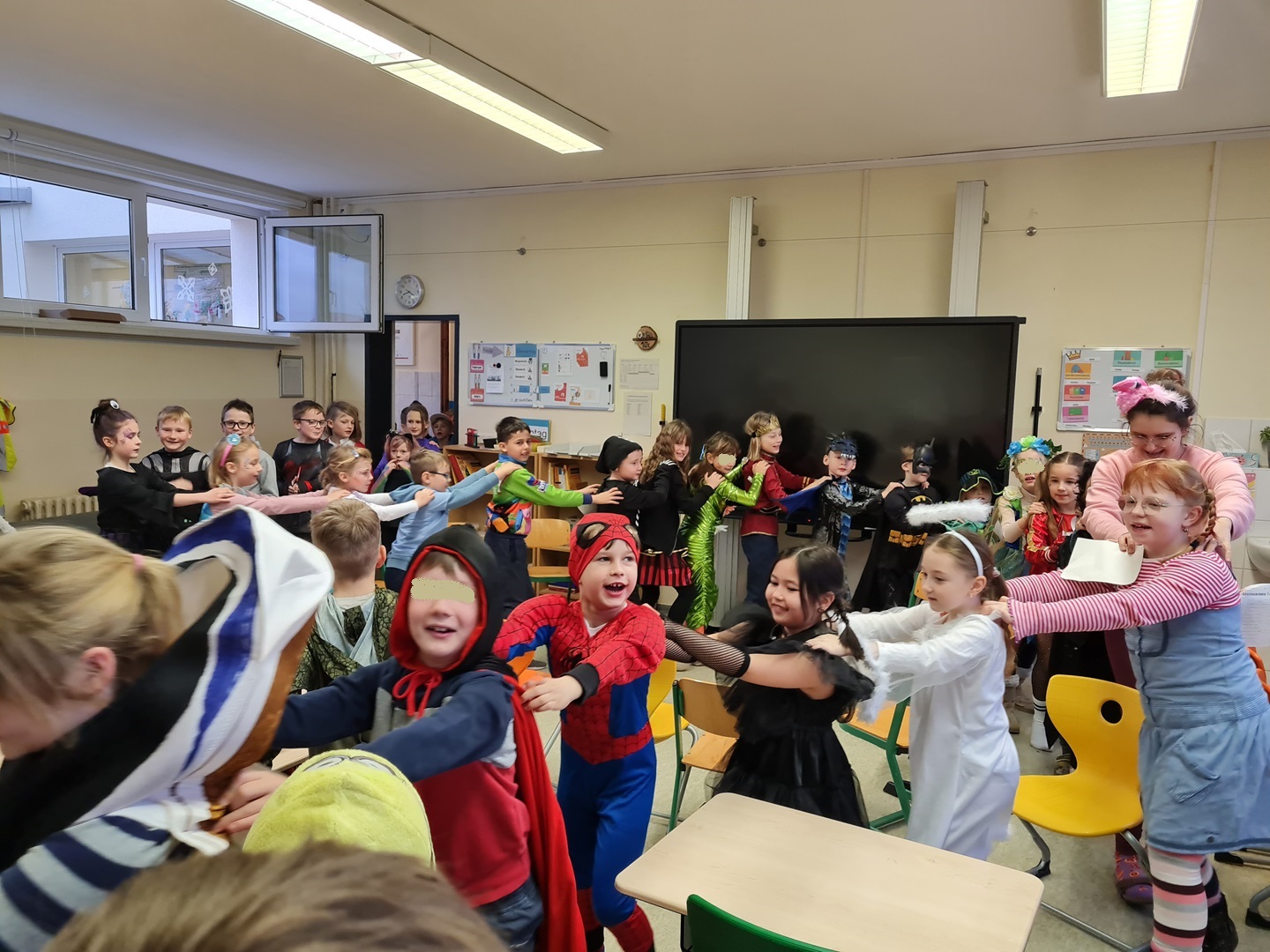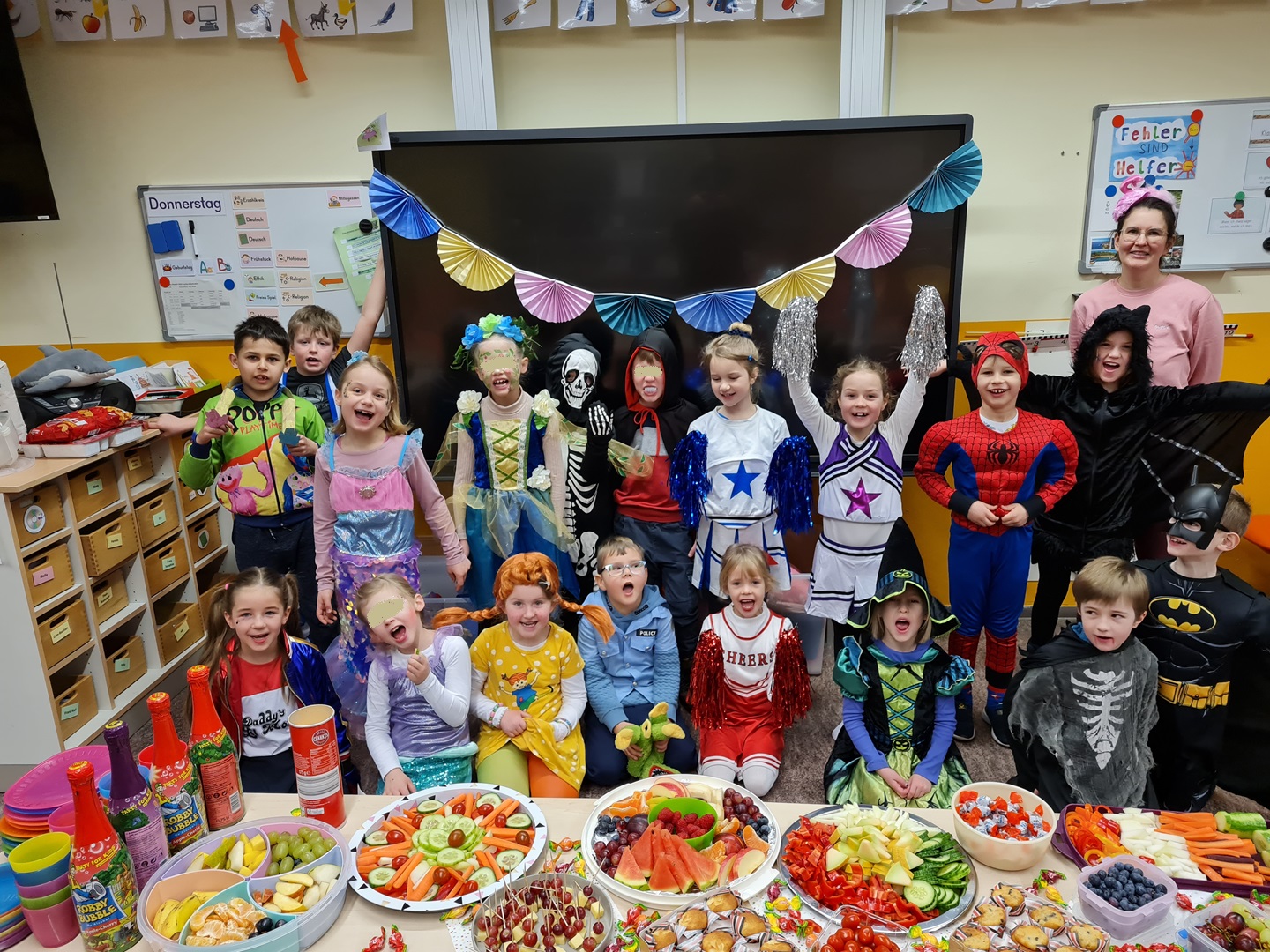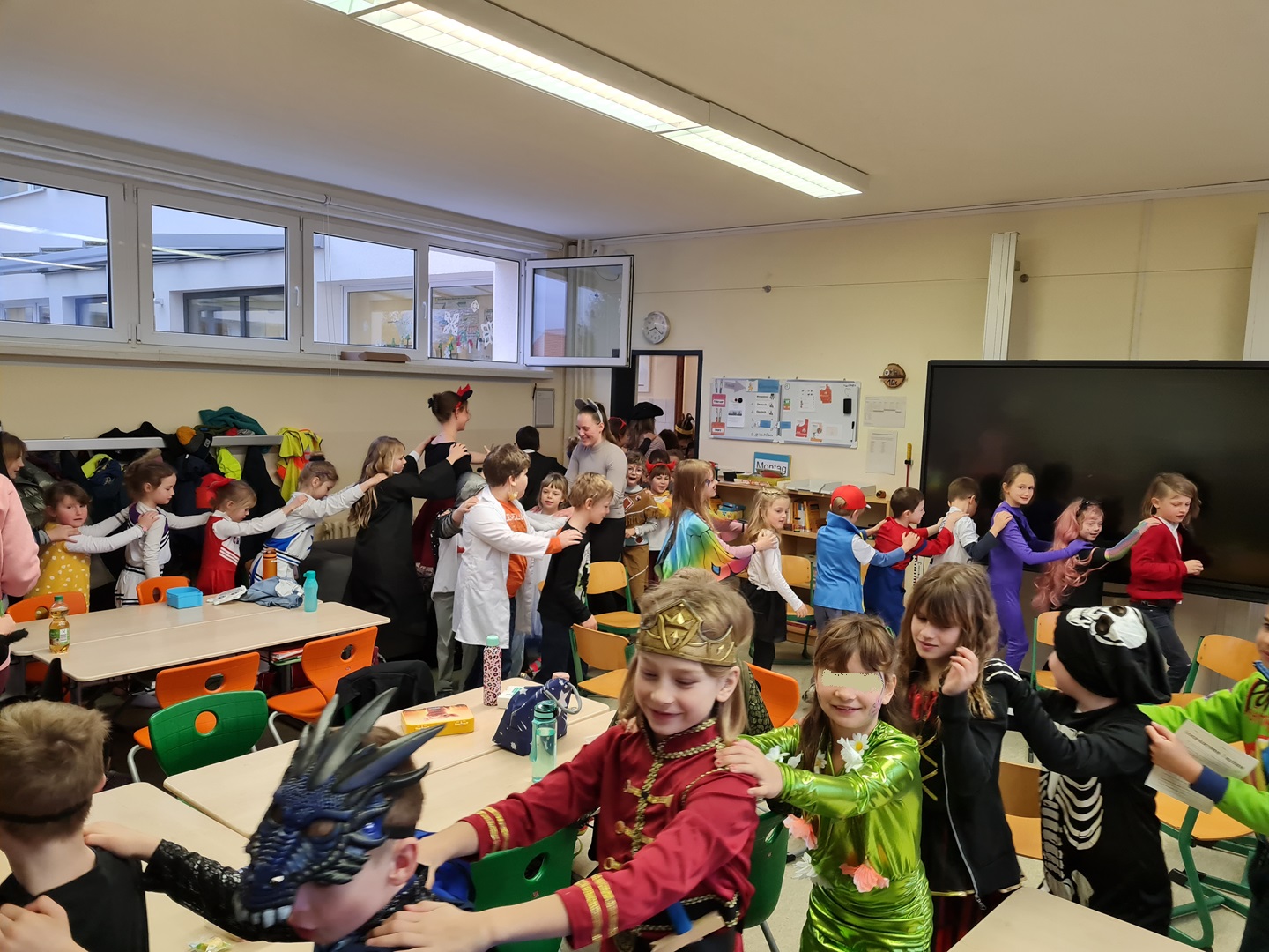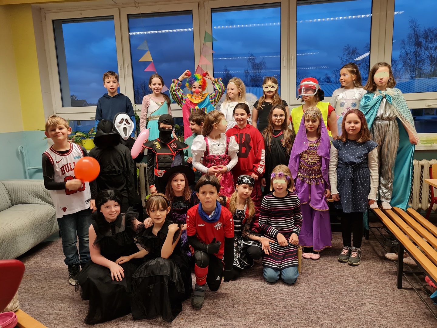 Den letzten Schultag mit Zeugnisausgabe verbanden wir in diesem Jahr mit einer Verkleidungsparty. Da die große Faschingsfeier in den Winterferien stattfindet, nutzte jede Klasse den heutigen Tag eine kleine Faschingsparty zu feiern. So erschienen die Kinder in ganz unterschiedlichen Kostümen am Morgen. In der Schule liefen plötzlich Ritter, Engel, Cheerleader, Hexen usw. sowie die verschiedensten Tiere herum. Jede Klasse feierte auf ihre Weise mit Musik und Tanz. Eine gemeinsame Polonaise aller Klassen gab es durch das ganze Schulhaus und die Klassenräume.