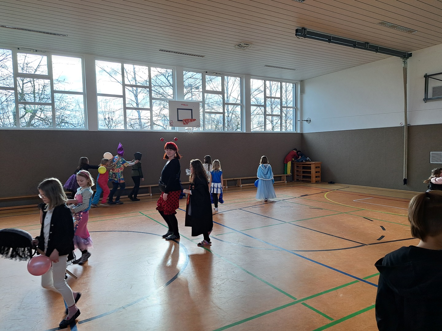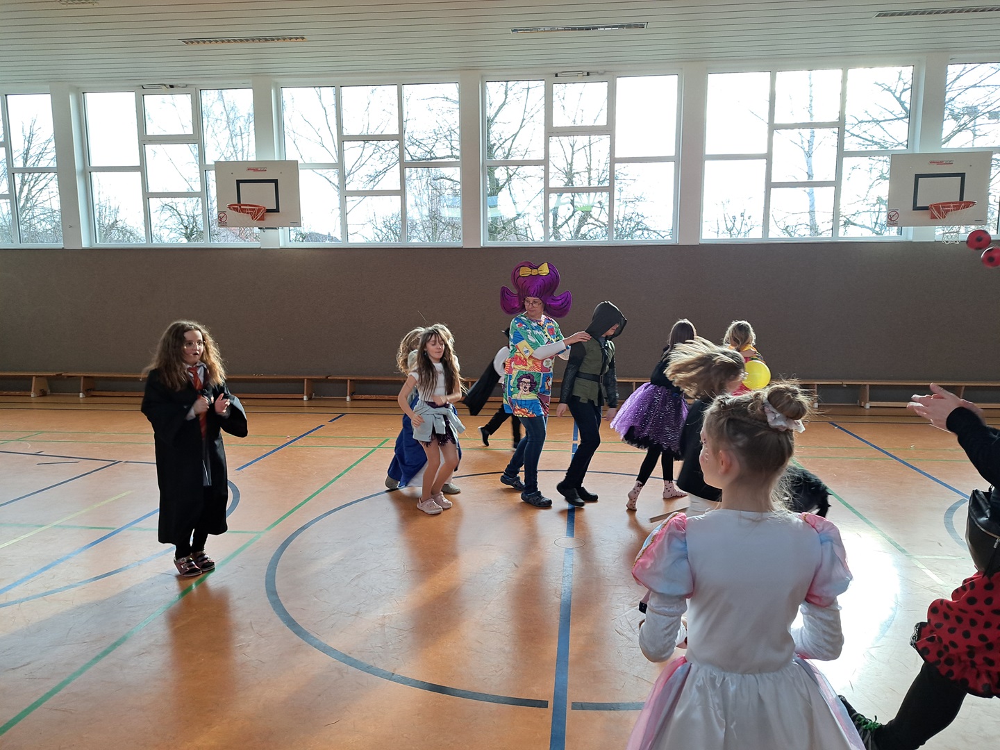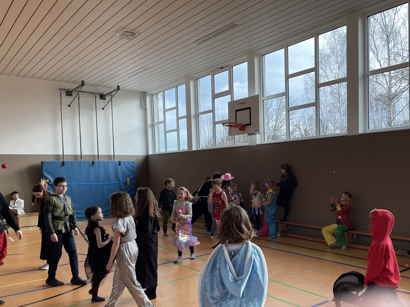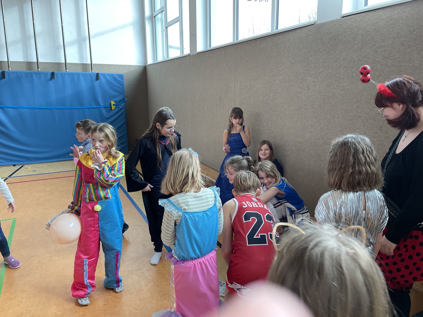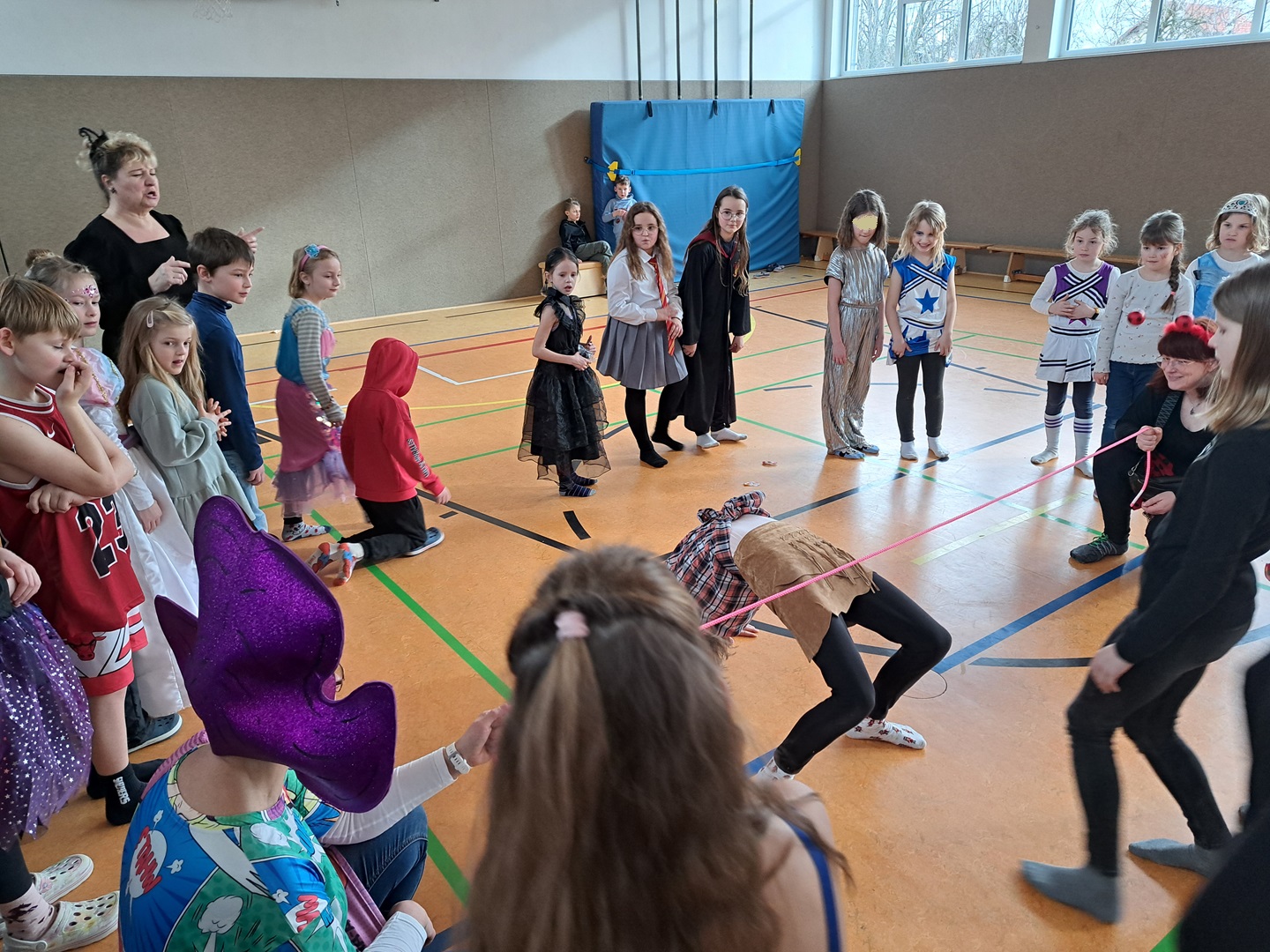 Am Montag in den Ferien feierten wir eine Faschingsparty. Es kamen fast alle Kinder mit tollen Kostümen. In der Turnhalle macht der blaue SchreiBär coole Musik. Wir spielten Zeitungstanz, Feuer, Wasser, Sand und tanzten Limbo. Zwischendurch wurden viele leckeren Bonbons geworfen. Auf einem Laufsteg zeigte jeder sein Kostüm. Eine Jury, bestehend aus Frau Müller und 3 nicht verkleideten Kindern, bewerteten die Kostüme und entschieden sich für 3 Paare mit gleichen Kostümen, Cheerleader , Wednesday mit den eiskalten Händchen. Zum Schluss bekamen alle Kinder einen kleinen Preis.