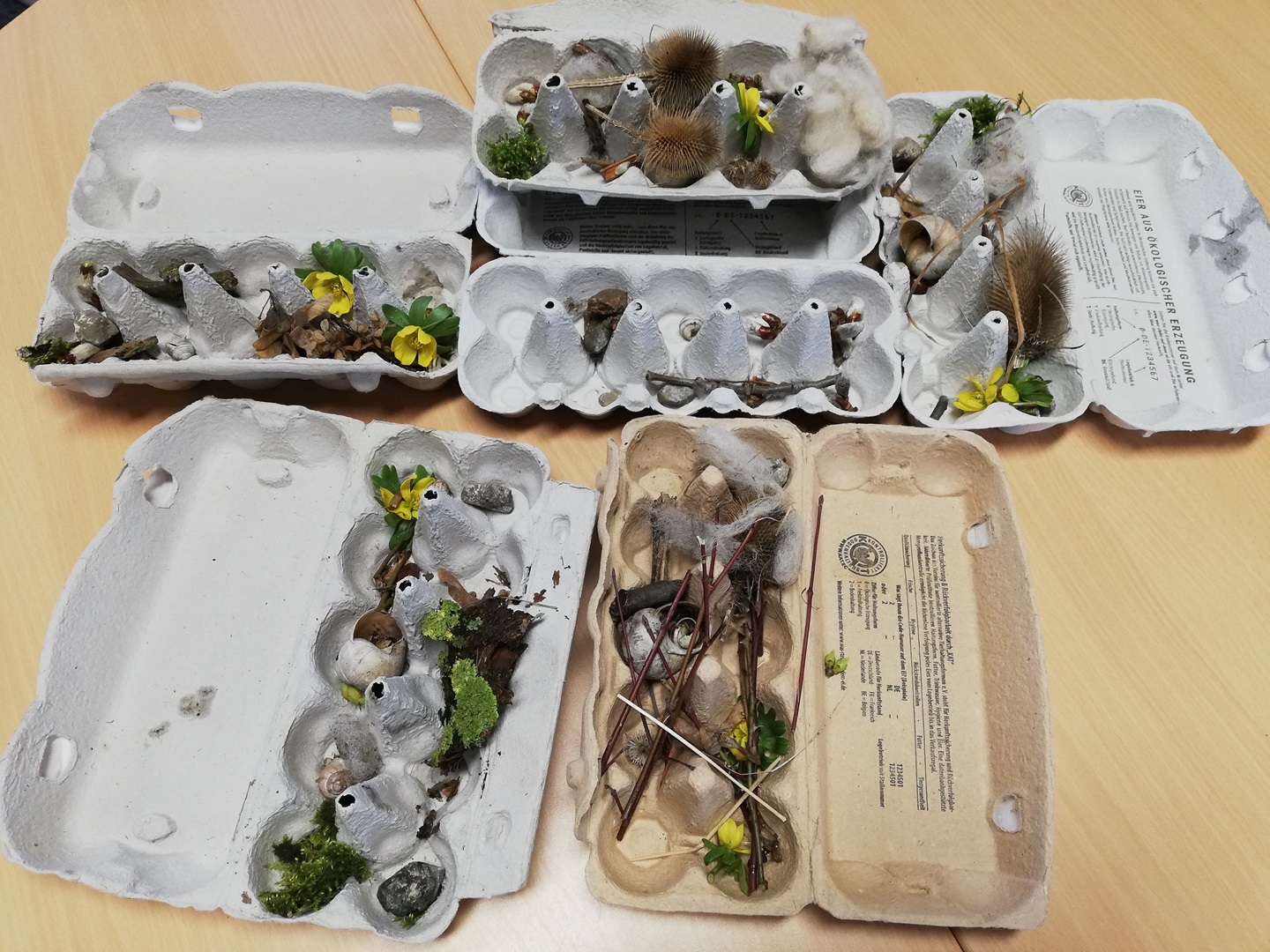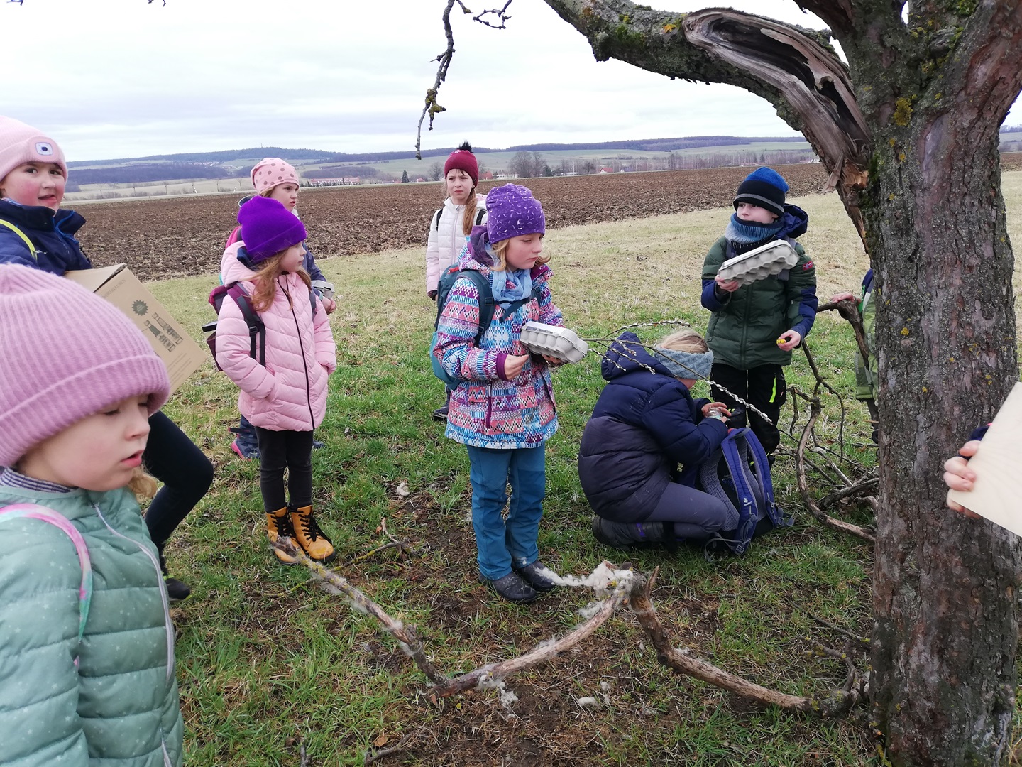 Am Donnerstag führte uns eine Vorfrühlingswanderung nach Wülfershausen. Unterwegs füllten die Kinder eine Sammelbox mit verschiedenen Naturschätzen. Es galt also aufmerksam den Blick rechts und links des Weges schweifen zu lassen. Die Boxen füllten sich entsprechend der gestellten Aufgaben mit Rinde, Moos, Schneckenhäusern, spitzen und weichen Naturmaterialien wie Dornen oder Schafsfellresten, Blüten, alten Samenständen, Zweiglein, Steinen und Knospen. In Wülfershausen bestand die Herausforderung, die alte Schule zu finden und auch dort einen kleinen Schatz zu erbeuten. Zwischendurch stärkten wir uns bei einem Picknick auf dem Spielpatz des Dorfes und natürlich war hier auch Spielzeit eingeplant.