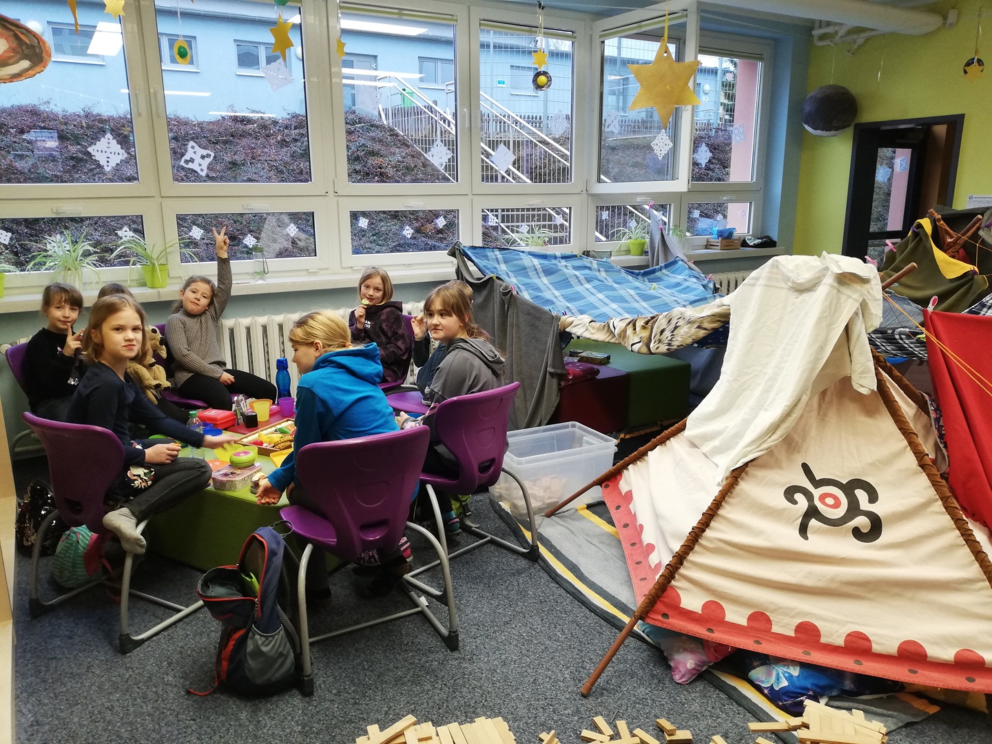 Außerdem nutzen die Mädchen und Jungen diesen Tag zu intensivem und kreativem Spiel. Im Hortraum entstand aus Möbeln, Indianerzelten, Decken und Kissen ein Hotelbetrieb.