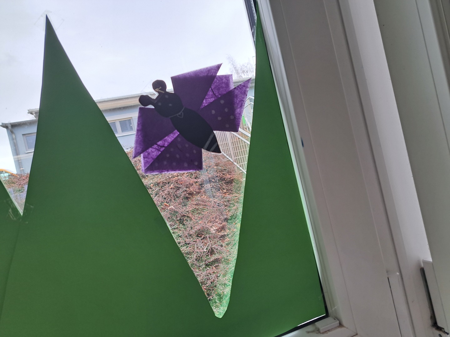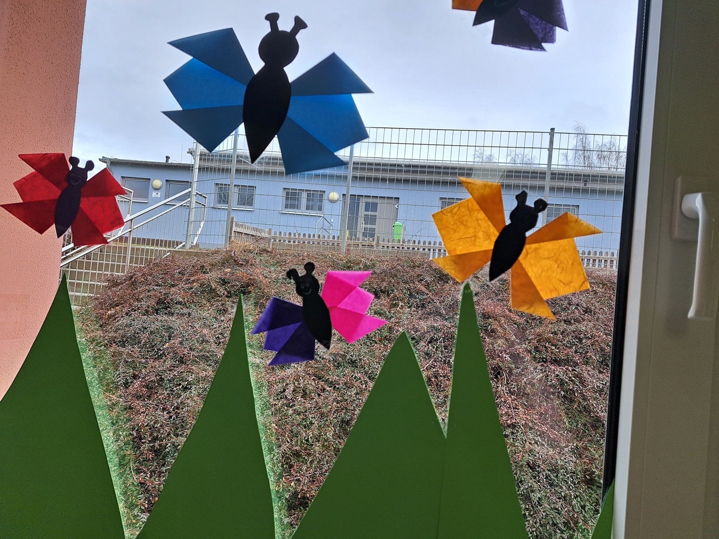 Am Freitag waren wir kreativ. Wir haben den Frühling in den Hort eingeladen und Schmetterlinge gefaltet, um unsere Fenster zu dekorieren.