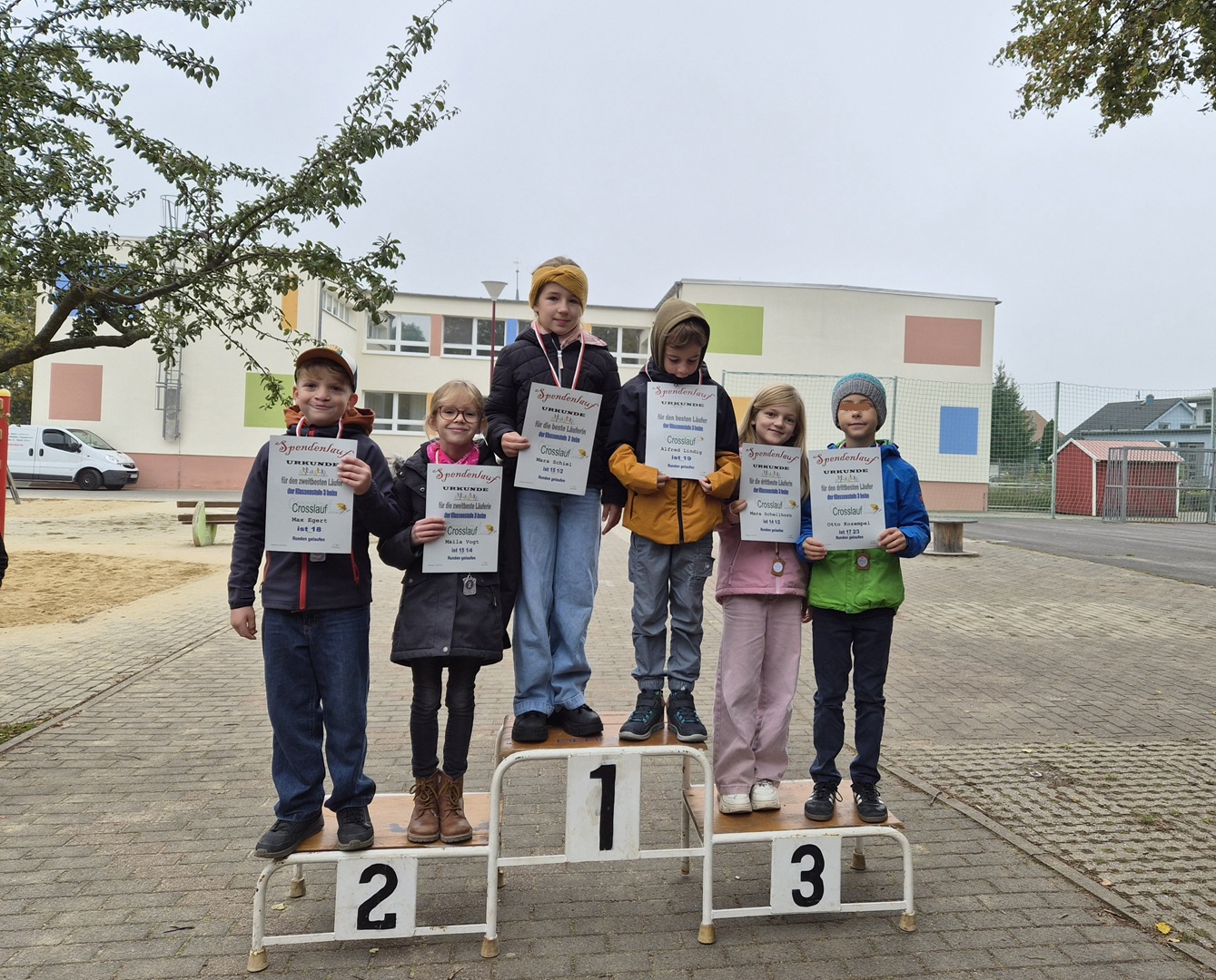 Die Crosslauf-Siegerehrung fand am Mittwoch, den 01.10.2025, statt und wurde bereits sehnsüchtig erwartet. Die drei Erstplatzierten jeder Klassenstufe erhielten Medaillen und Urkunden. Zudem erhielt jeder Teilnehmer eine Urkunde, denn alle haben durch ihre sportliche Leistung gewonnen.