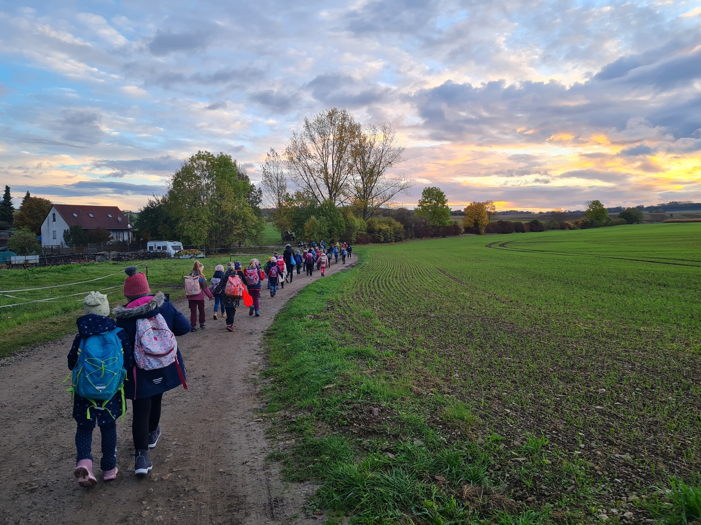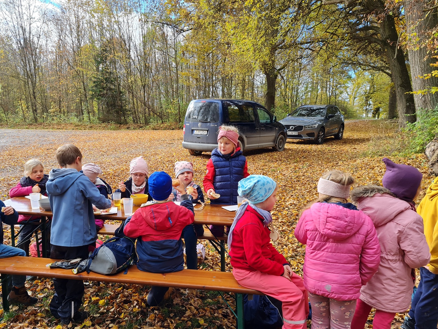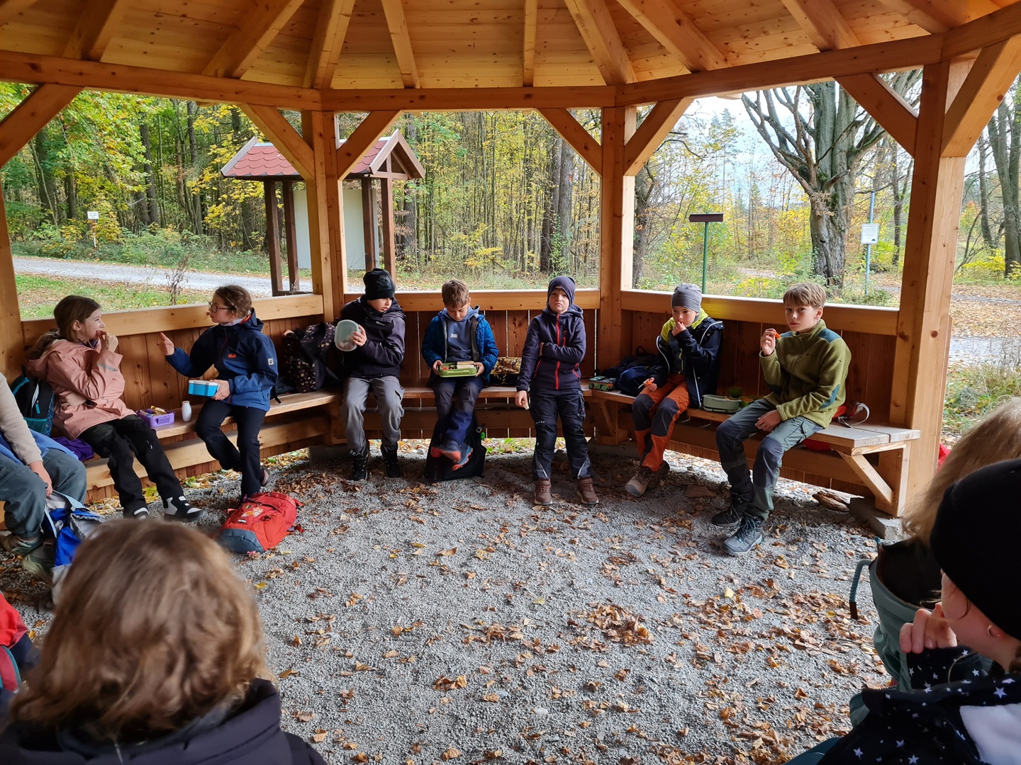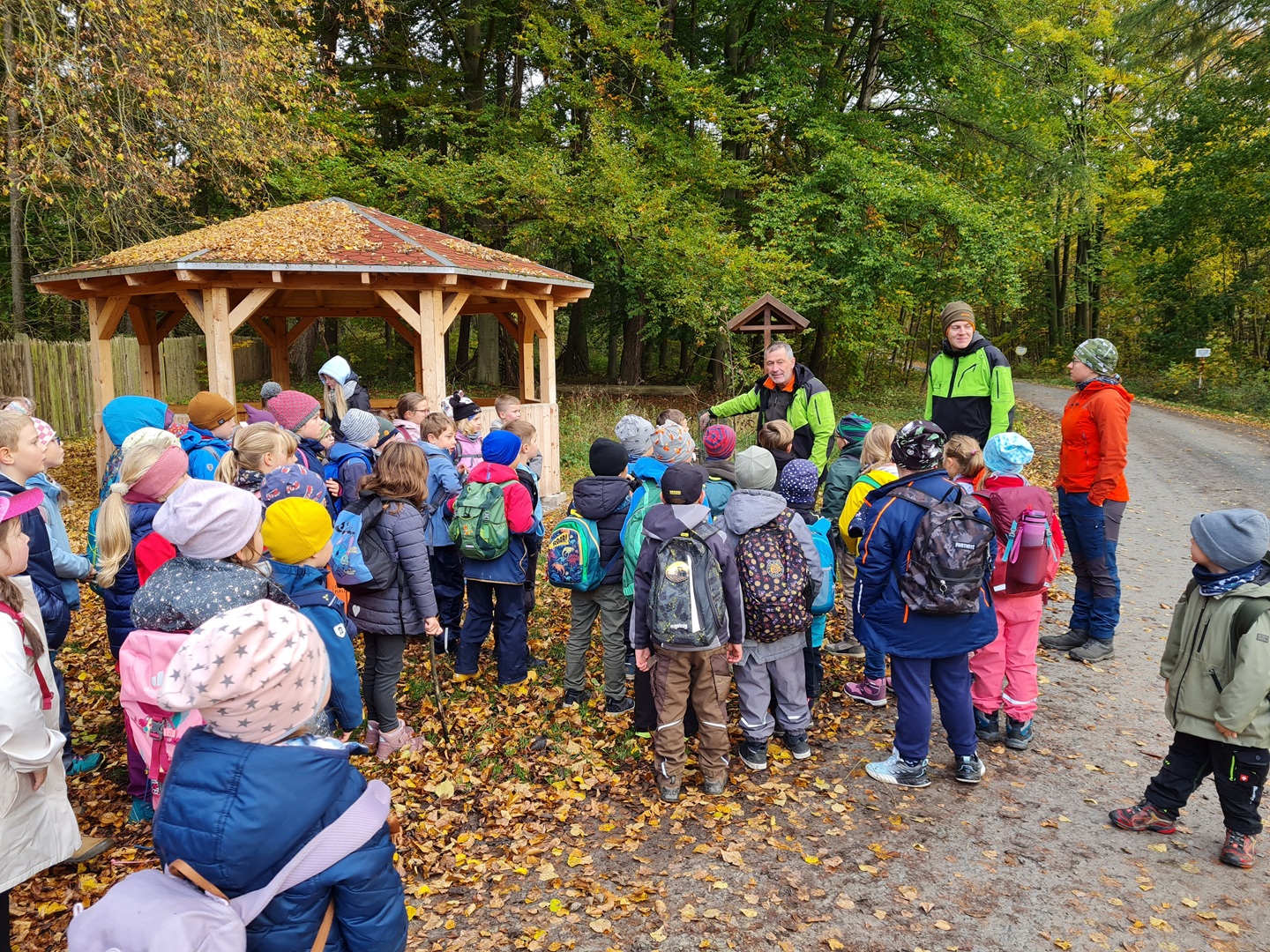 Am Dienstag, den 21.10.2025, und am Mittwoch, den 22.10.2025, machten sich alle Klassen 1 bis 4 der Grundschule auf ihren Wandertag in den Osthäuser Wald. Bei herrlich herbstlichem Wetter – an beiden Tagen zeigte sich sogar die Sonne – liefen wir gemeinsam zum Waldhäuschen. Der Weg dorthin wurde durch kleine Entdeckungen und das Sammeln von Kastanien, Eicheln und anderen Waldfunden kurzweilig und spannend gestaltet.