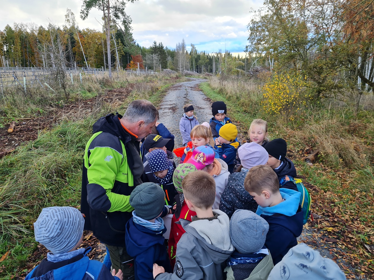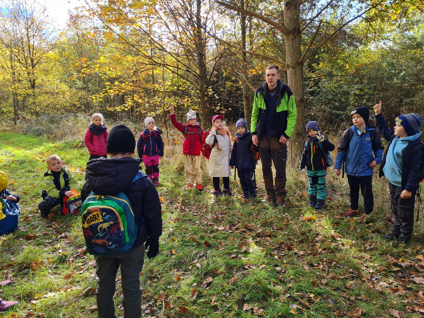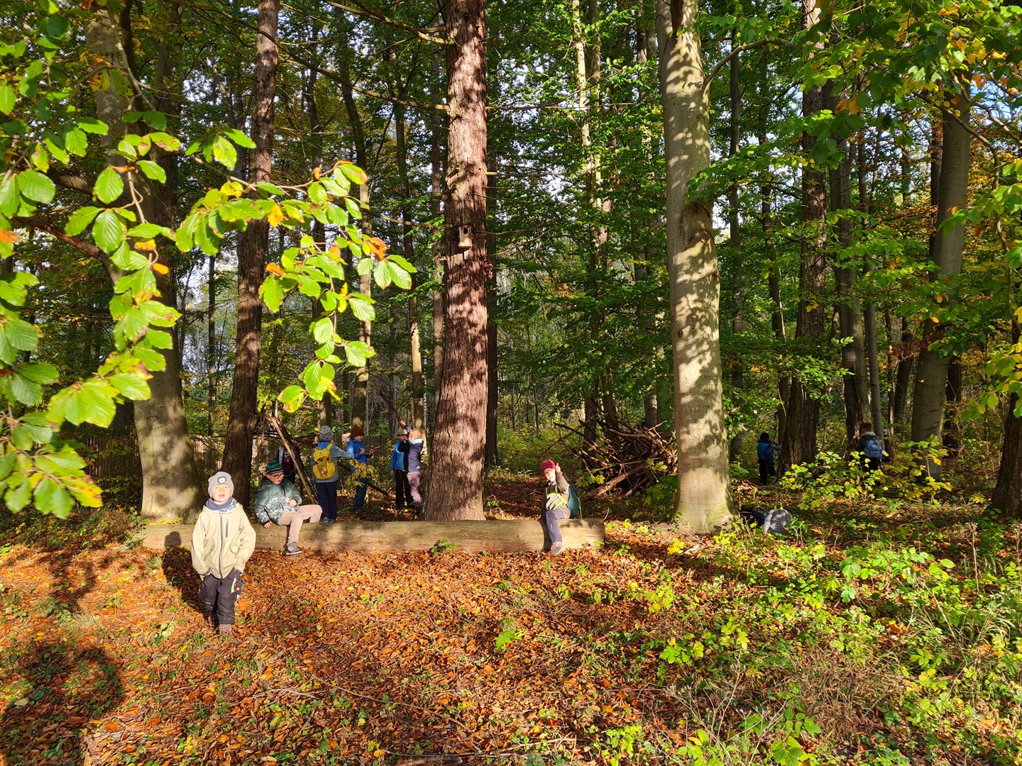 Am ersten Tag starteten die Erst- und Zweitklässler ihr Waldabenteuer. Nach einer Frühstückspause begrüßten uns Mitarbeiter des Thüringen Forst und erklärten, dass wir als „Waldretter“ unterwegs seien. Der Wald rund um Osthausen ist durch Trockenheit und den Borkenkäfer stark geschädigt – wir wollten helfen, ihn wieder aufzuforsten. Mit großem Eifer vergruben die Kinder ihre gesammelten Kastanien, Eicheln und Hickorynüsse im Boden, in der Hoffnung, dass daraus in den nächsten Jahren neue Bäume wachsen. Anschließend standen verschiedene Waldspiele auf dem Programm, etwa „Luchs und Reh“ oder „Motte und Fledermaus“. Dabei war besonders Ruhe und gutes Gehör gefragt – was für viel Spaß sorgte.