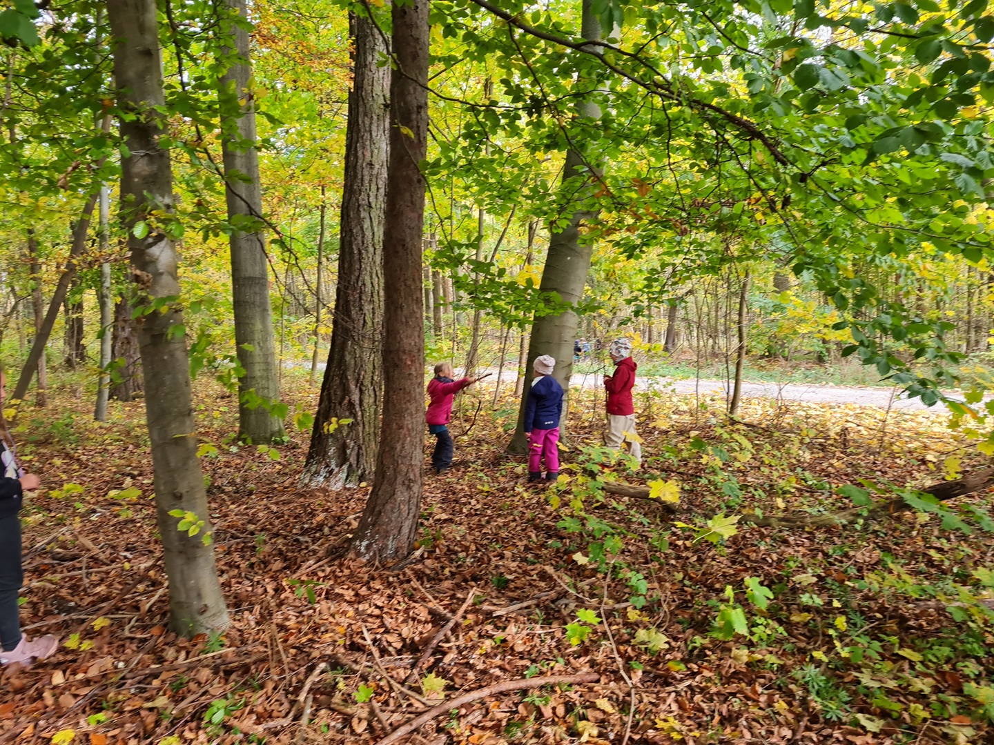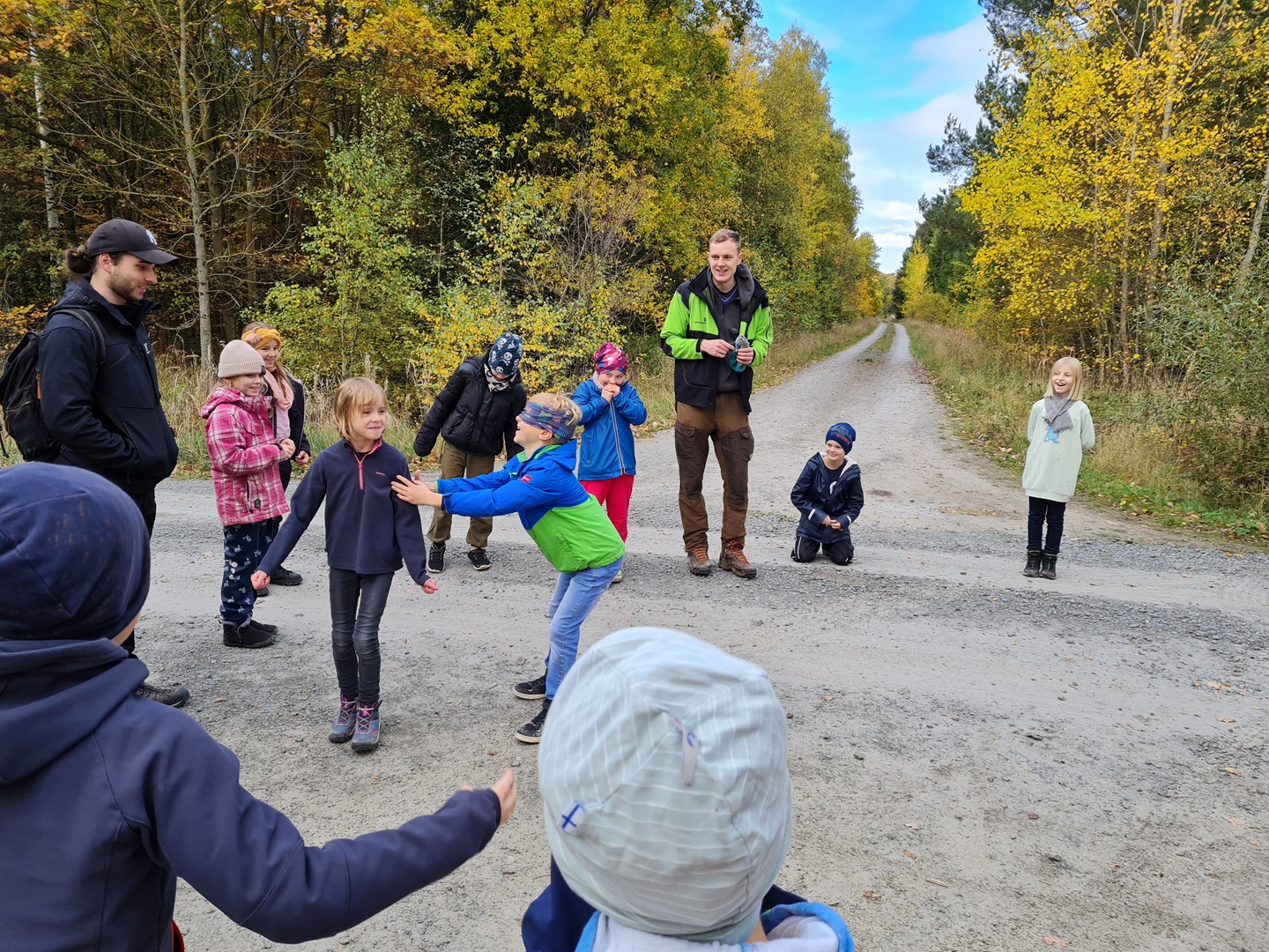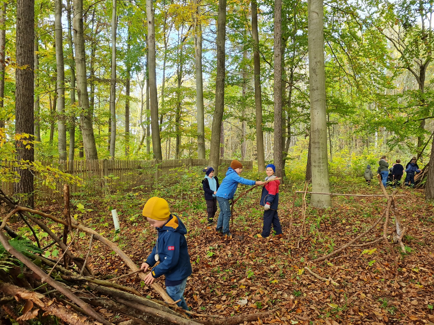 Am ersten Tag starteten die Erst- und Zweitklässler ihr Waldabenteuer. Nach einer Frühstückspause begrüßten uns Mitarbeiter des Thüringen Forst und erklärten, dass wir als „Waldretter“ unterwegs seien. Der Wald rund um Osthausen ist durch Trockenheit und den Borkenkäfer stark geschädigt – wir wollten helfen, ihn wieder aufzuforsten. Mit großem Eifer vergruben die Kinder ihre gesammelten Kastanien, Eicheln und Hickorynüsse im Boden, in der Hoffnung, dass daraus in den nächsten Jahren neue Bäume wachsen. Anschließend standen verschiedene Waldspiele auf dem Programm, etwa „Luchs und Reh“ oder „Motte und Fledermaus“. Dabei war besonders Ruhe und gutes Gehör gefragt – was für viel Spaß sorgte.
