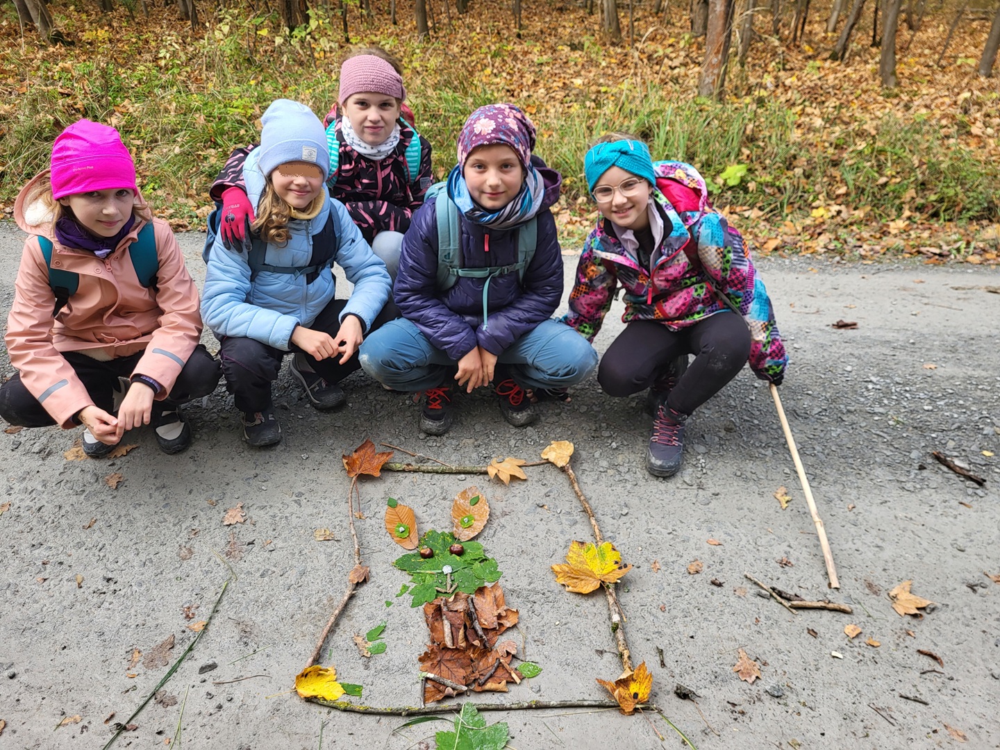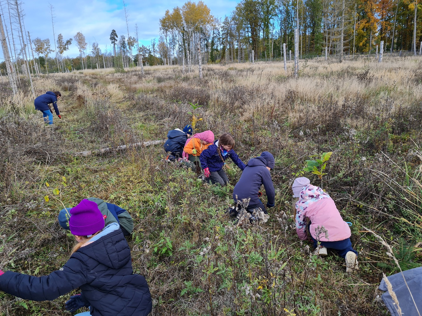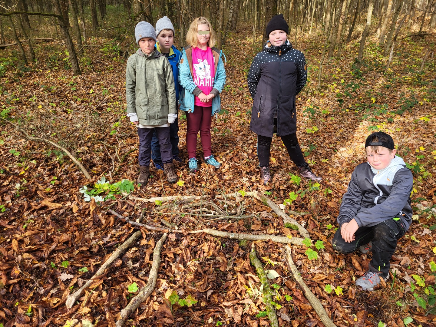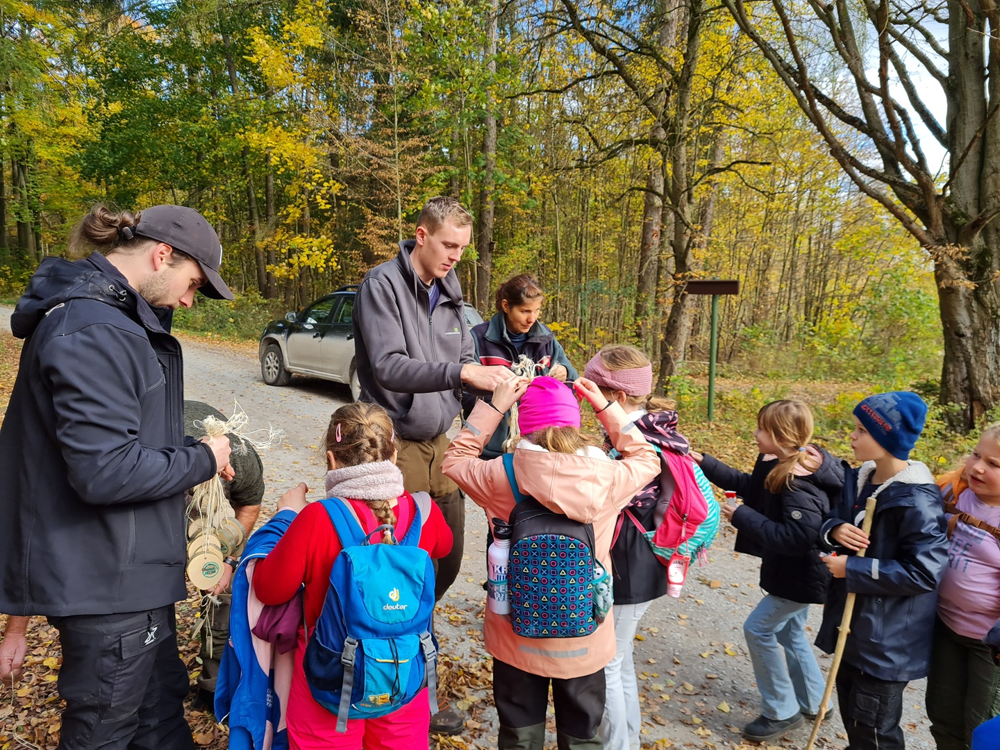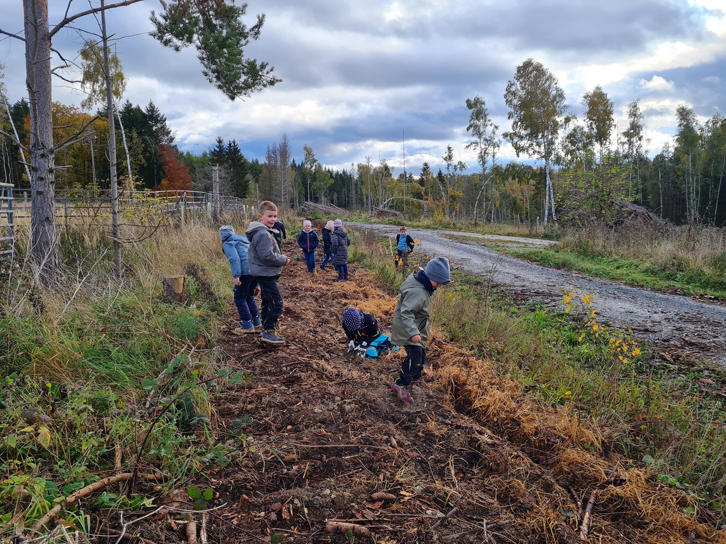 Am zweiten Tag folgten die Dritt- und Viertklässler. Auch sie frühstückten zunächst am Waldhäuschen und nutzten die Zeit für erste kleine Spiele und Erkundungen. Danach übernahmen die Viertklässler die Pflanzaktion: Auf einer vorbereiteten Fläche pflanzte jedes Kind eine Douglasie, eine Baumhasel und eine Eiche. Die Setzlinge mussten fest angedrückt werden, um gut anwachsen zu können. Da die Gruppe sehr schnell arbeitete, blieb noch Zeit, um Früchte des seltenen Speierlings zu sammeln. Die Drittklässler erkundeten währenddessen den Wald auf spielerische Weise. Bei einem Erkundungsauftrag suchten sie gezielt Dinge im Wald – etwa etwas Spitzes, Rotes oder Weiches – und stellten später staunend fest, wie vielfältig die Natur ist. Auch sie spielten das Spiel "Motte und Fledermaus" und sammelte für weitere Pflanzaktionen Esskastanien- Natürlich wurden die Aufgaben anschließend getauscht: Auch die Drittklässler pflanzten kleine Bäumchen, während die Viertklässler kreativ wurden und aus Naturmaterialien Waldtiere gestalteten. Es war spannend zu beobachten, wie unterschiedlich diese Aufgabe bewältigt wurde.