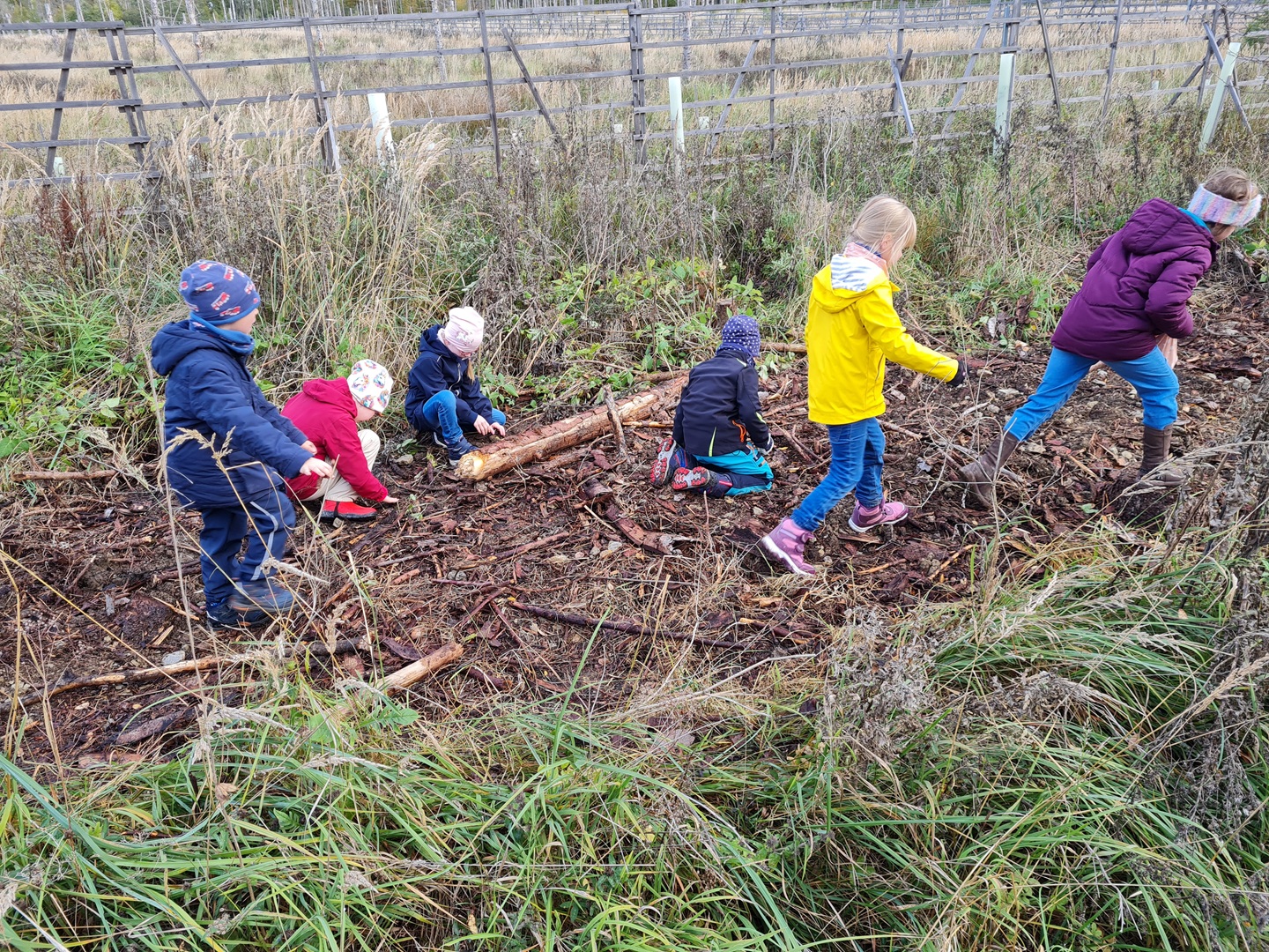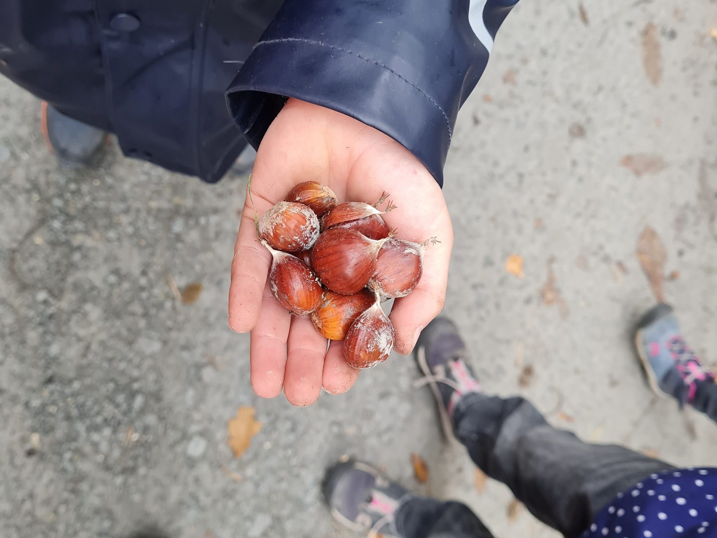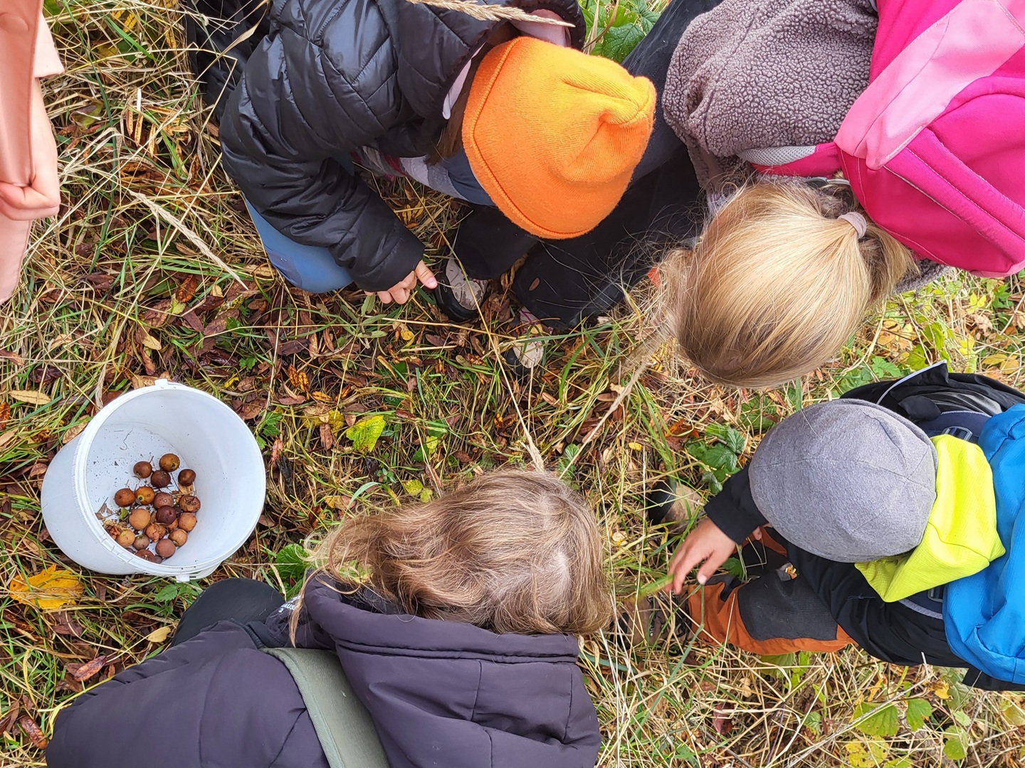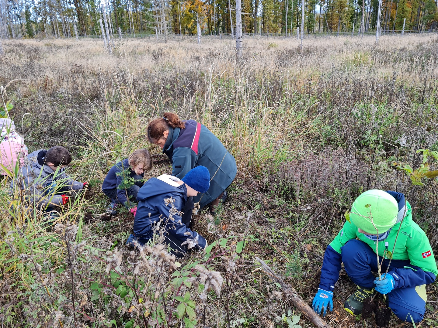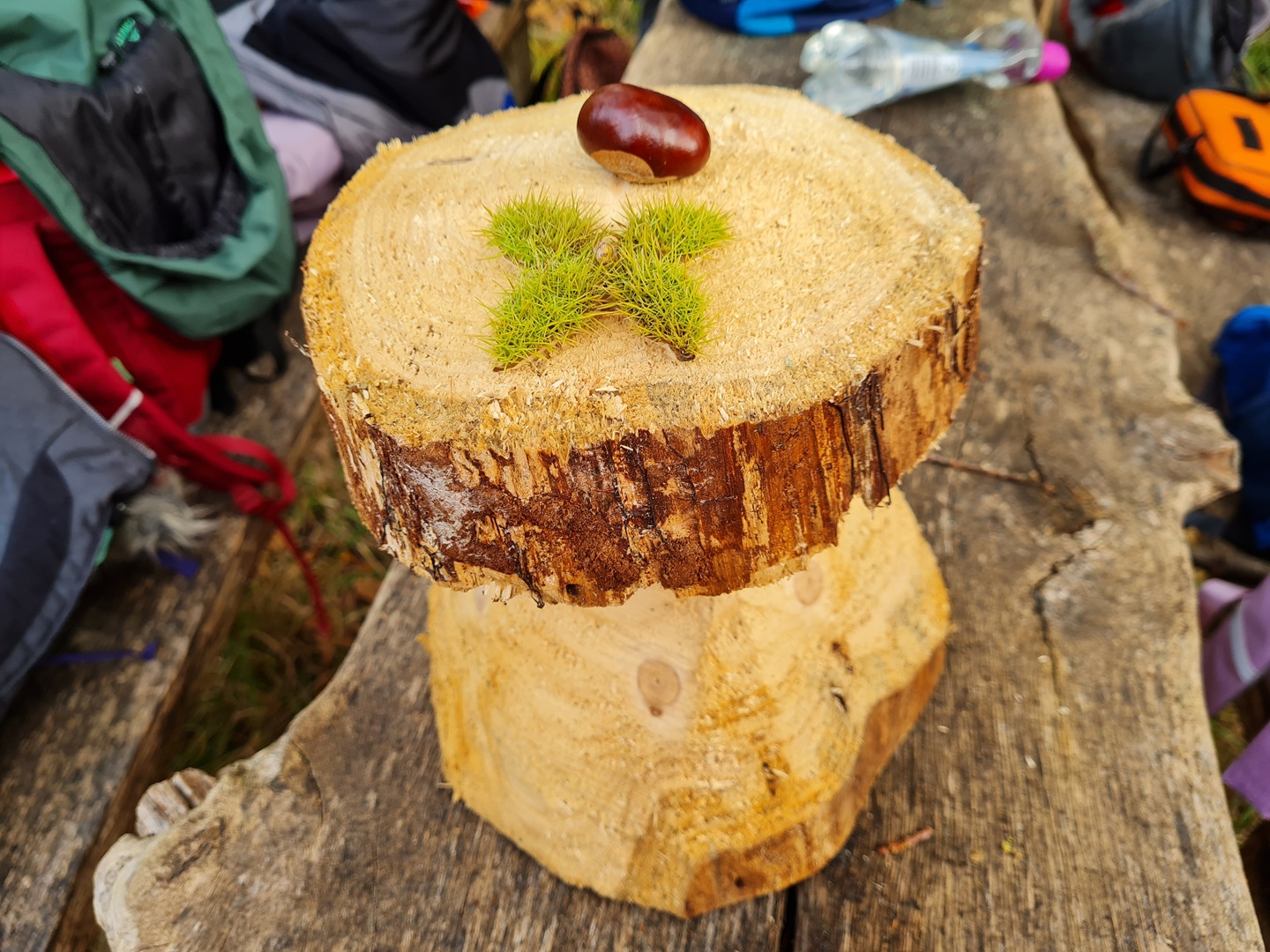 Am zweiten Tag folgten die Dritt- und Viertklässler. Auch sie frühstückten zunächst am Waldhäuschen und nutzten die Zeit für erste kleine Spiele und Erkundungen. Danach übernahmen die Viertklässler die Pflanzaktion: Auf einer vorbereiteten Fläche pflanzte jedes Kind eine Douglasie, eine Baumhasel und eine Eiche. Die Setzlinge mussten fest angedrückt werden, um gut anwachsen zu können. Da die Gruppe sehr schnell arbeitete, blieb noch Zeit, um Früchte des seltenen Speierlings zu sammeln. Die Drittklässler erkundeten währenddessen den Wald auf spielerische Weise. Bei einem Erkundungsauftrag suchten sie gezielt Dinge im Wald – etwa etwas Spitzes, Rotes oder Weiches – und stellten später staunend fest, wie vielfältig die Natur ist. Auch sie spielten das Spiel "Motte und Fledermaus" und sammelte für weitere Pflanzaktionen Esskastanien- Natürlich wurden die Aufgaben anschließend getauscht: Auch die Drittklässler pflanzten kleine Bäumchen, während die Viertklässler kreativ wurden und aus Naturmaterialien Waldtiere gestalteten. Es war spannend zu beobachten, wie unterschiedlich diese Aufgabe bewältigt wurde.