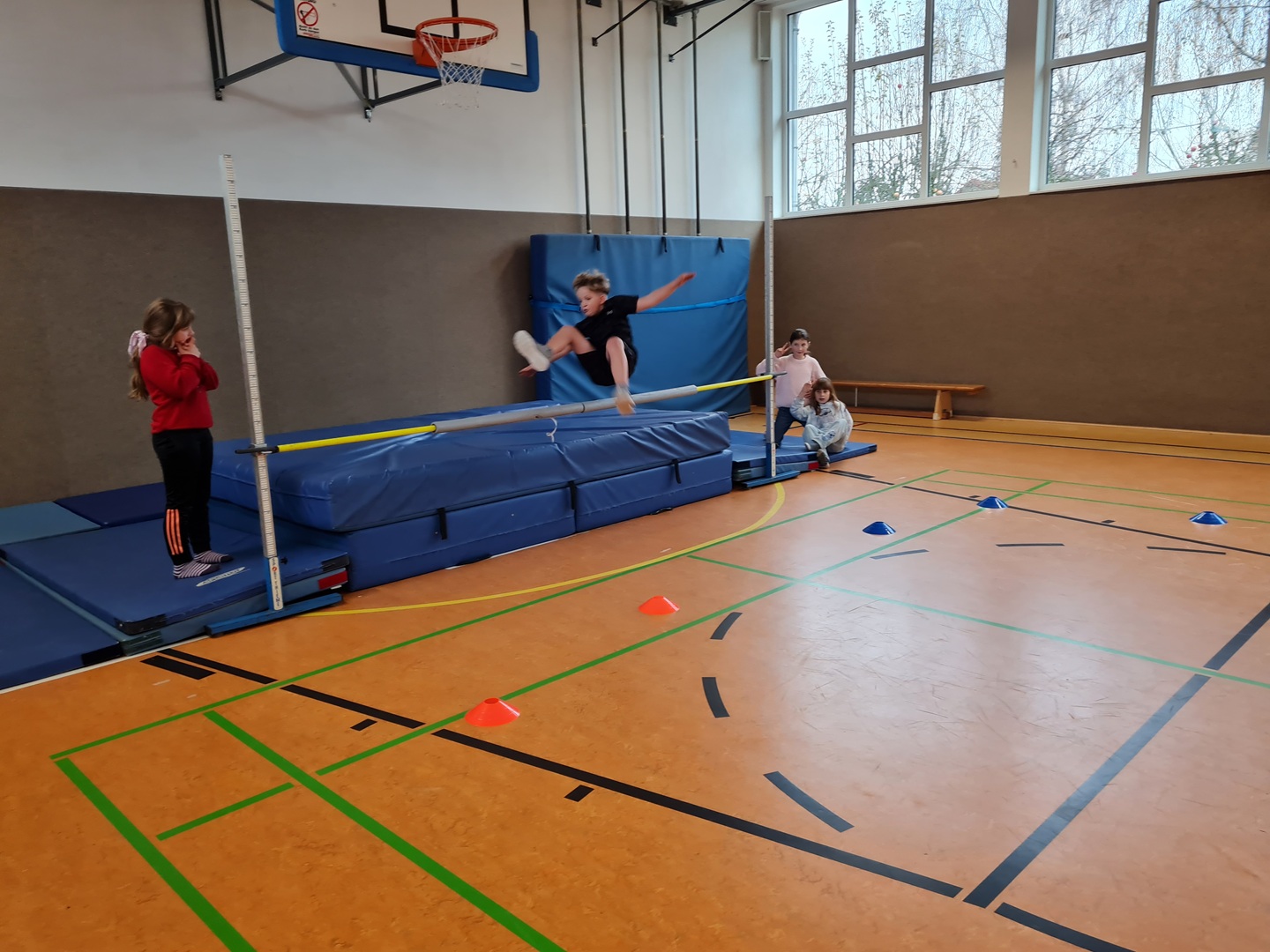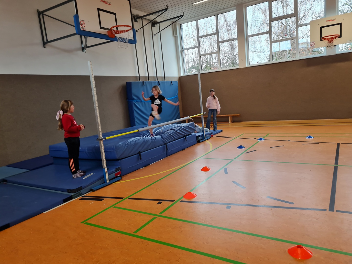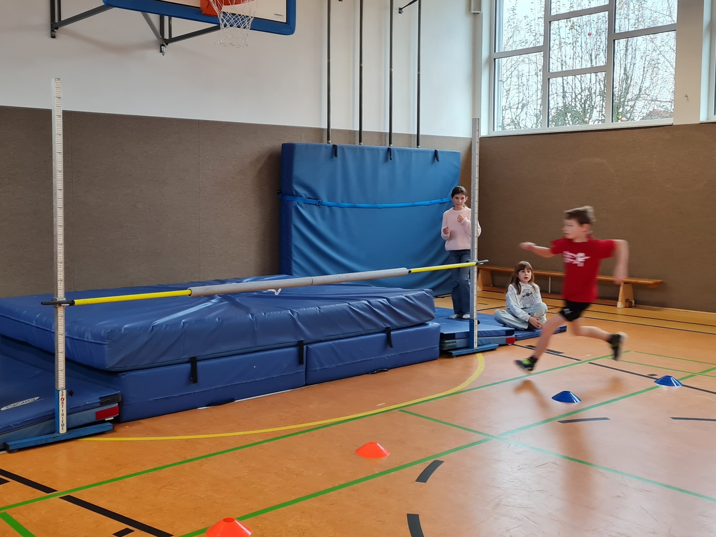 Am Dienstag, 18.11.2025 fand die Schulmeisterschaft im Hochsprung statt. In den letzten Wochen wurde dafür im Unterricht geübt. Insgesamt nahmen 38 Schülerinnen und Schüler aus den Klassen 1 bis 4 teil. Die Teilnahme an diesem Wettbewerb war freiwillig. Der Wettkampf verlief spannend und war von einer positiven, motivierenden Atmosphäre geprägt. Die Schülerinnen und Schüler zeigten Fairness, gegenseitige Unterstützung und sportlichen Ehrgeiz. Mehrere Teilnehmende stellten persönliche Bestleistungen auf. Die Leistungskurve variiert je nach Klasse und individuellem Training, doch der Gesamteindruck war von fortschrittlicher Technik, guter Koordination und zunehmender Sprungkraft geprägt.