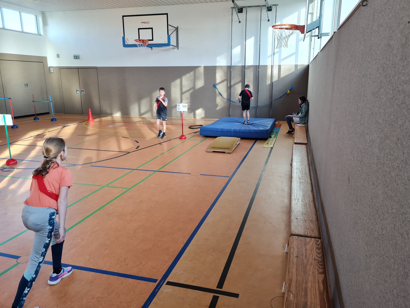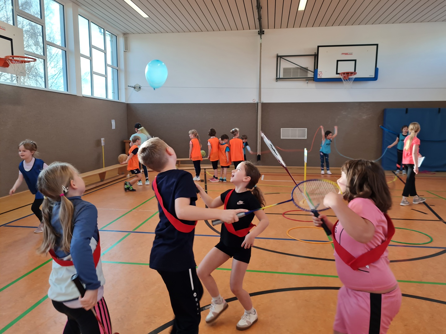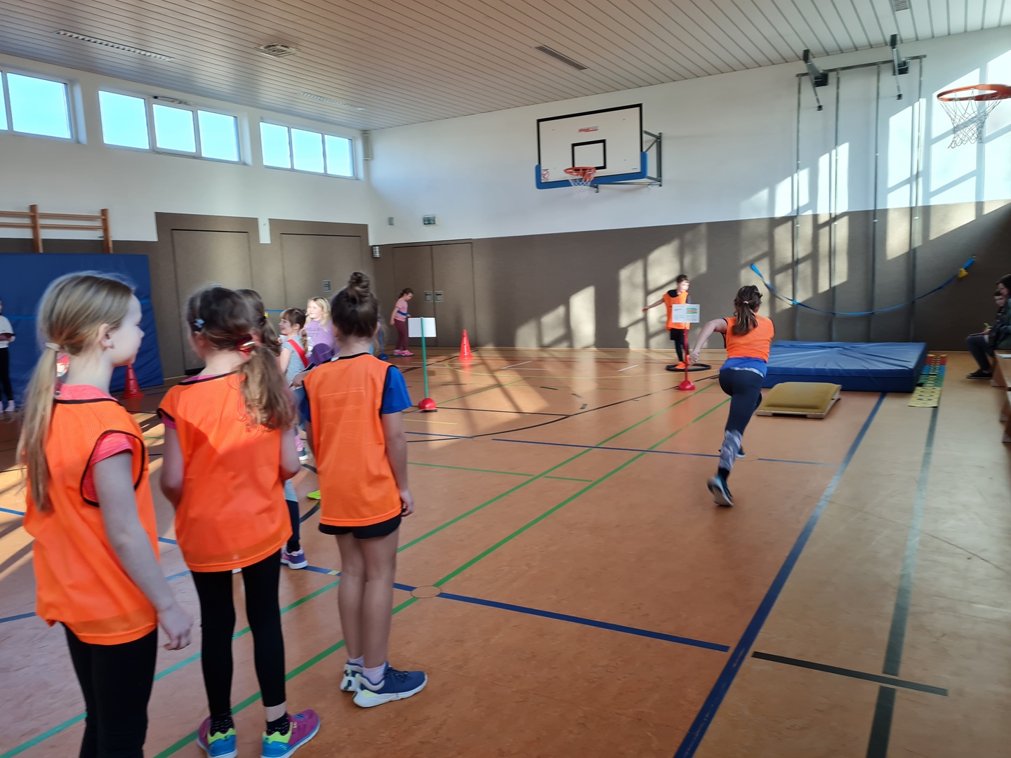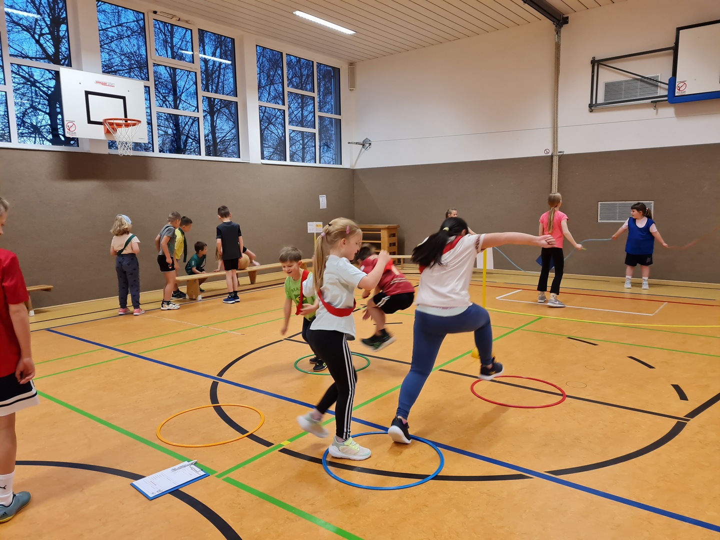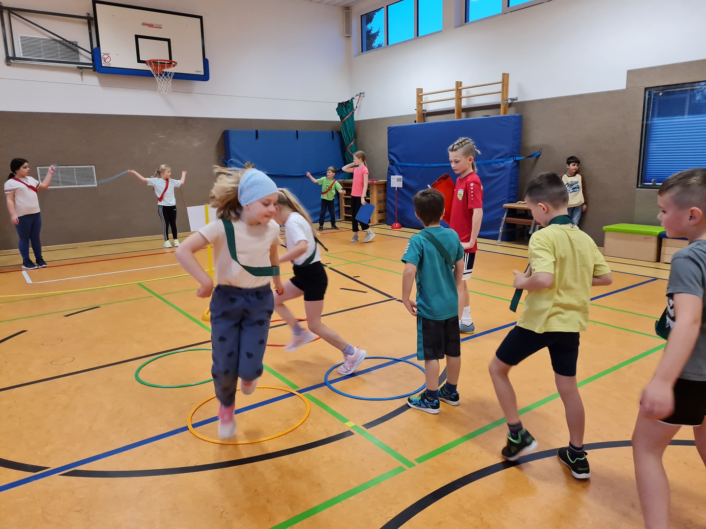 An insgesamt fünf Stationen standen Teamfähigkeit und Gemeinschaftsgefühl im Mittelpunkt. Die Kinder konnten sich an den Stationen Hockwenden, Seil-Schwingen, Weitsprung-Staffel, Teppichfliesen-Staffel und dem Luftballon-Spiel ausprobieren. Jeder Schüler sammelte entsprechend seiner individuellen Möglichkeiten und Fähigkeiten Punkte für sein Team, sodass die Übungen passend und motivierend ausgewählt waren. Es stand heute der Spaß an der Bewegung im Vordergrund.