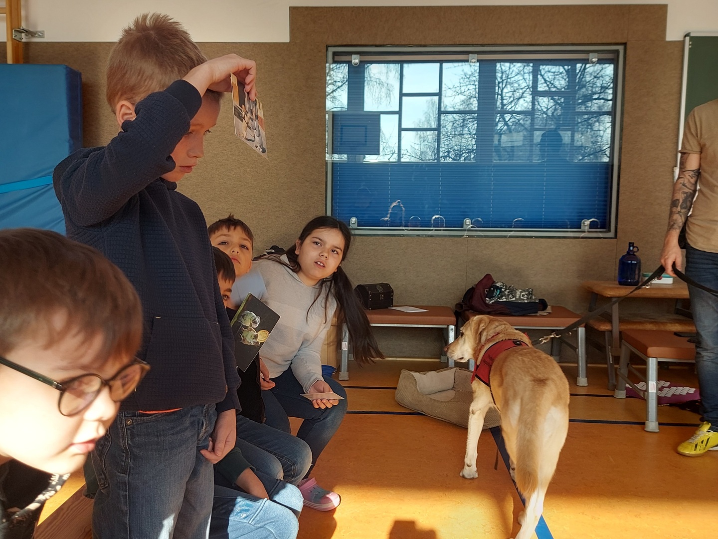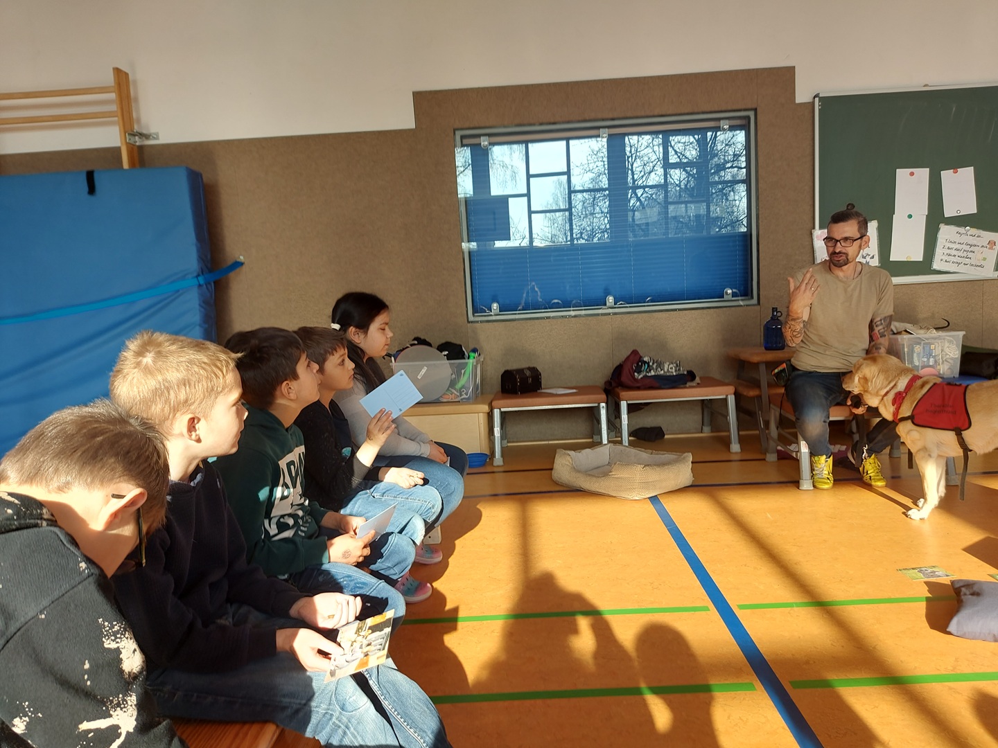 Am 19.03.26 war es auch für die Klasse 1/2a soweit. Wir erwarteten schon voller Vorfreude einen besonderen Besuch: Göran und seine Hündin Auri kamen zu uns für ein gemeinsames hundegestütztes Teamtraining! Zur Begrüßung gab es erst einmal eine große Überraschung: Göran brachte uns mit einer lustigen Clownshow zum Lachen. Das Eis war schnell gebrochen und alle lachten. Danach folgte die Kennlernrunde mit Auri. Jedes Kind stellte sich vor, Auri vorsichtig streicheln, ihr Leckerlis geben oder sogar kleine Tricks mit ihr ausprobieren.