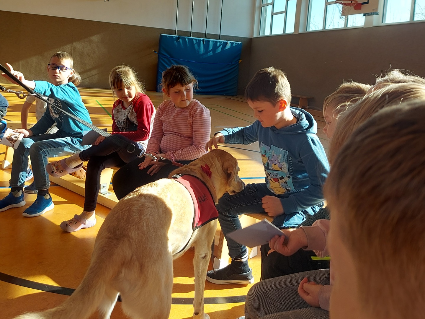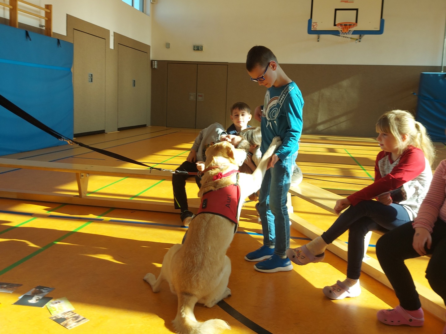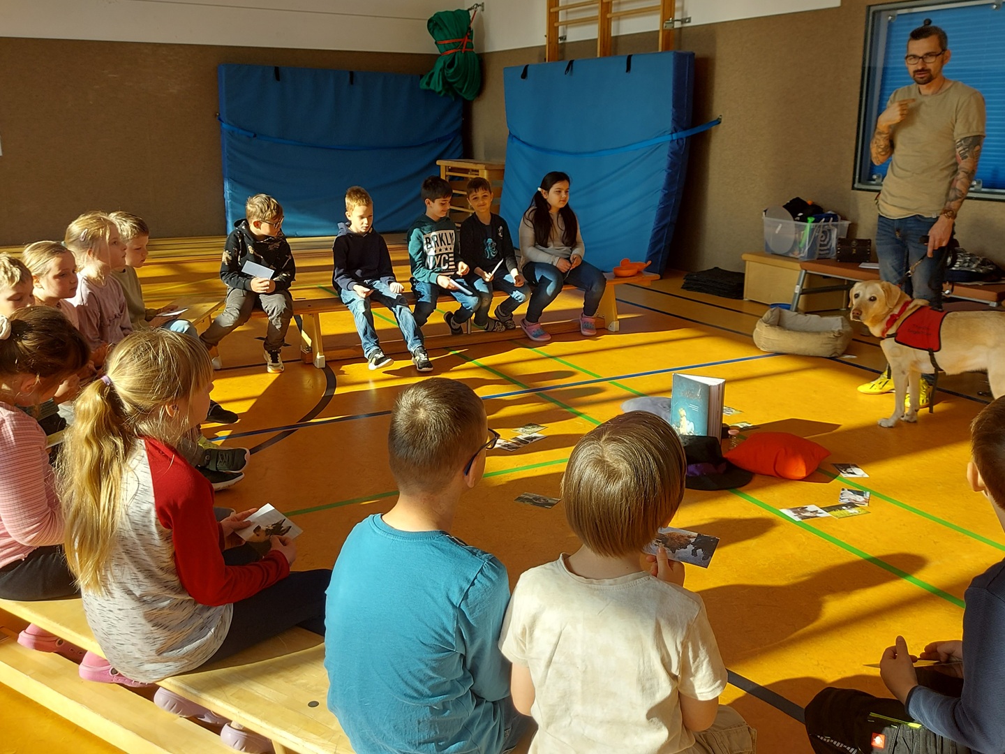 Anschließend standen verschiedene Teamtrainingsspiele auf dem Programm, bei denen Zusammenhalt, gegenseitige Unterstützung und gute Absprachen gefragt waren. Bei einer Kissen Challenge - einem Spiel im Kreis mit roten und grauen Kissen bewiesen wir, wie gut wir als Team funktionieren. Nach einer wohlverdienten Frühstücks- und „Flitzepause“ in der Turnhalle sowie einer kurzen Entspannungsübung durften die Kinder die nächsten Aktivitäten selbst wählen. Die Entscheidung fiel auf die „Leckerlirutsche“ und die „Hundepost“. Auri war überall mit vollem Eifer dabei und holte sich am Ende ihre wohlverdiente Belohnung ab. Da Hunde sehr empfindliche Ohren haben, lernten wir etwas ganz Besonderes – das „stille Anfeuern“ mit Gesten. Das war zwar ungewohnt, aber es klappte schon gut und sorgte für eine konzentrierte Atmosphäre. Es war ein spannender und fröhlicher Vormittag, an dem wir viel gelacht und noch mehr über den respektvollen Umgang mit Hunden gelernt haben. Ein herzliches Dankeschön an Göran und Auri für dieses unvergessliche Erlebnis auch in diesem Schuljahr!